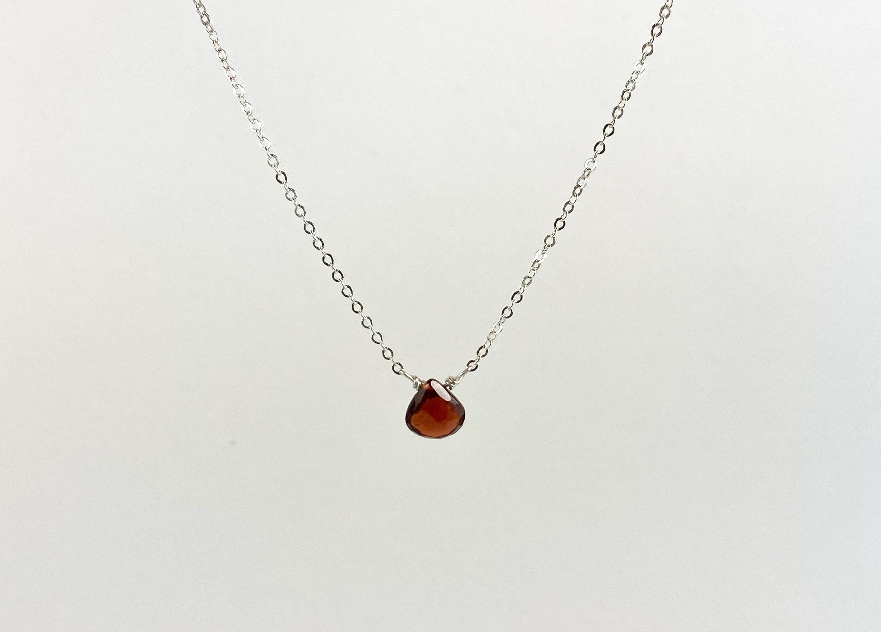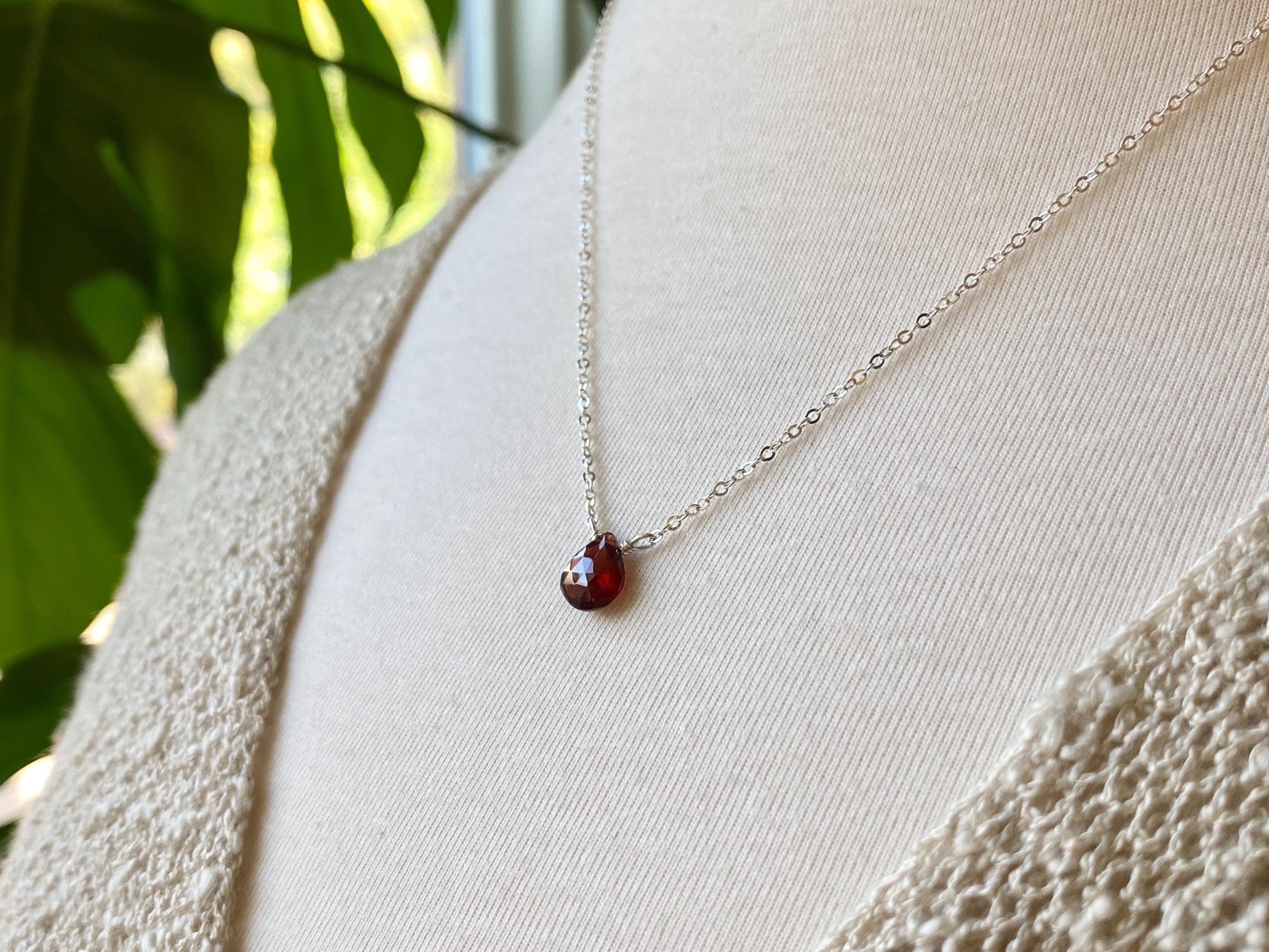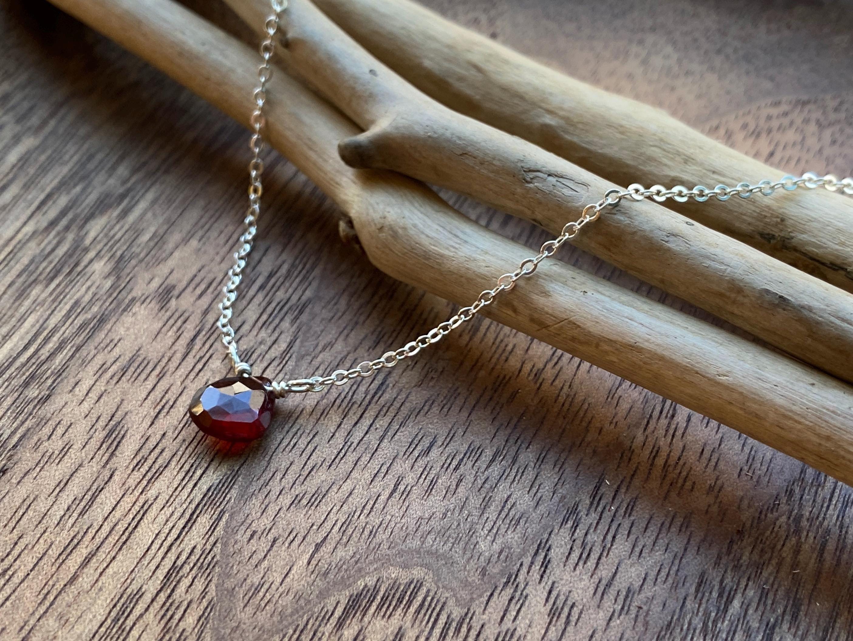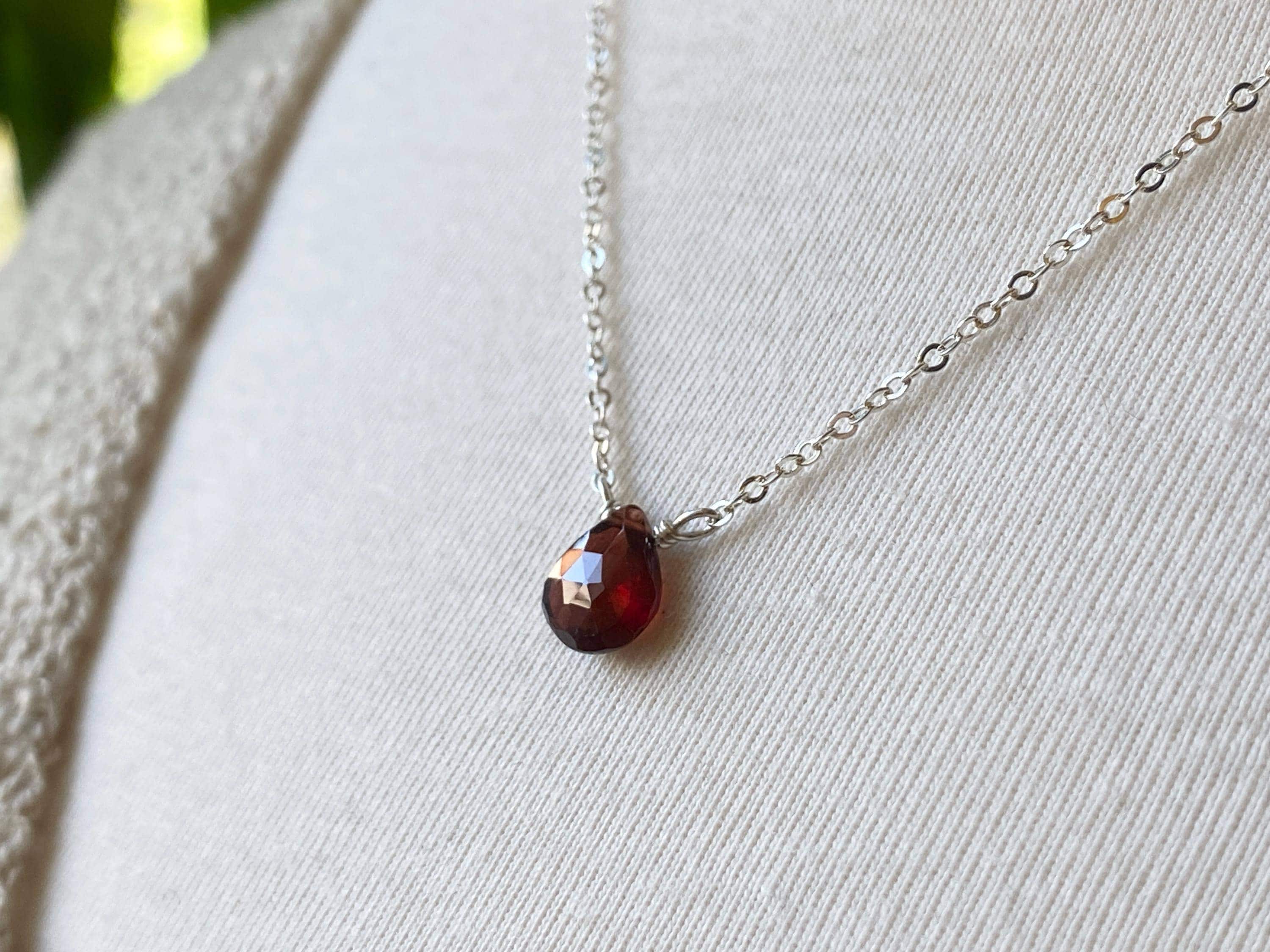 A delicate Sterling Silver chain with a dark red natural gemstone. The faceted rose cut garnet stone is dainty and elegant. Garnet is January‘s birthstone.