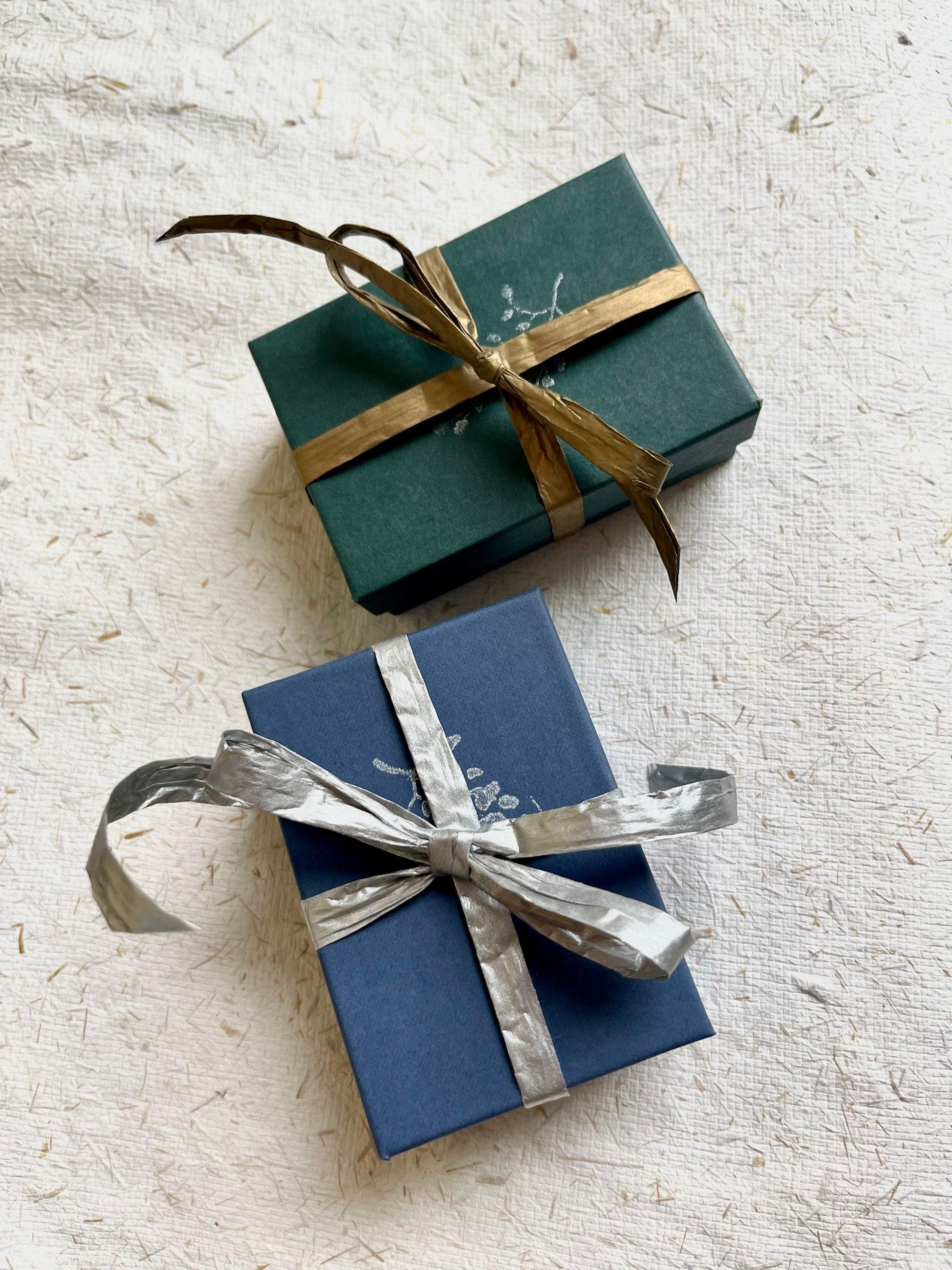 It will come in a blue or green hand printed box tied with ribbon & ready to gift or keep.