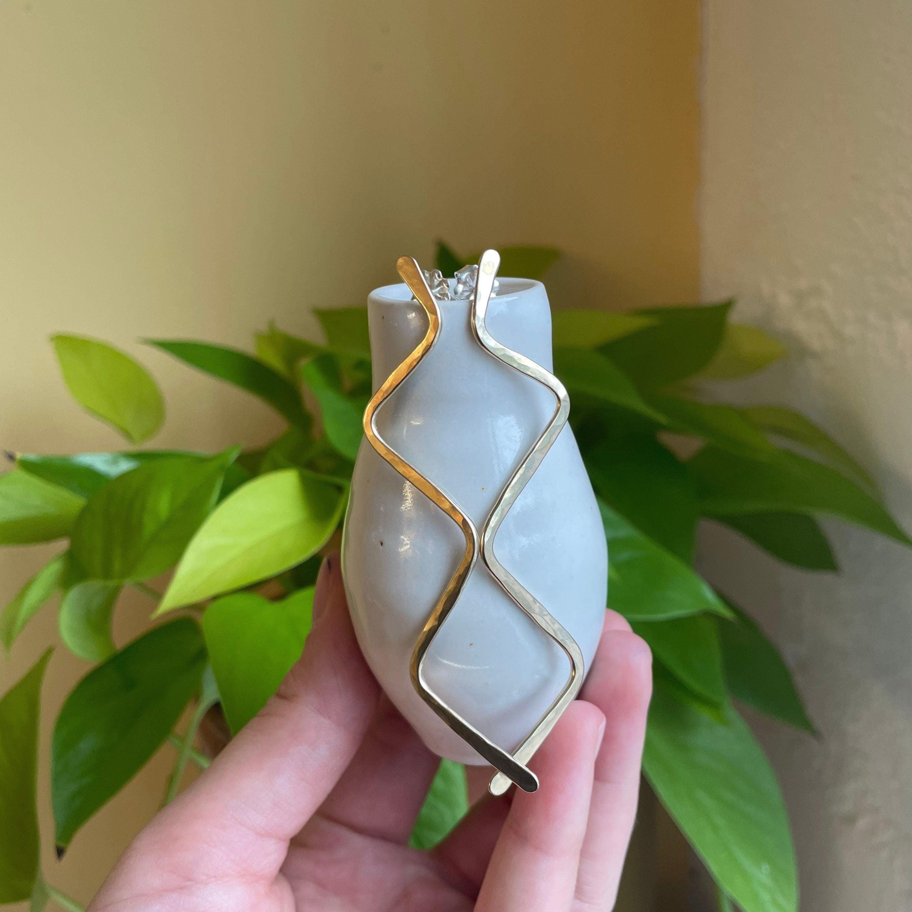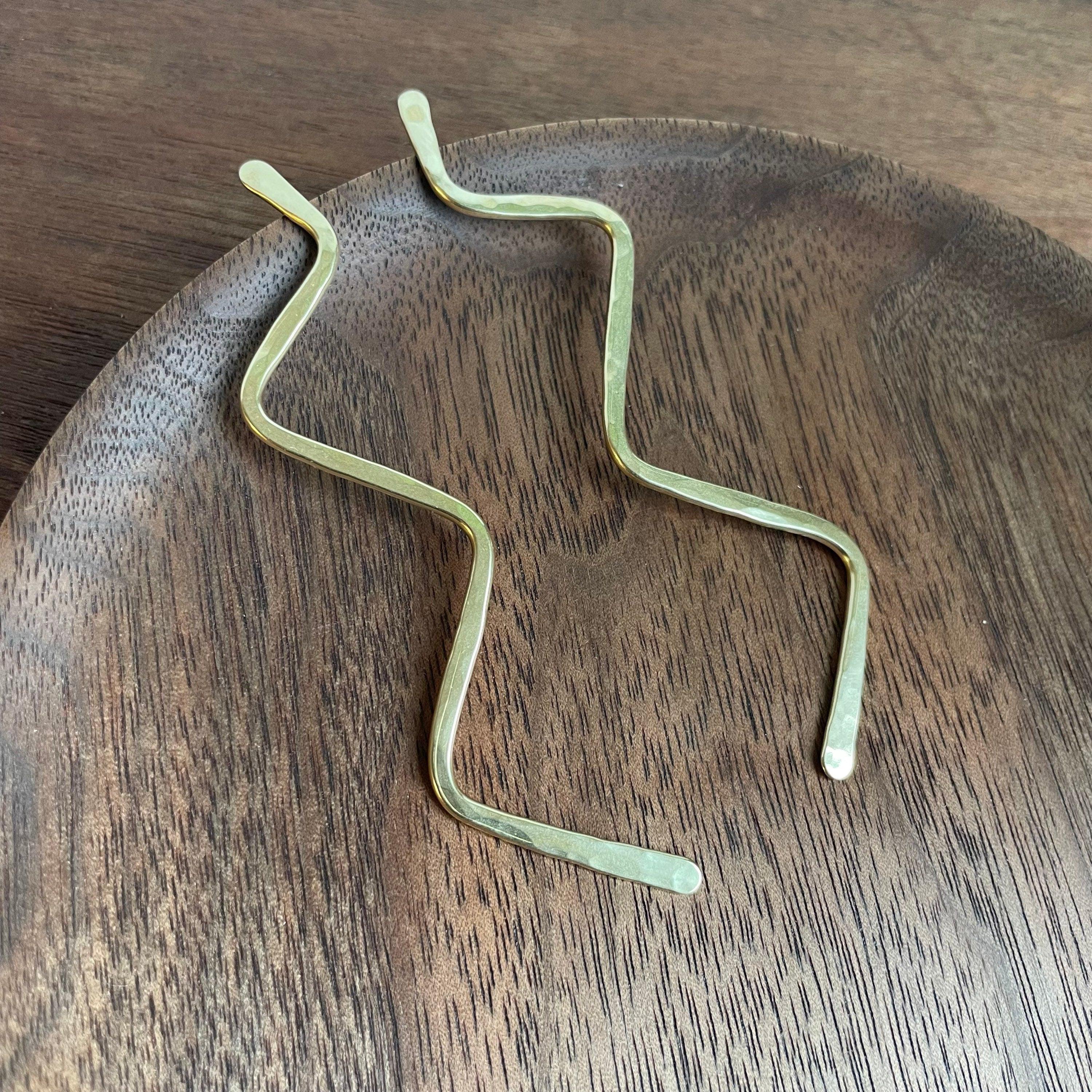 The solid brass zig zag are soldered to sterling silver posts with sterling silver backs. They are uniquely handmade and may vary slightly. Your pair will be very similar to those shown but unique and made just for you. They are about 3 1/2" long.