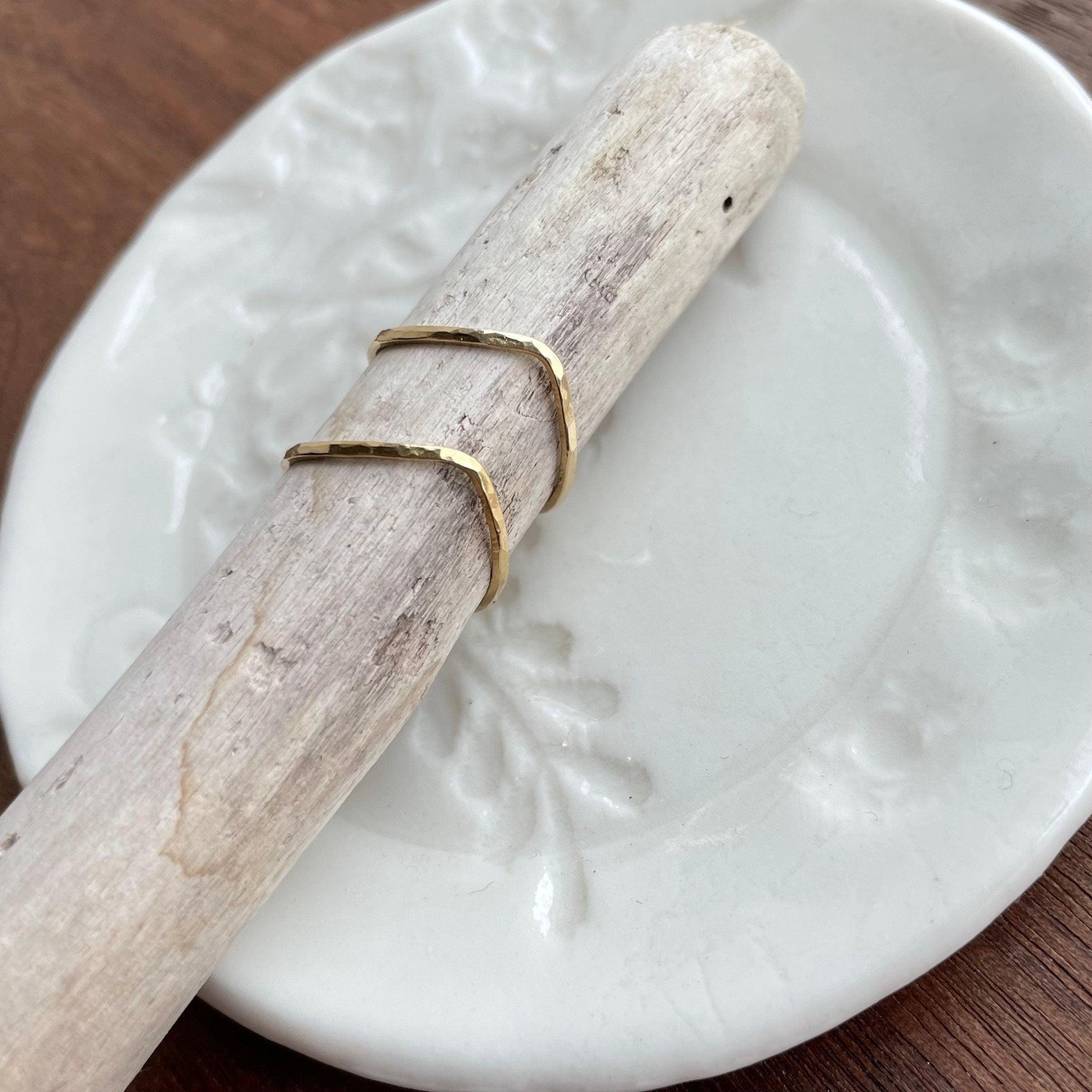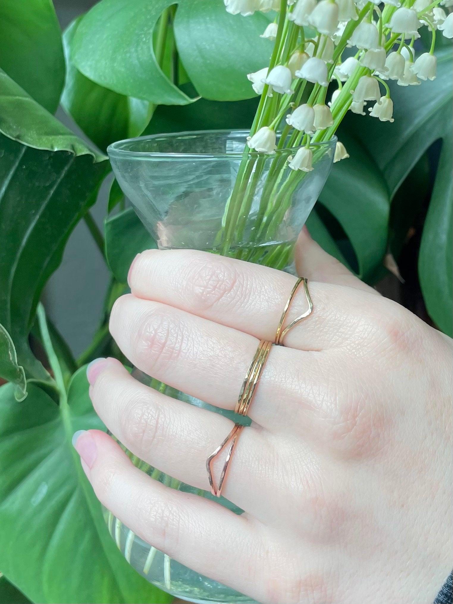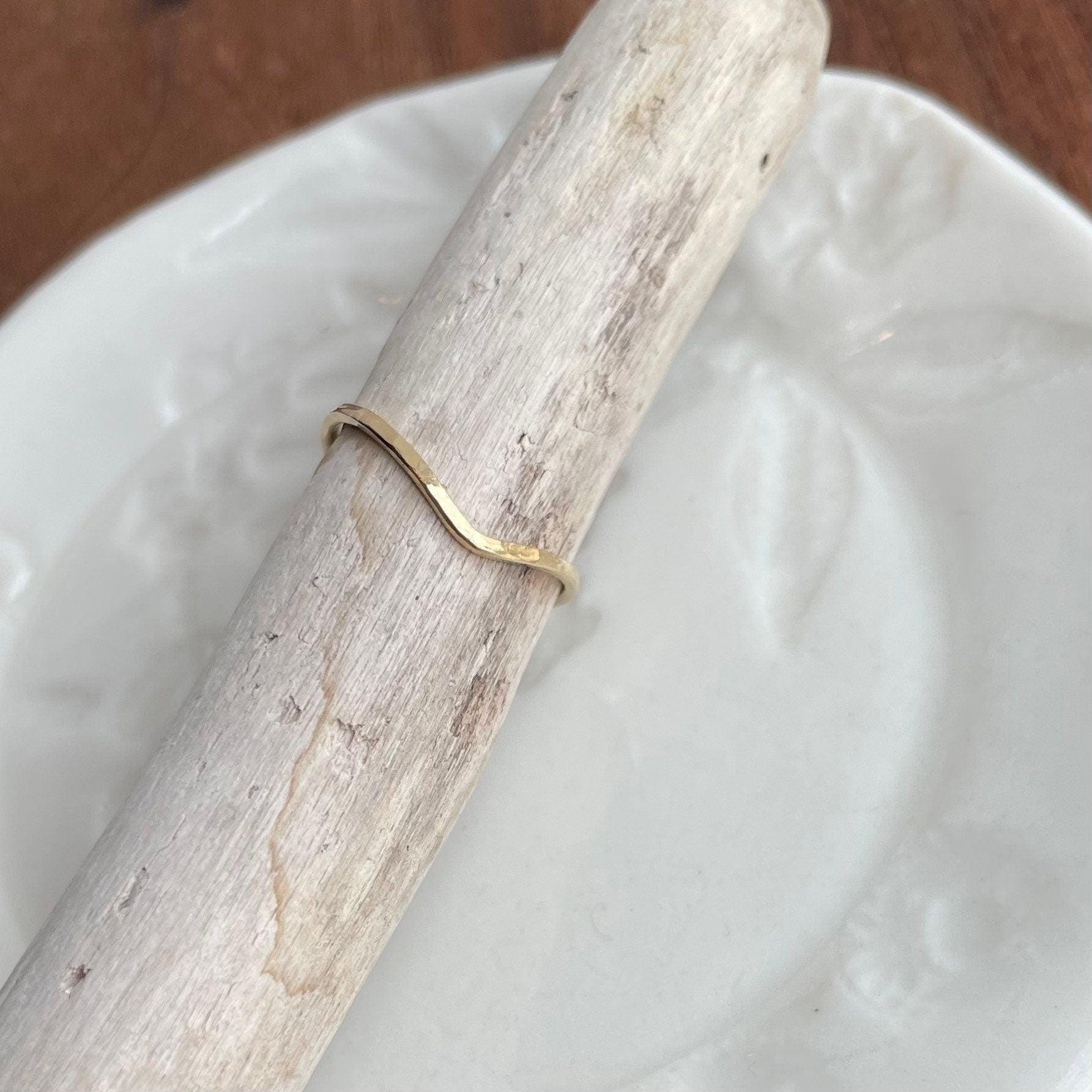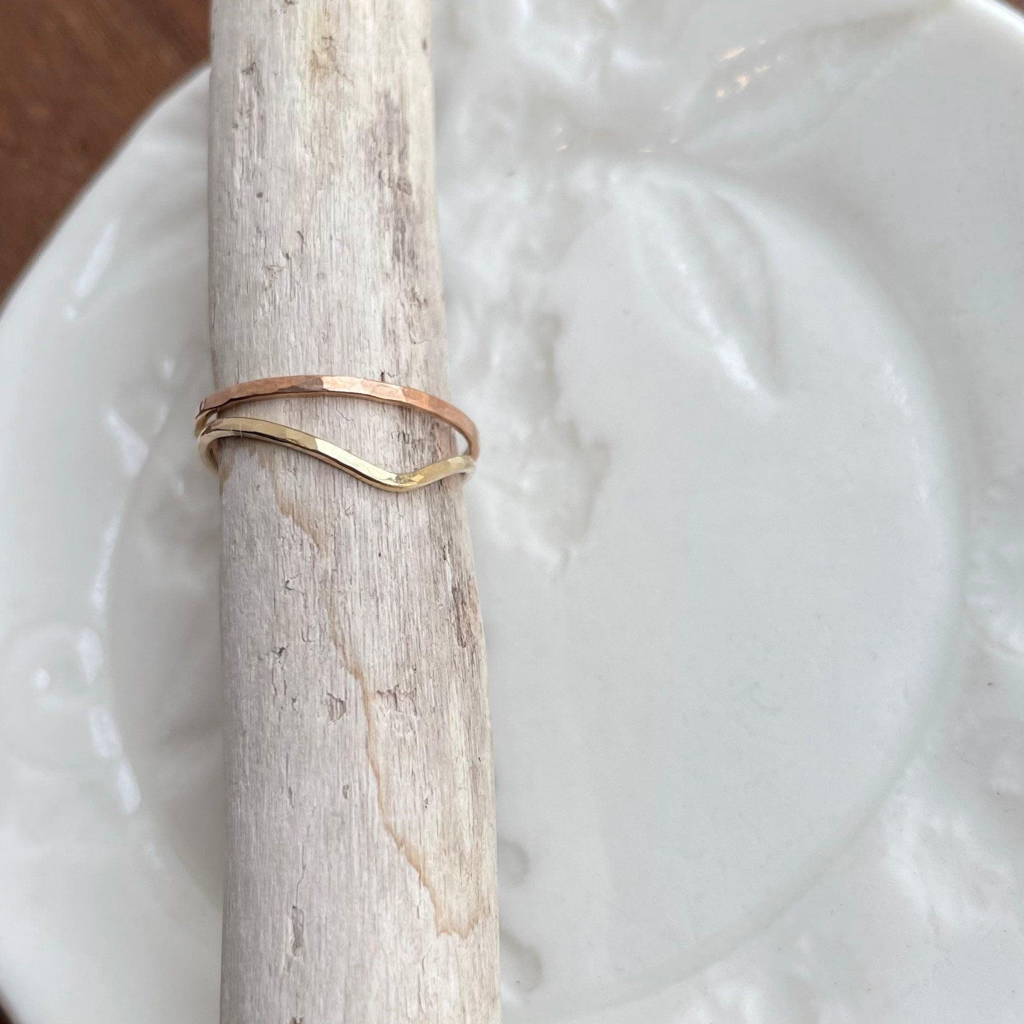 Thin hammered 14K gold-fill ring. They are simple and elegant with a hammered texture that creates soft facets and a bit of sparkle. Great if you‘re looking for a subtle and minimalist ring. You will receive one ring. One picture shows a rose gold ring to see the color difference between the two. The 5th picture shows stacking options, different styles, and different metals. You will only receive ONE thin gold wave band.
