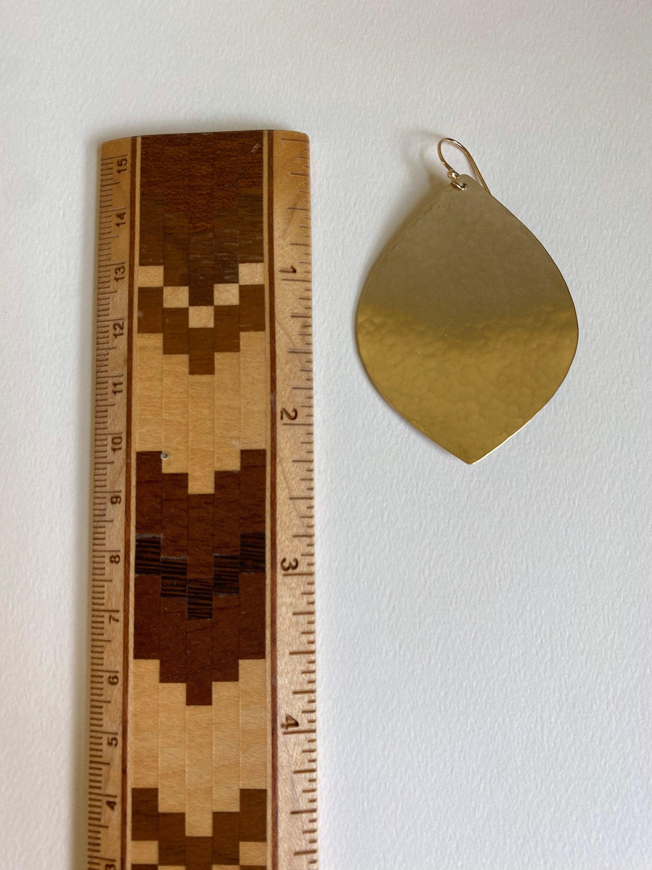 These large brass leaves dangle from 14k gold-fill hooks. Your pair may be slightly different than those shown do to their unique handmade nature. They are about 2 & 1/4 inches long including the hooks, and 1 & 1/2 inches wide.