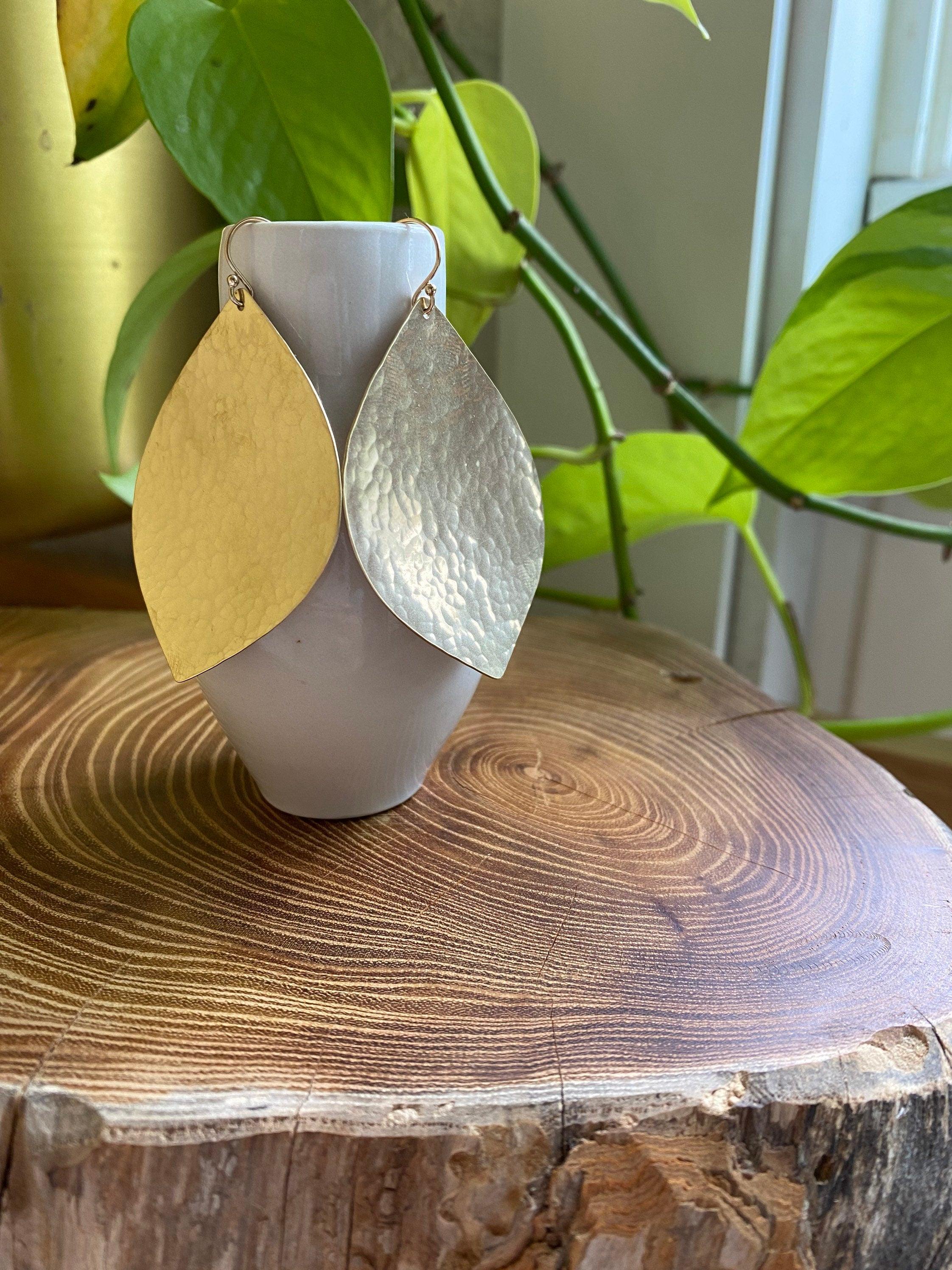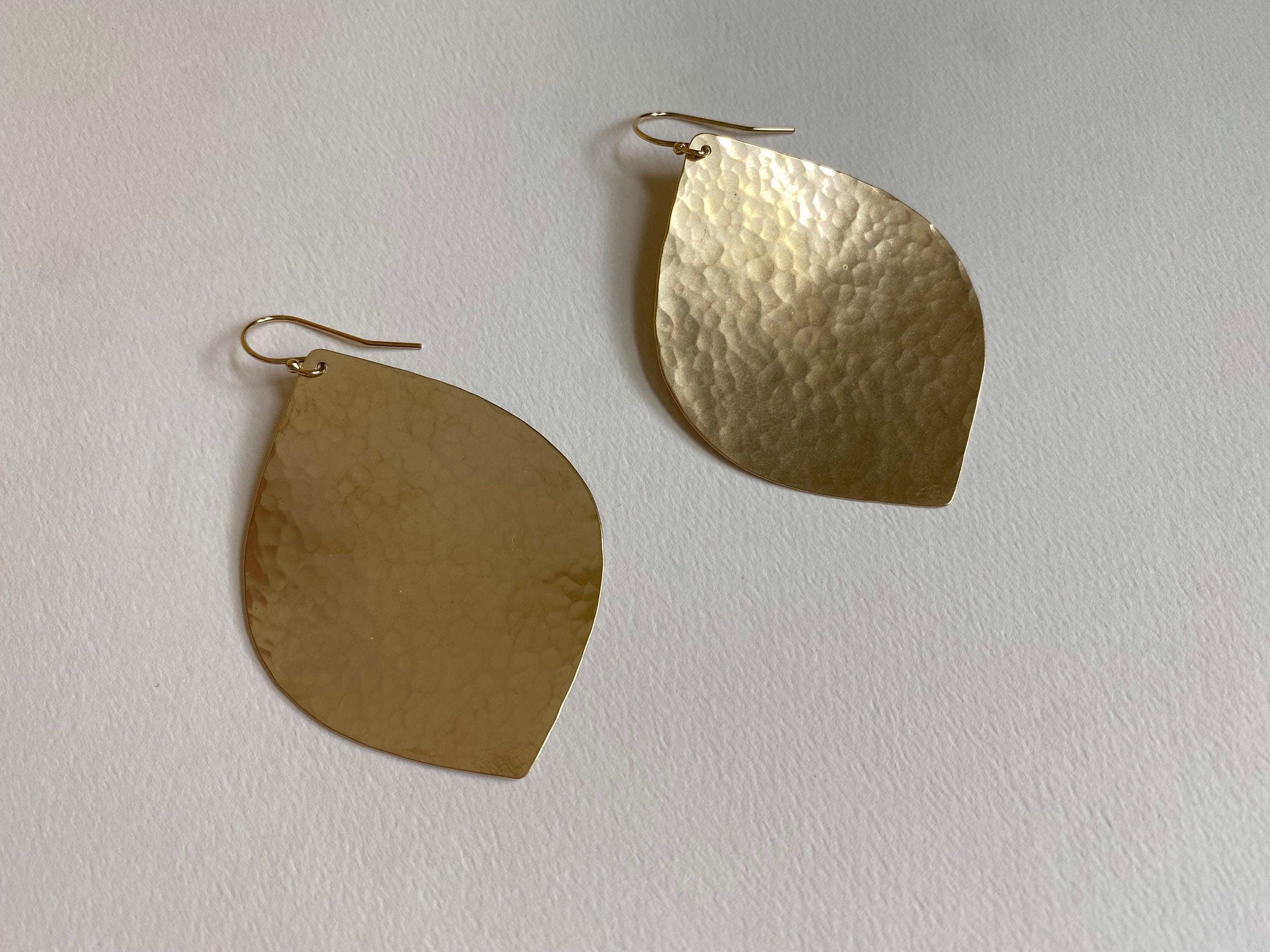 Large Brass Leaf Earrings, Petal Shaped, Marquise Jewelry