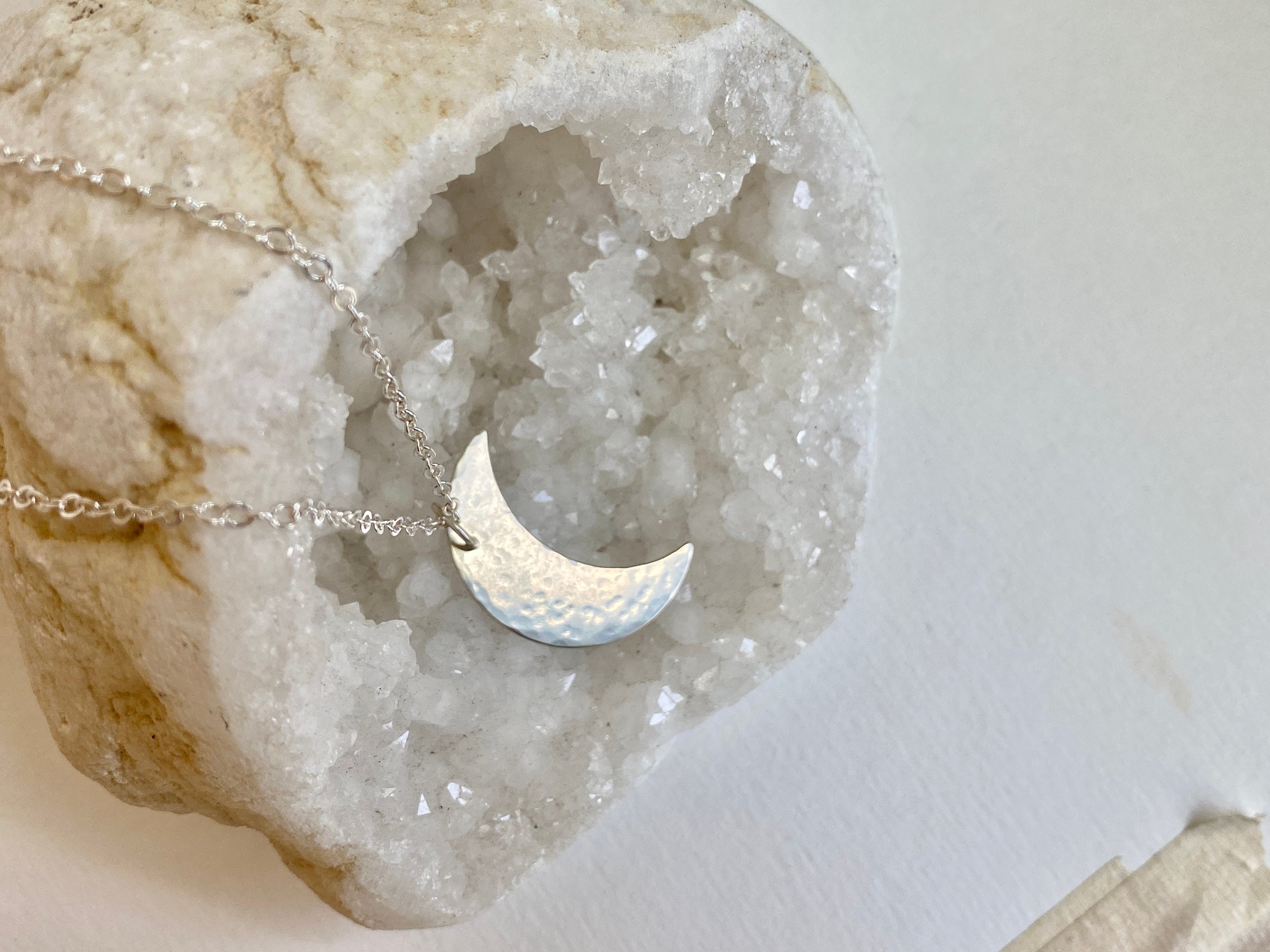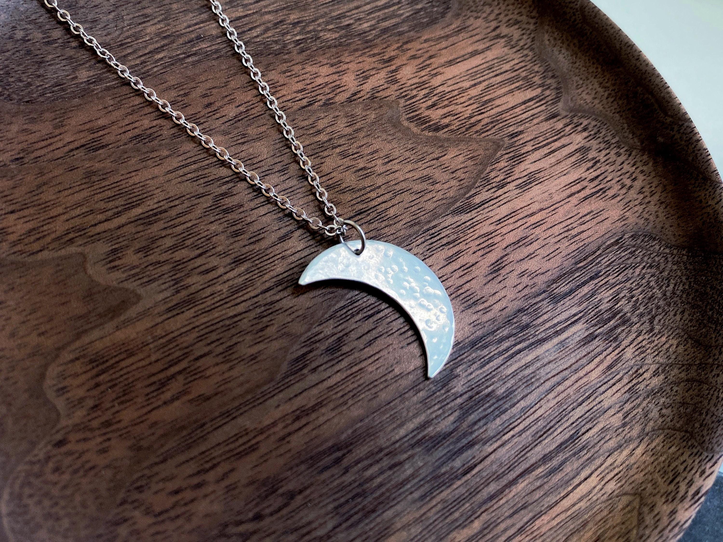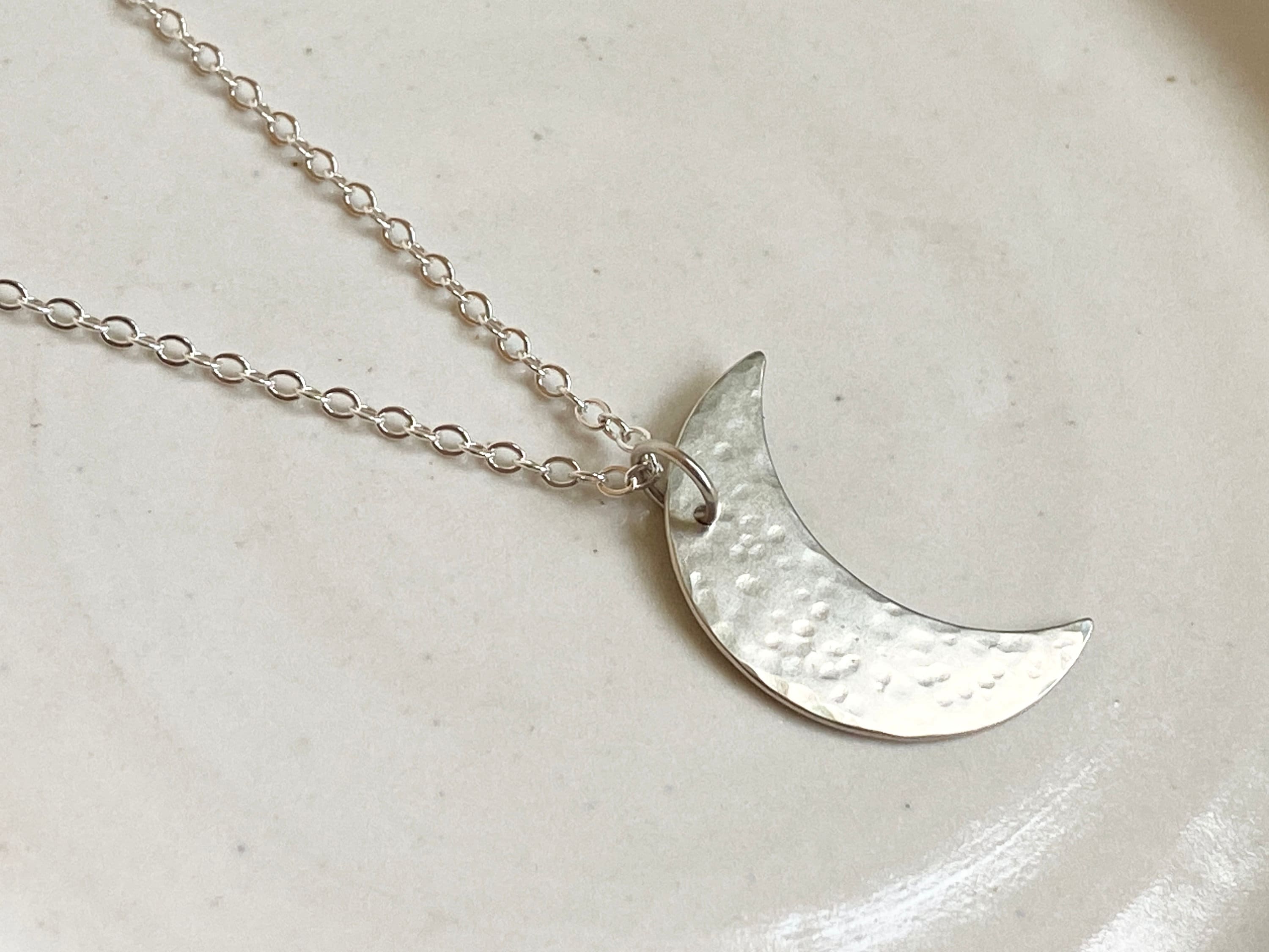 A delicate handmade moon pendant in sterling silver dangles from a soldered jump ring and sparkly sterling silver chain. Each pendant is hand cut and hammered with hammer marks inspired by crater marks. Each is handmade and unique. Chains are solid sterling silver delicate cable 18 inch length with a little lobster clasp. The moon pendant is 1 inch in size.