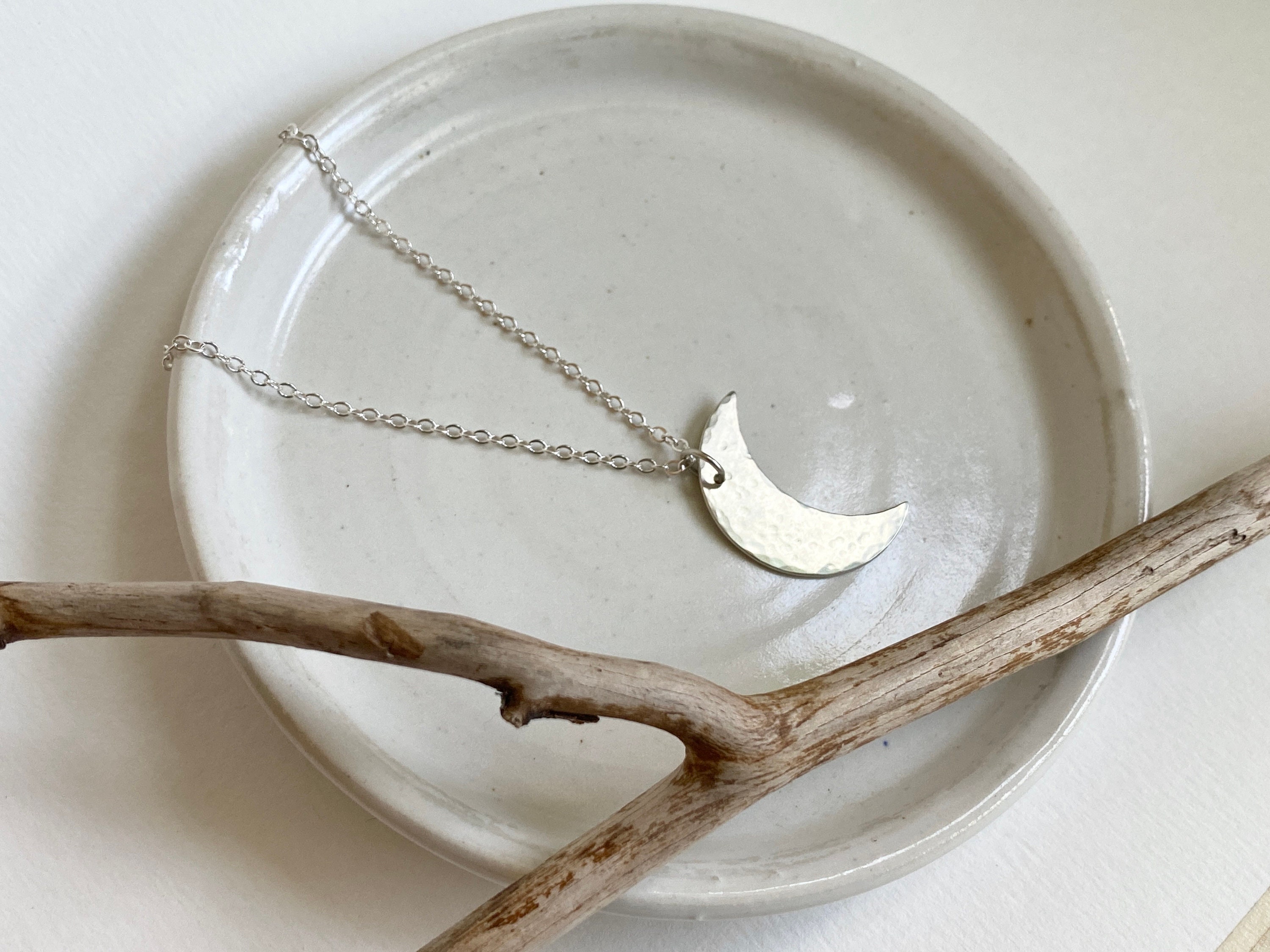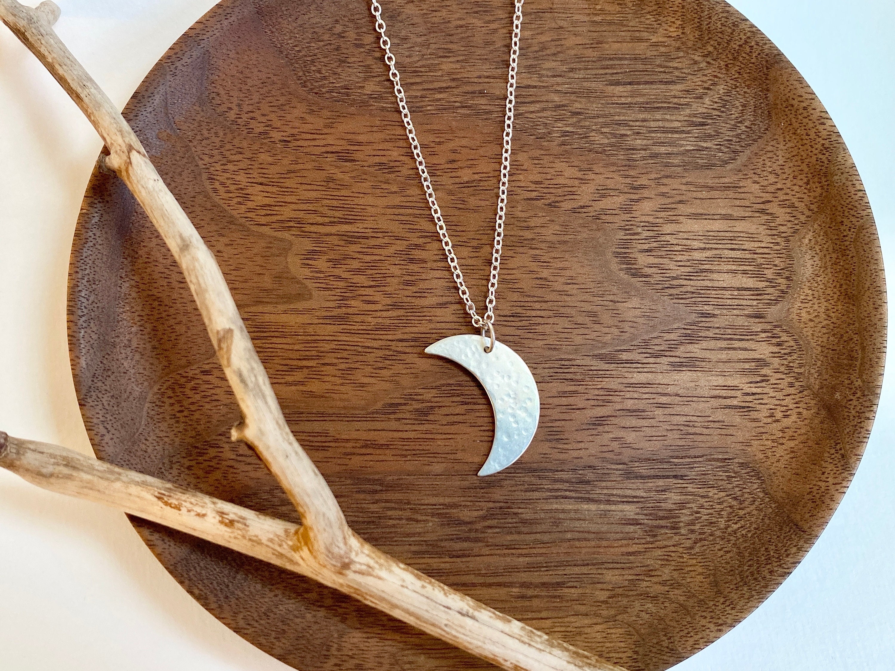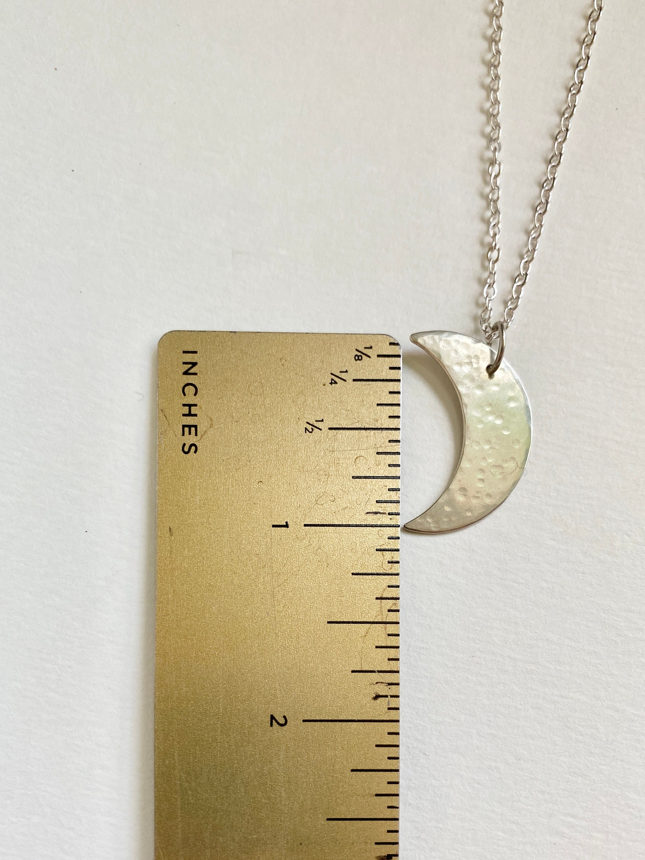 A delicate handmade moon pendant in sterling silver dangles from a soldered jump ring and sparkly sterling silver chain. Each pendant is hand cut and hammered with hammer marks inspired by crater marks. Each is handmade and unique. Chains are solid sterling silver delicate cable 18 inch length with a little lobster clasp. The moon pendant is 1 inch in size.