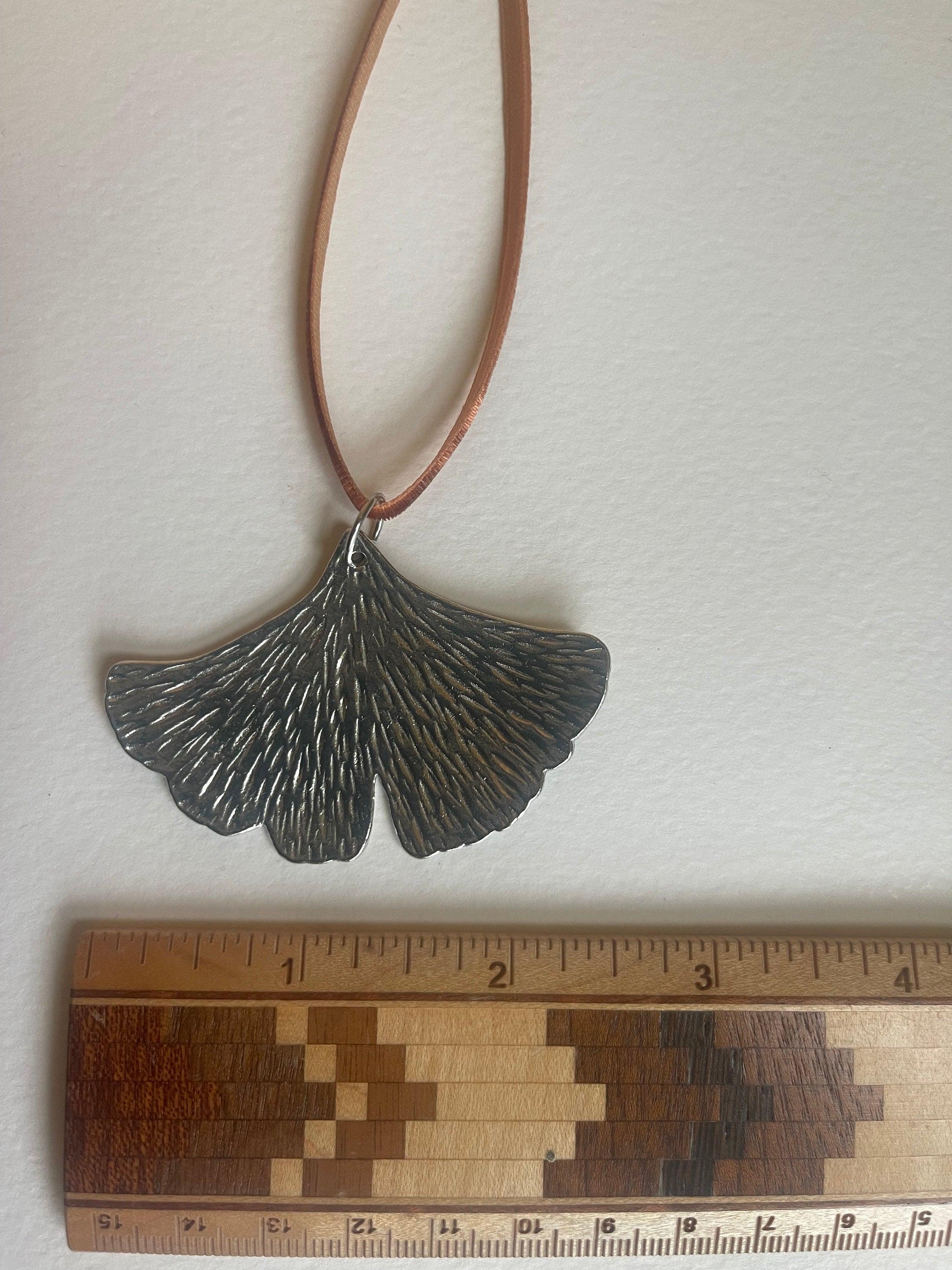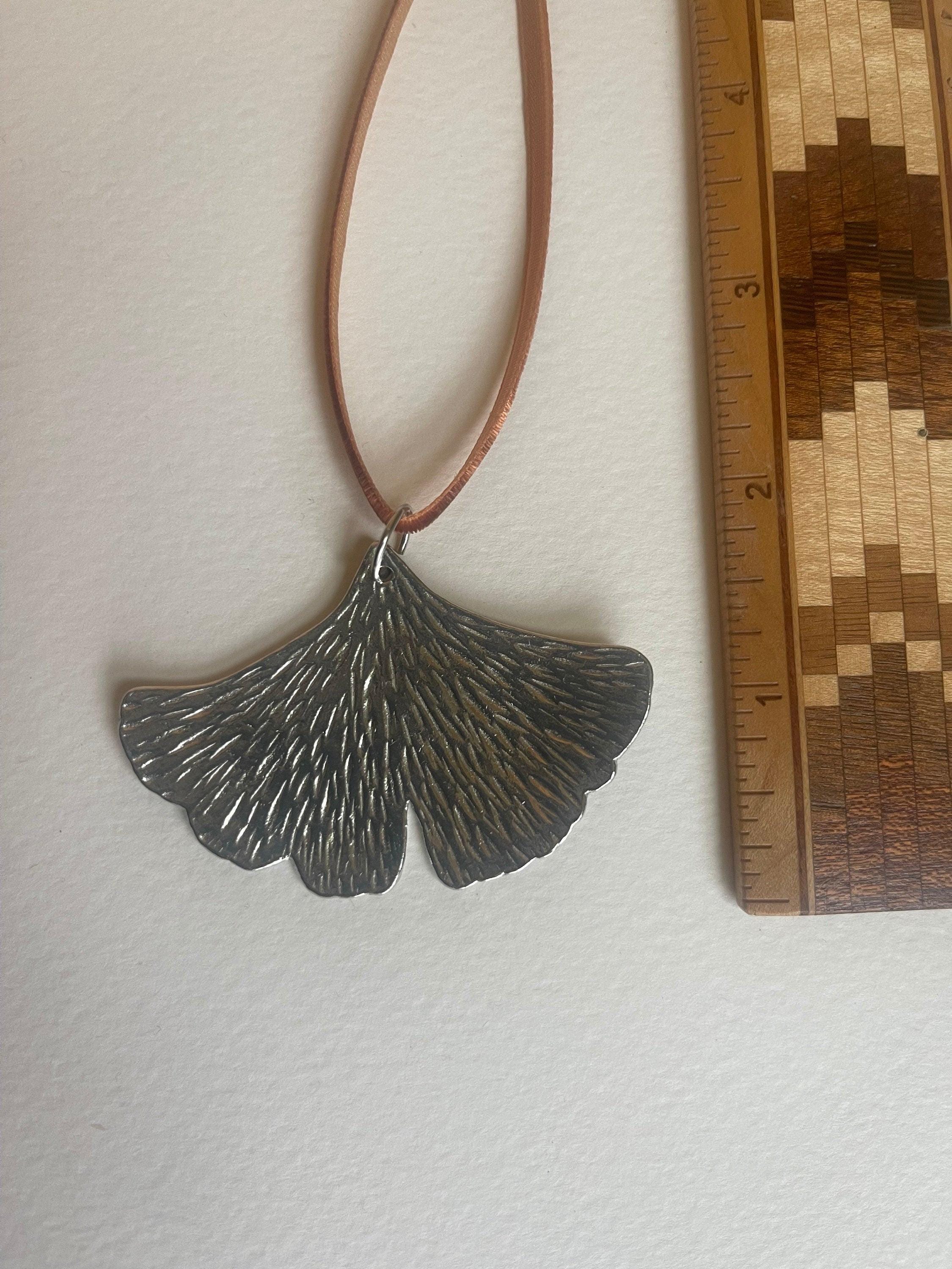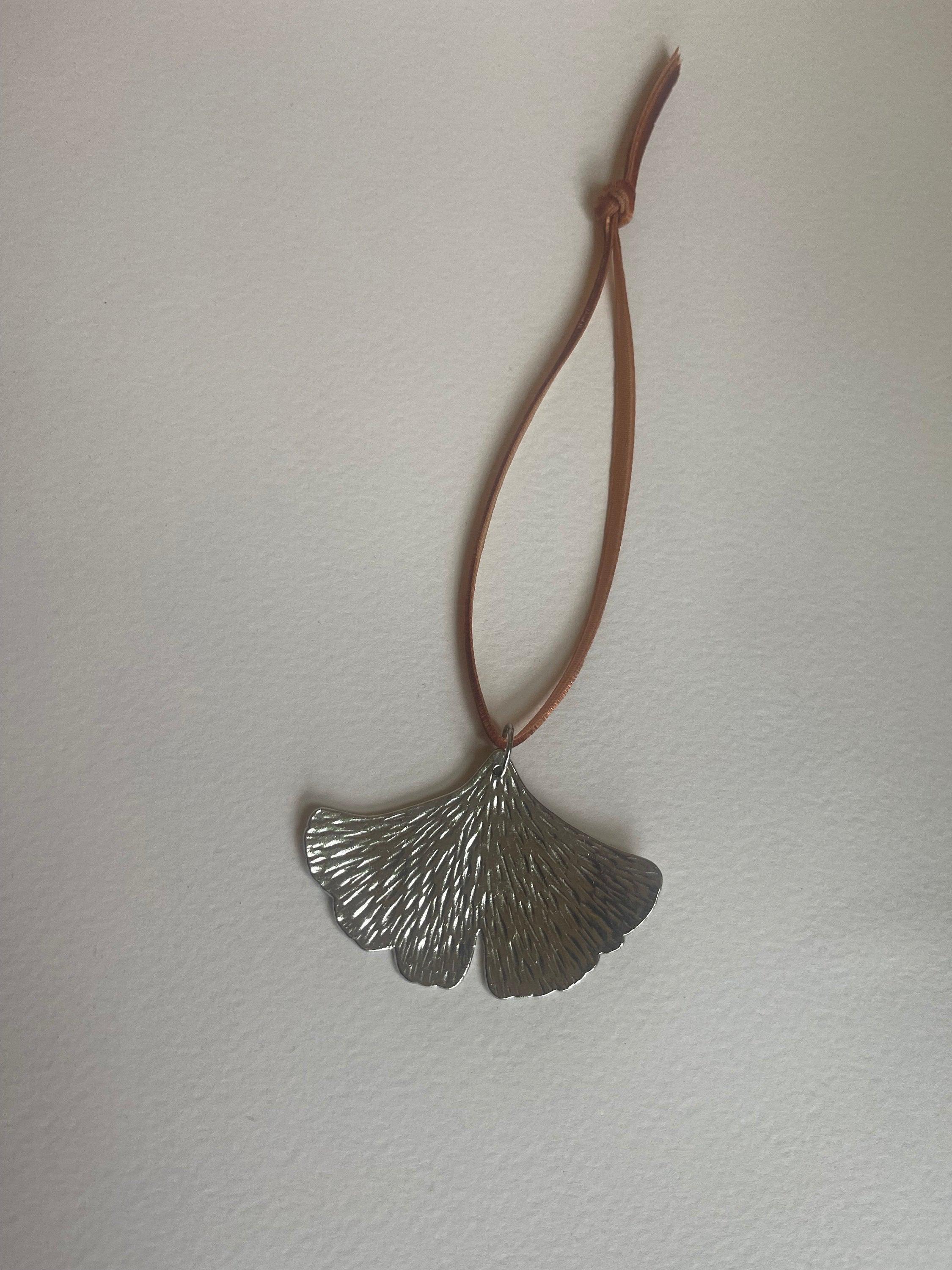 Handmade Ginko Leaf Ornament. Solid pewter with a pretty silver color and hanging from a pretty rust color velvet ribbon. Each side is textured with striated hammer marks like leaf veins.