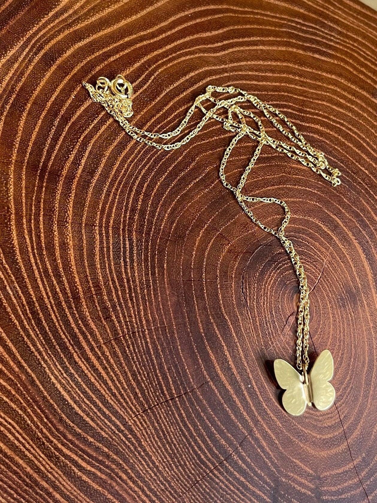 A handmade Butterfly pendant in Brass that dangles from a soldered jump ring and delicate 14k gold-fill cable chain. Each pendant is hand cut and hammered with sparkly linear hammer marks. Each is handmade and unique. Chains are delicate gold fill rope chain at 18inch length with a spring-ring clasp.