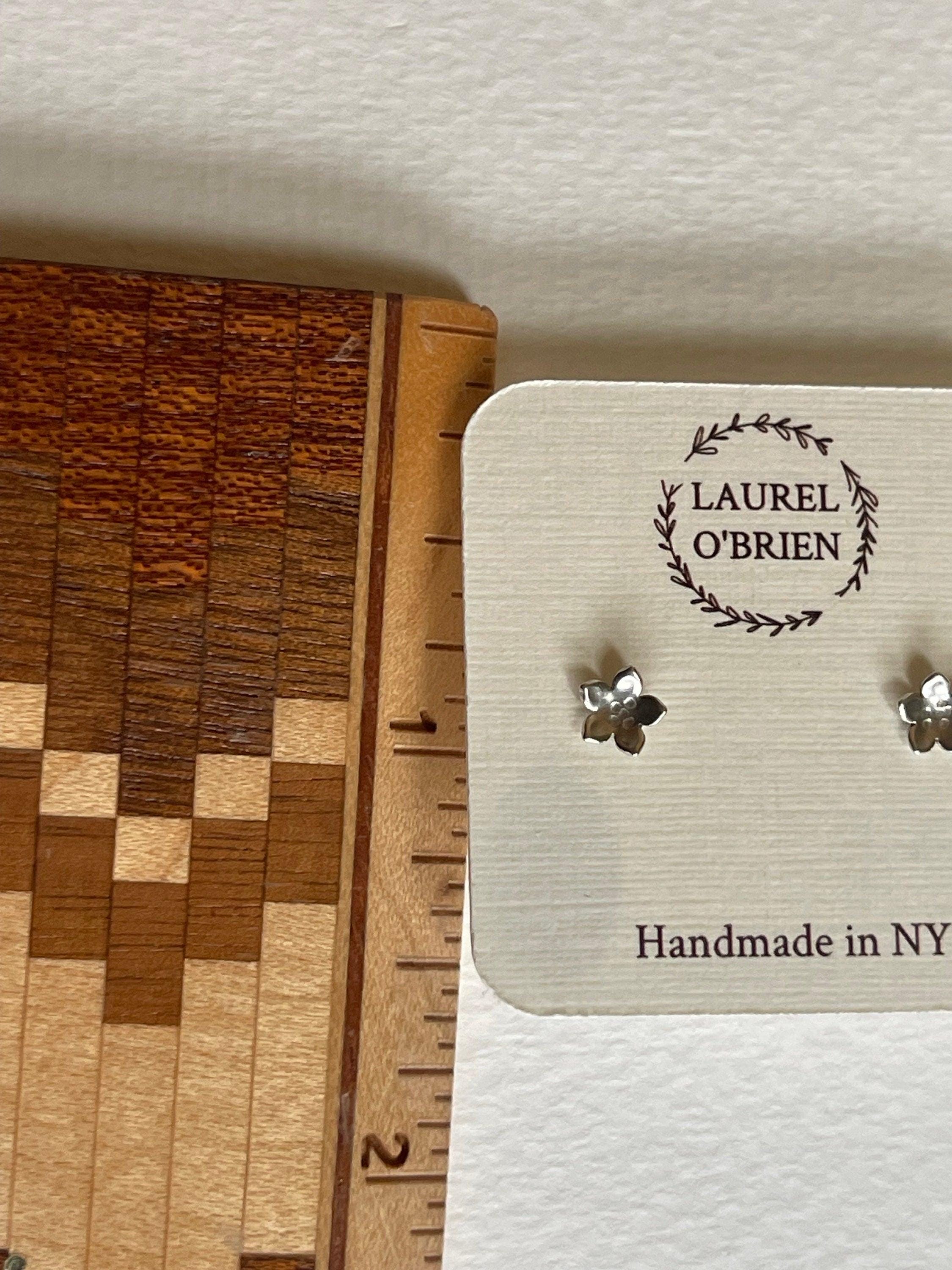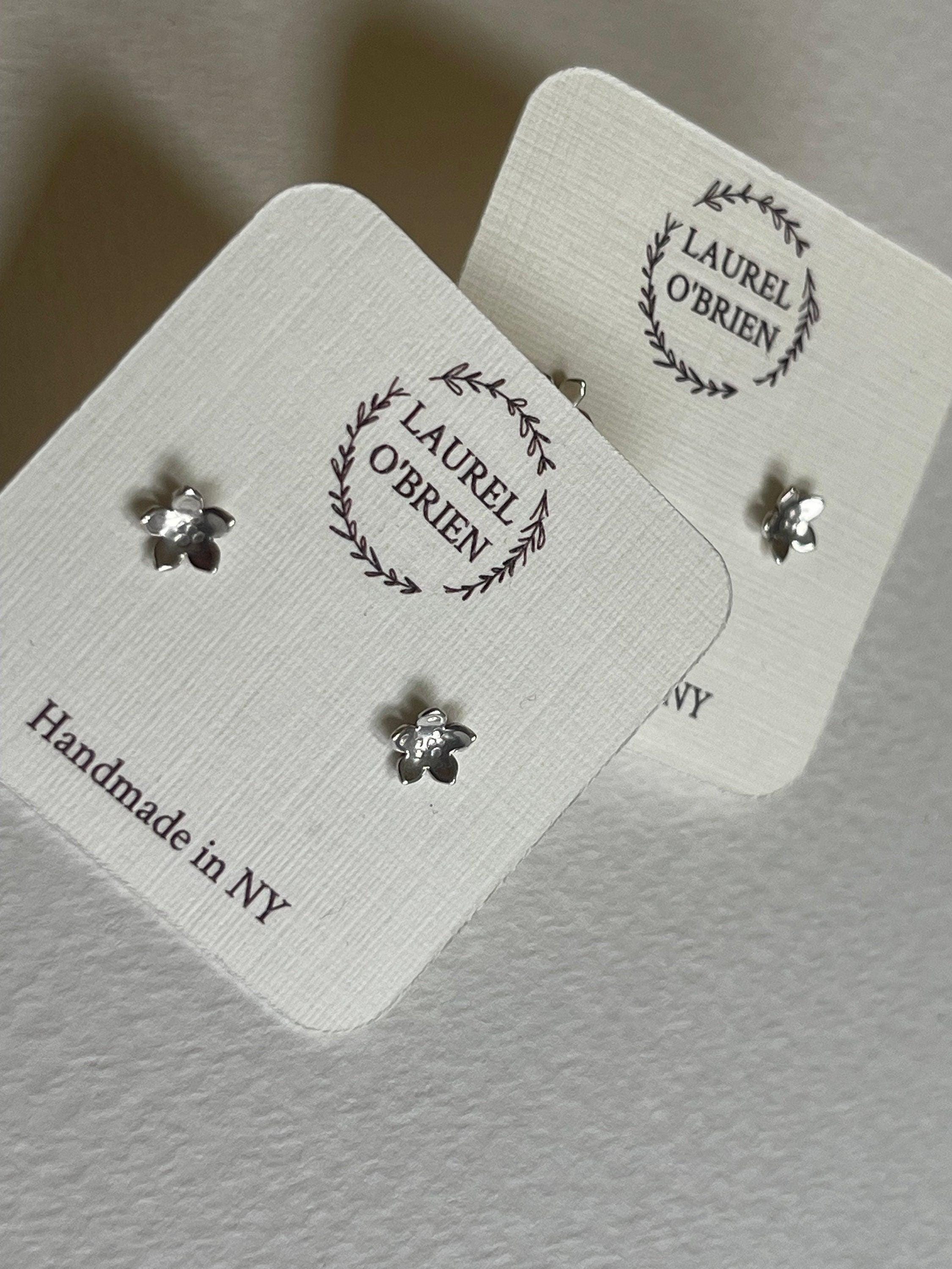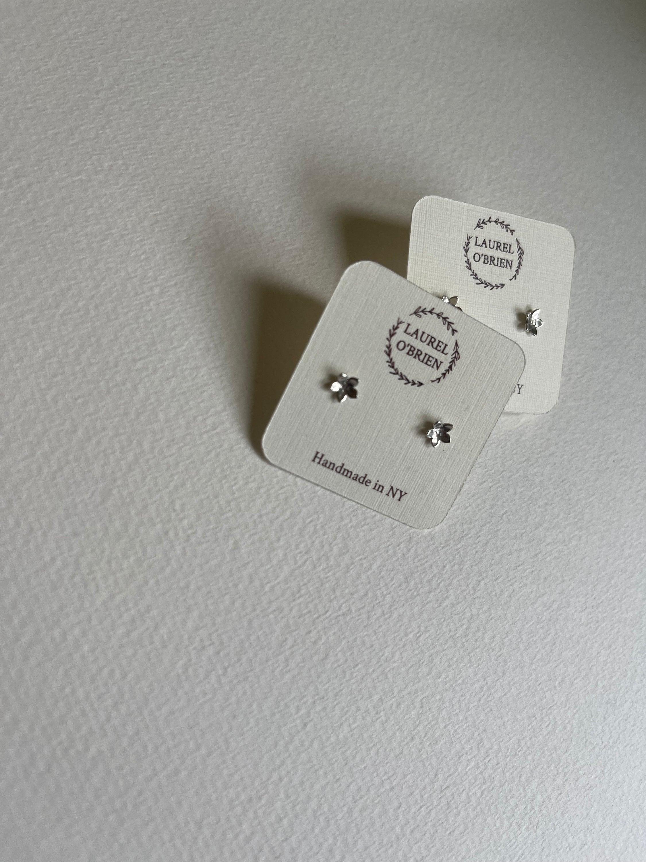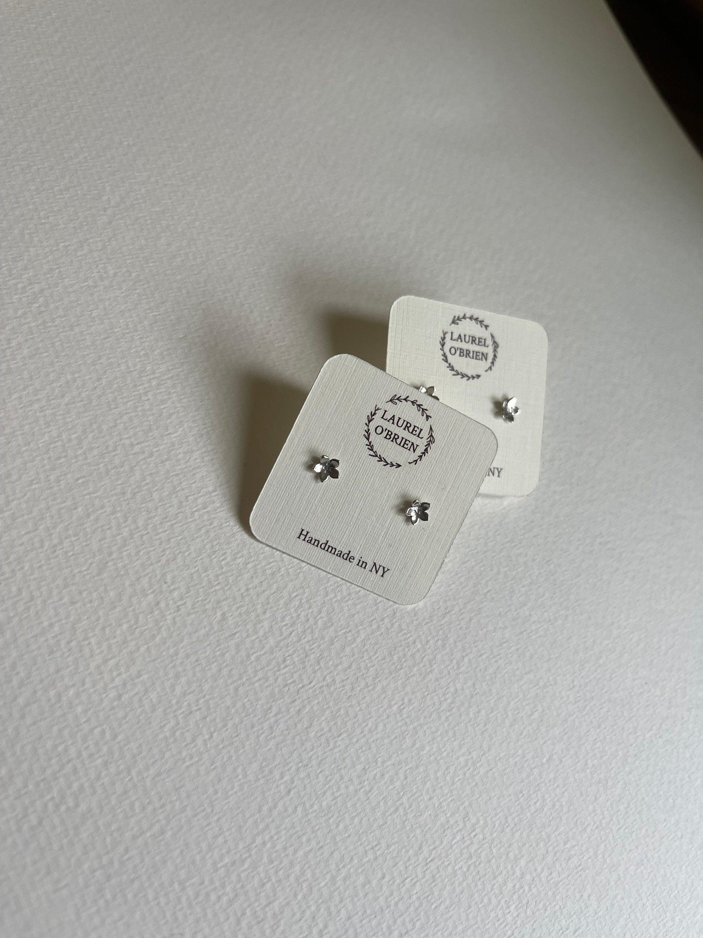 Each pair arrives on a little cream colored card with rubber backs. They are tucked into a pretty blue or green box with a hand stamped silver branch design on it.