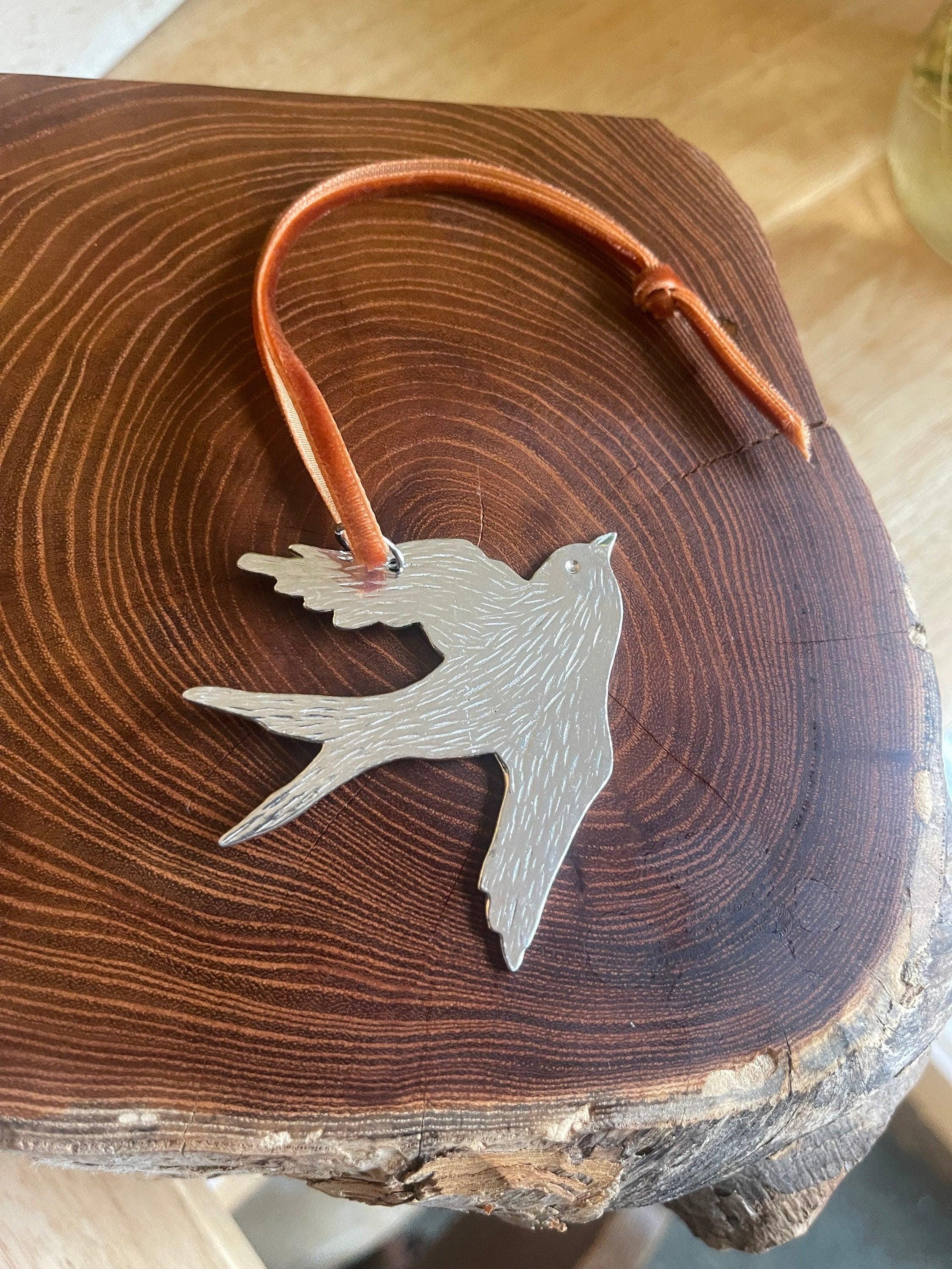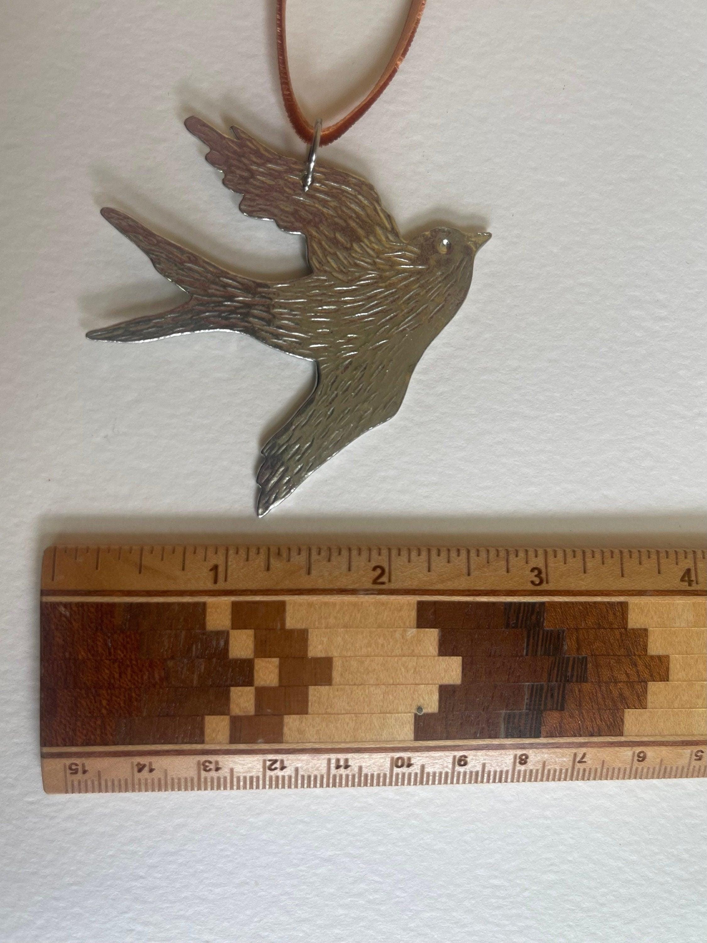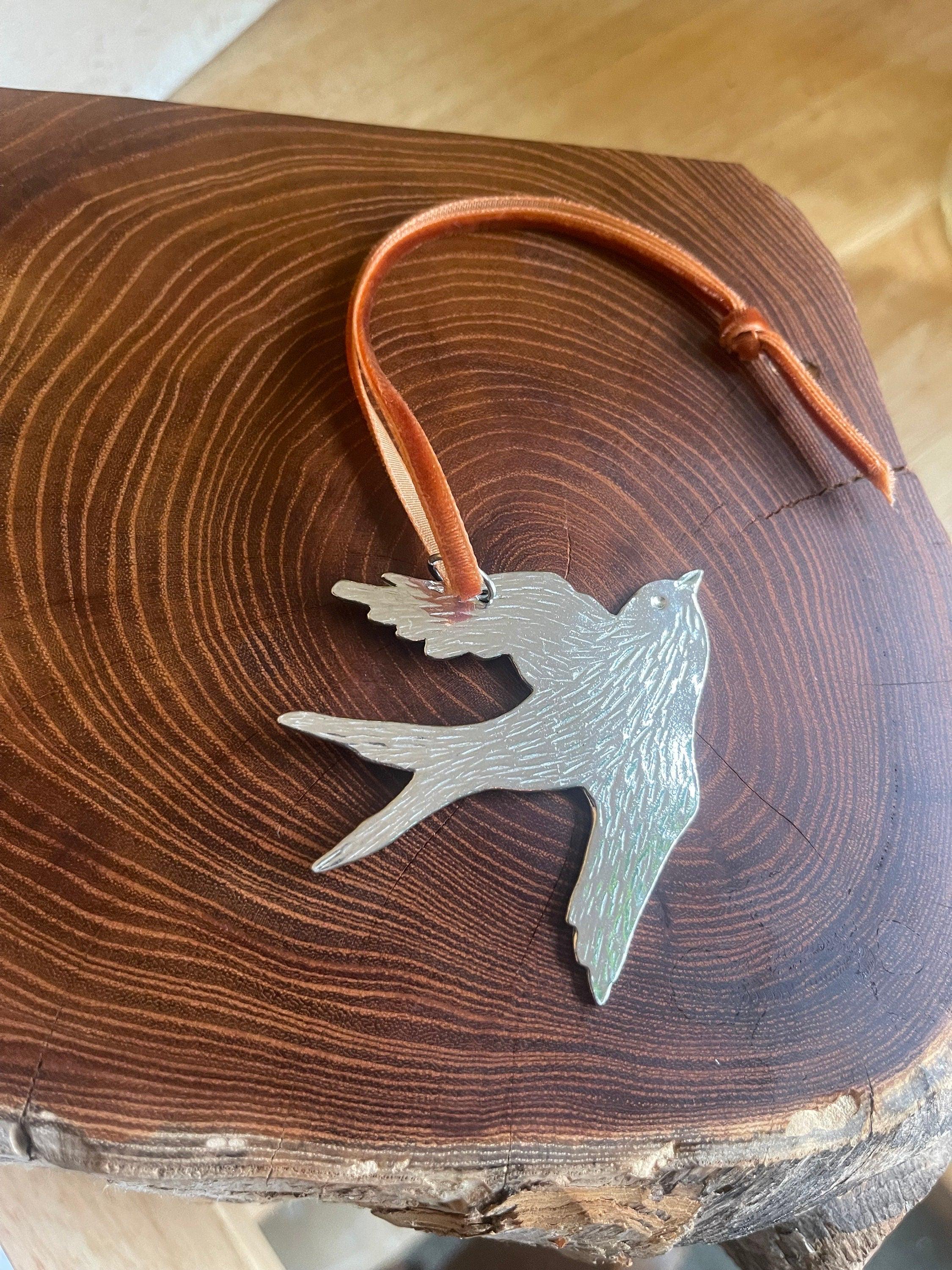 Handmade Pewter Bird Ornament. Pretty silver color in solid pewter and hanging from a pretty rust color velvet ribbon. Each side is textured with striated hammer marks to mimic feathers.