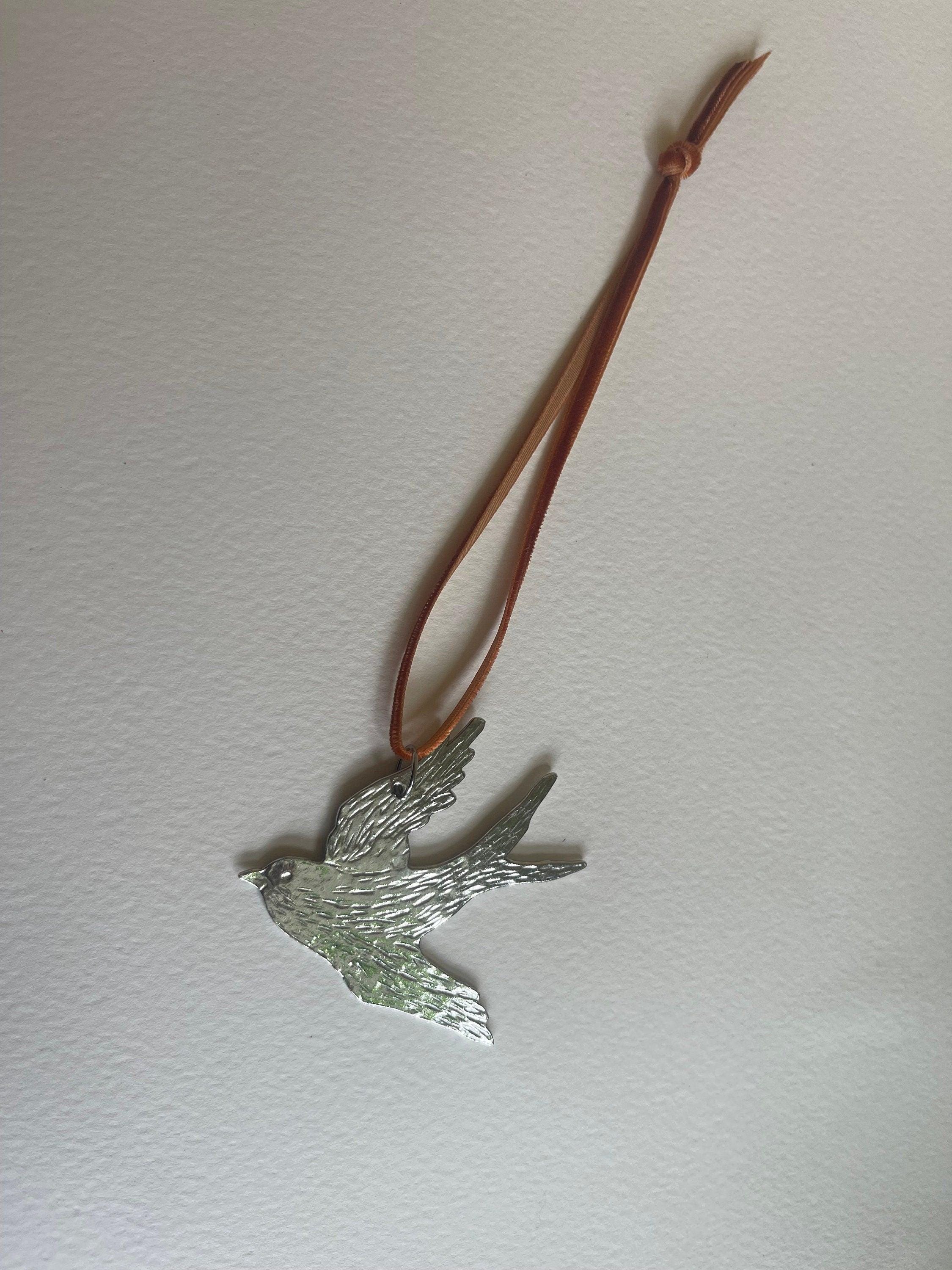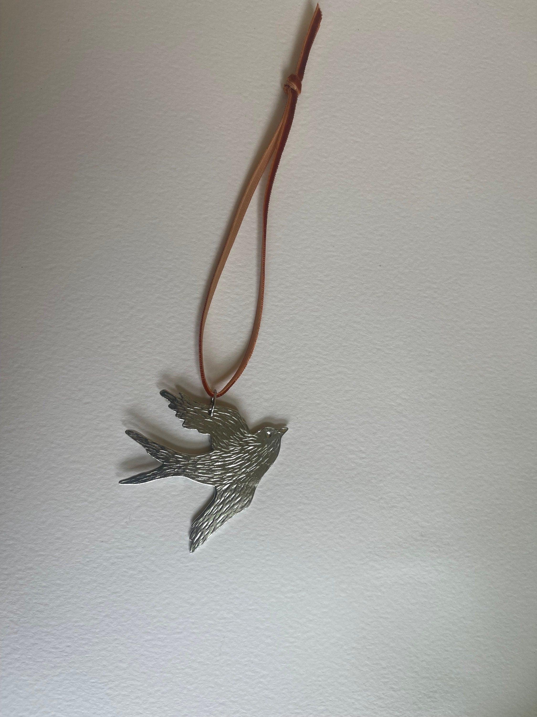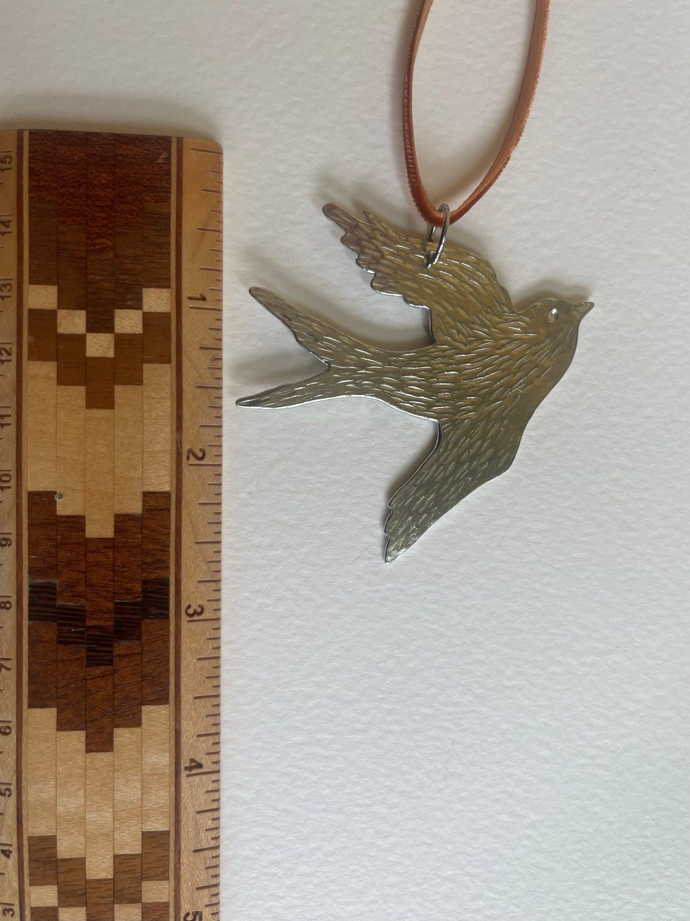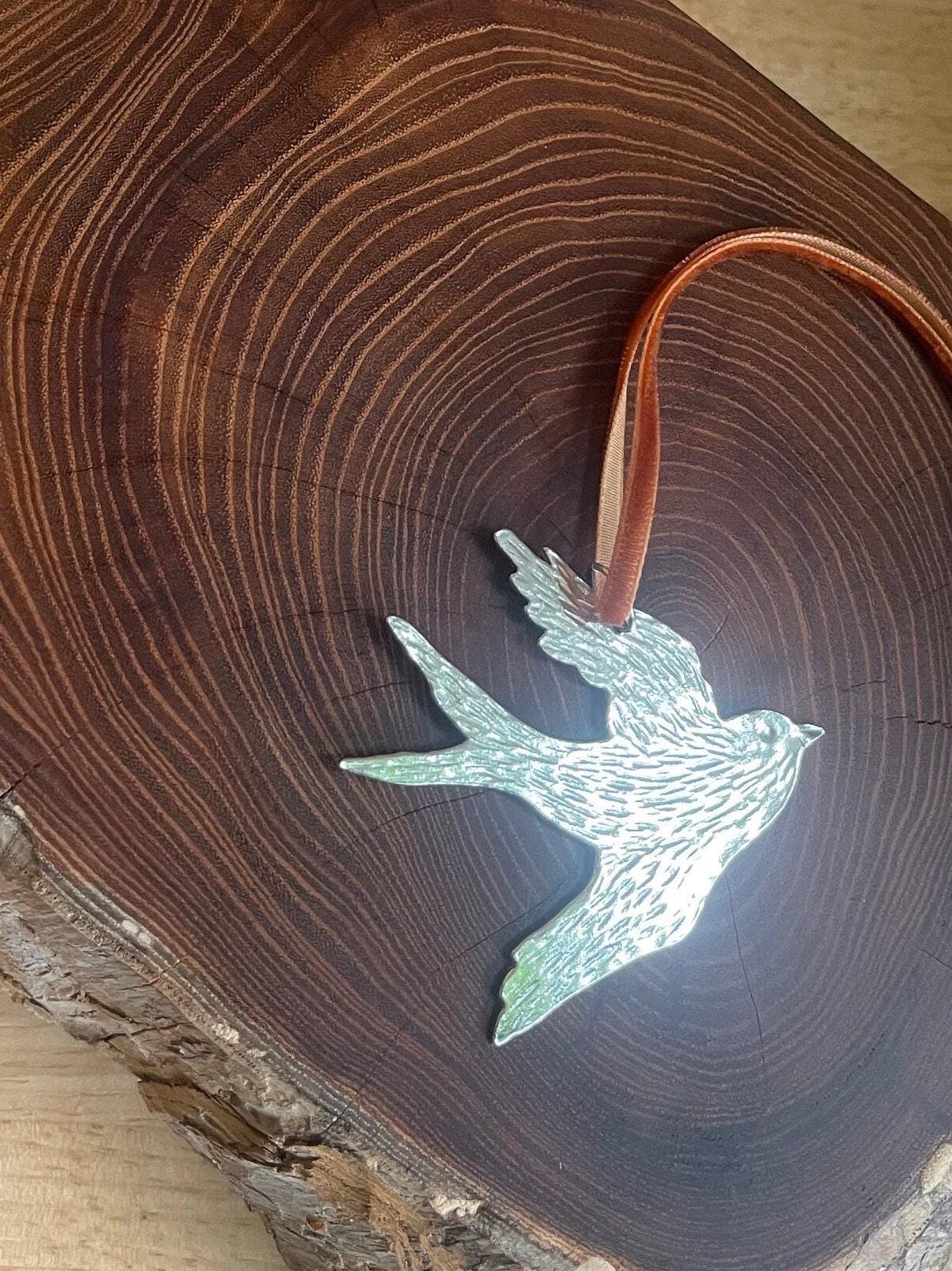 Handmade Pewter Bird Ornament. Pretty silver color in solid pewter and hanging from a pretty rust color velvet ribbon. Each side is textured with striated hammer marks to mimic feathers.