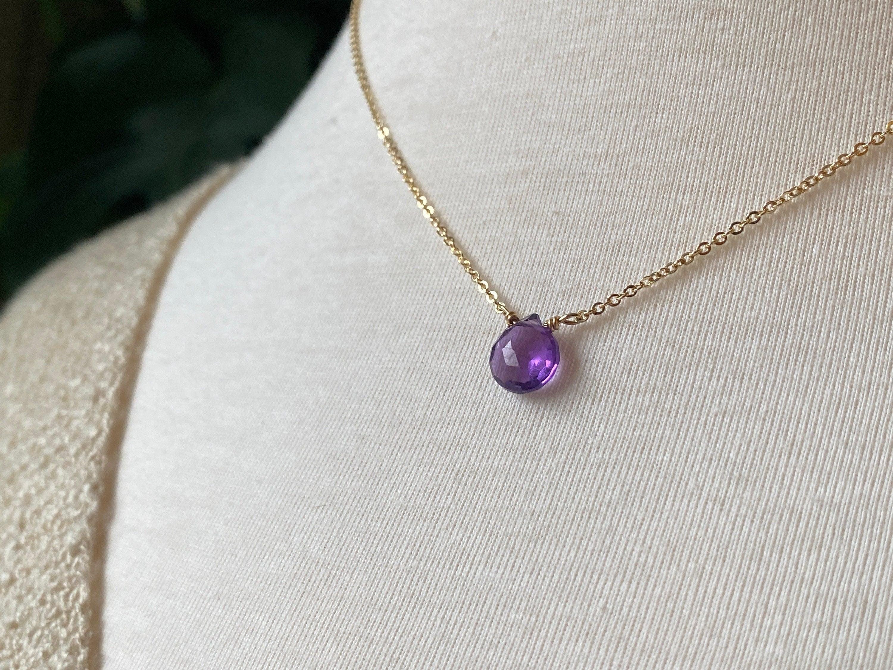 A delicate 14k yellow gold fill chain with a faceted purple natural gemstone. Amethyst is the birthstone of February. The stone is a colorful purple teardrop shape. These are natural, un-dyed stones. They have natural marks and inclusions that may vary slightly.