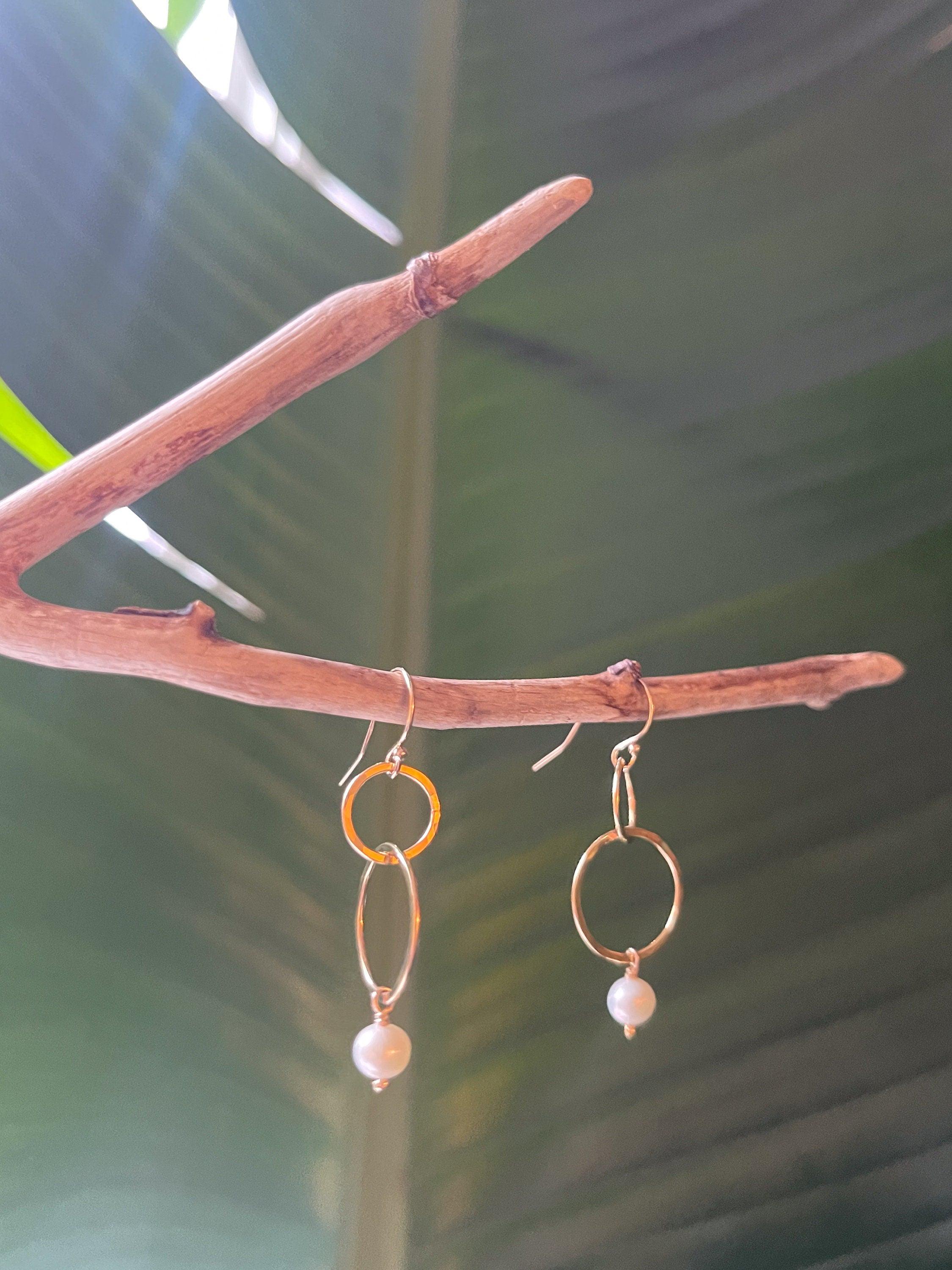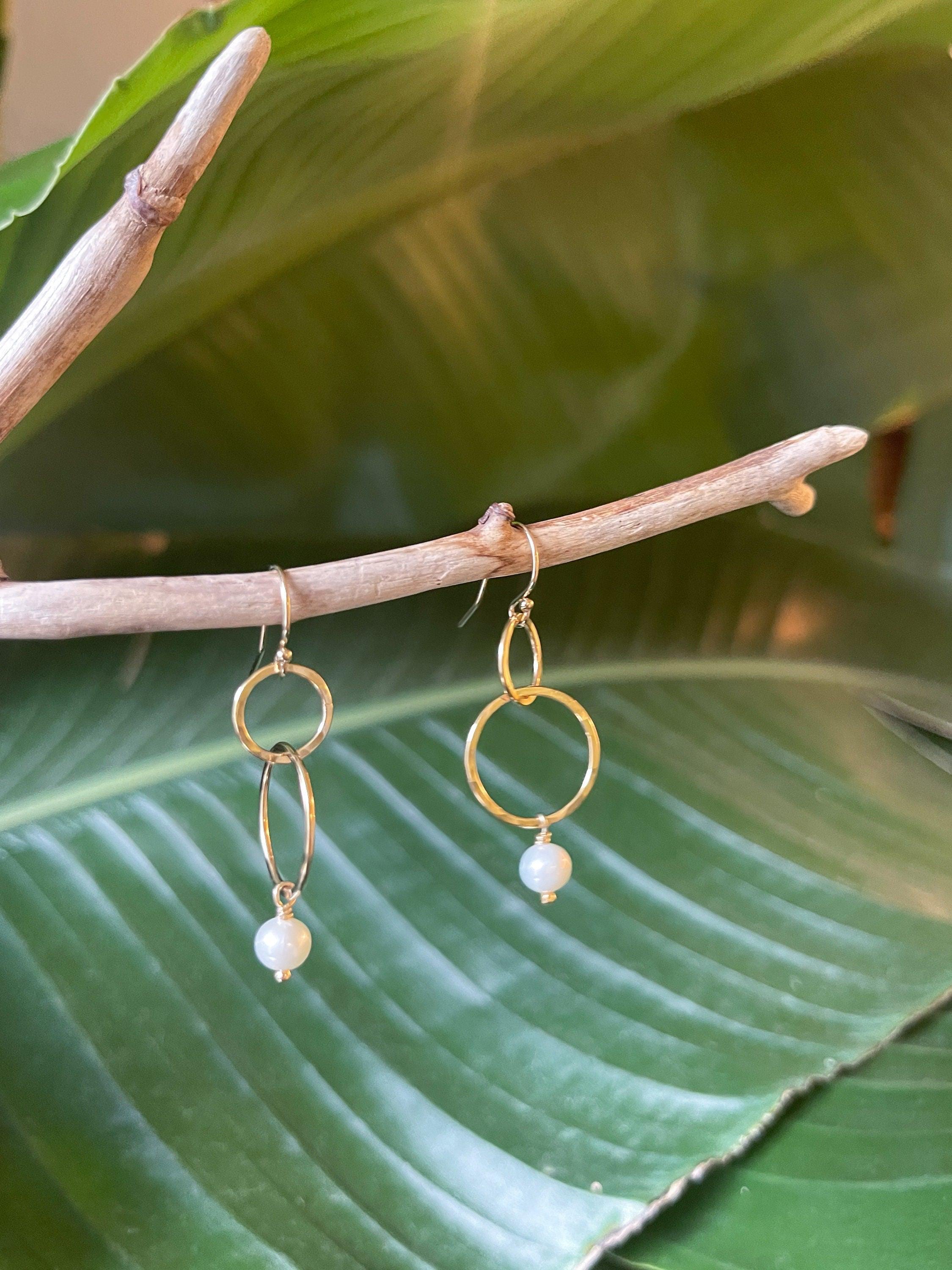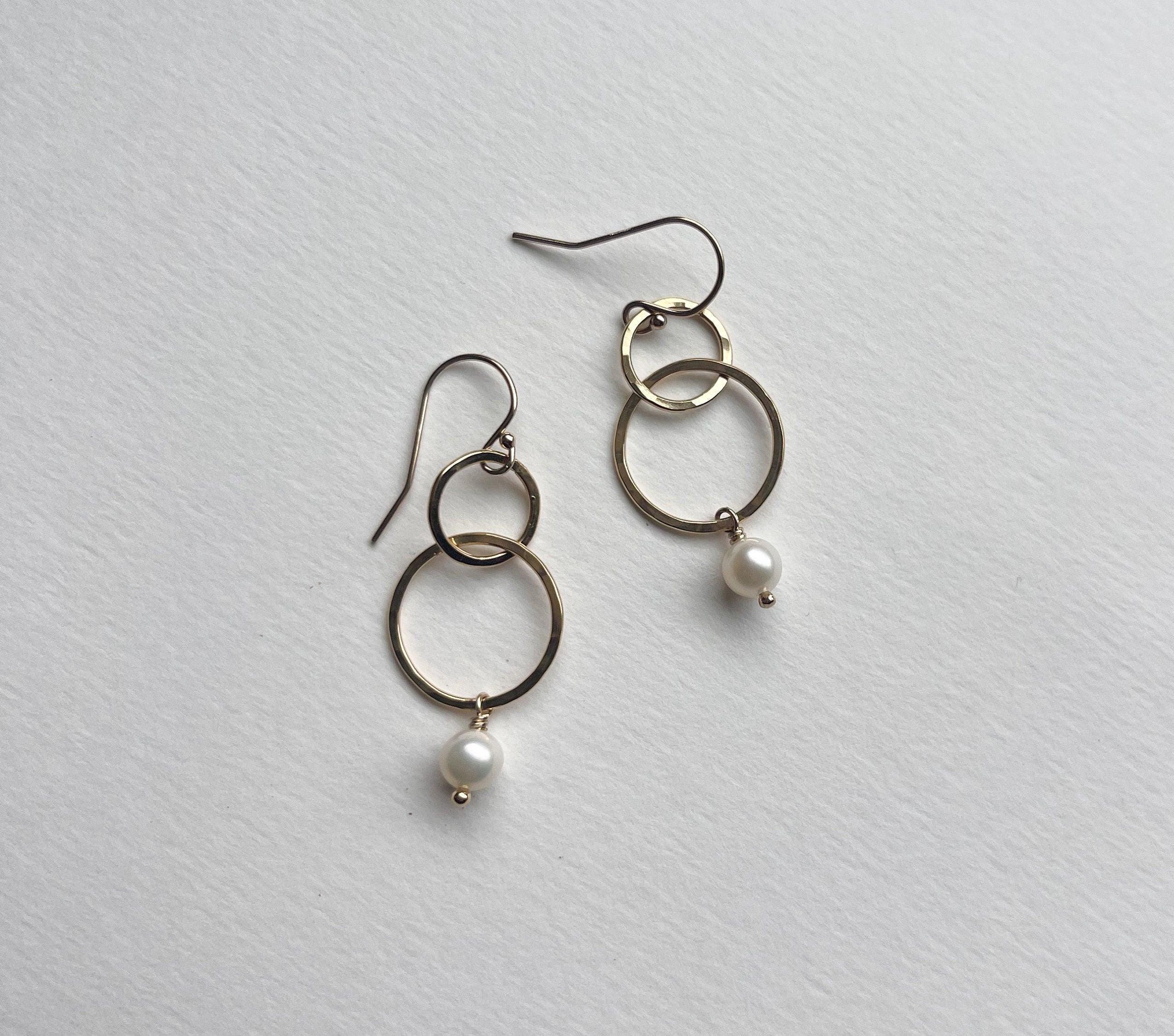 Lightly hammered 14k gold fill interlocking circle earrings with beautiful natural freshwater pearl beads. Pearl is the birthstone of June, perfect for a June birthday gift. Elegant, Simple, golden hammered earrings. These dangle from 14k gold fill. Easy to wear and gift.