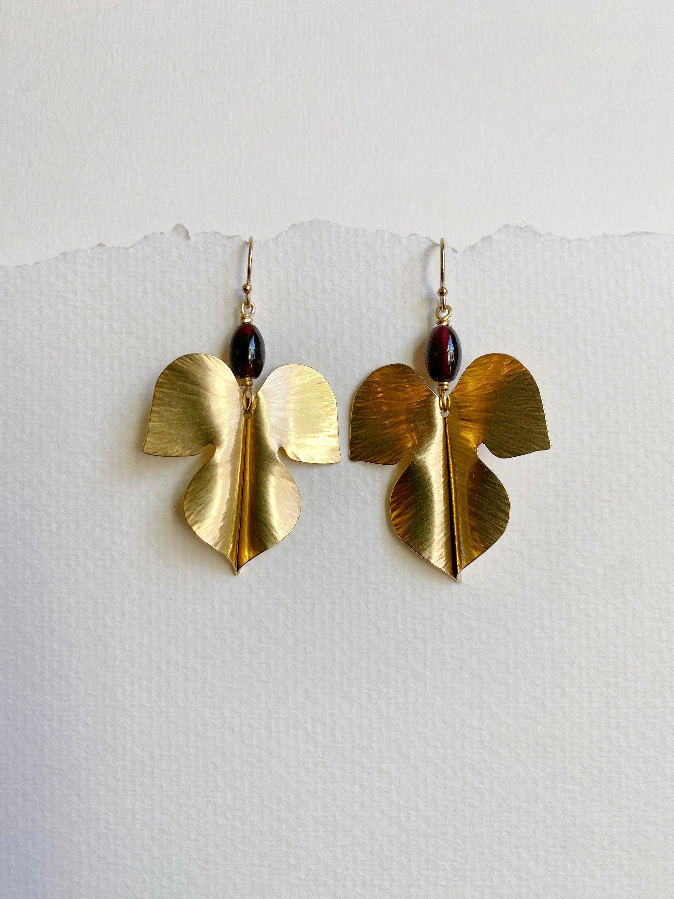 Beautiful hammered, striated hepatica wildflower leaves are a unique shape. The shapes are hand cut and hammered. I make these by hand sawing, hammering and forging out brass. I add garnet stones & 14k gold fill hooks. They have smooth garnet gemstones at the top of each. Garnet is January‘s Birth stone.