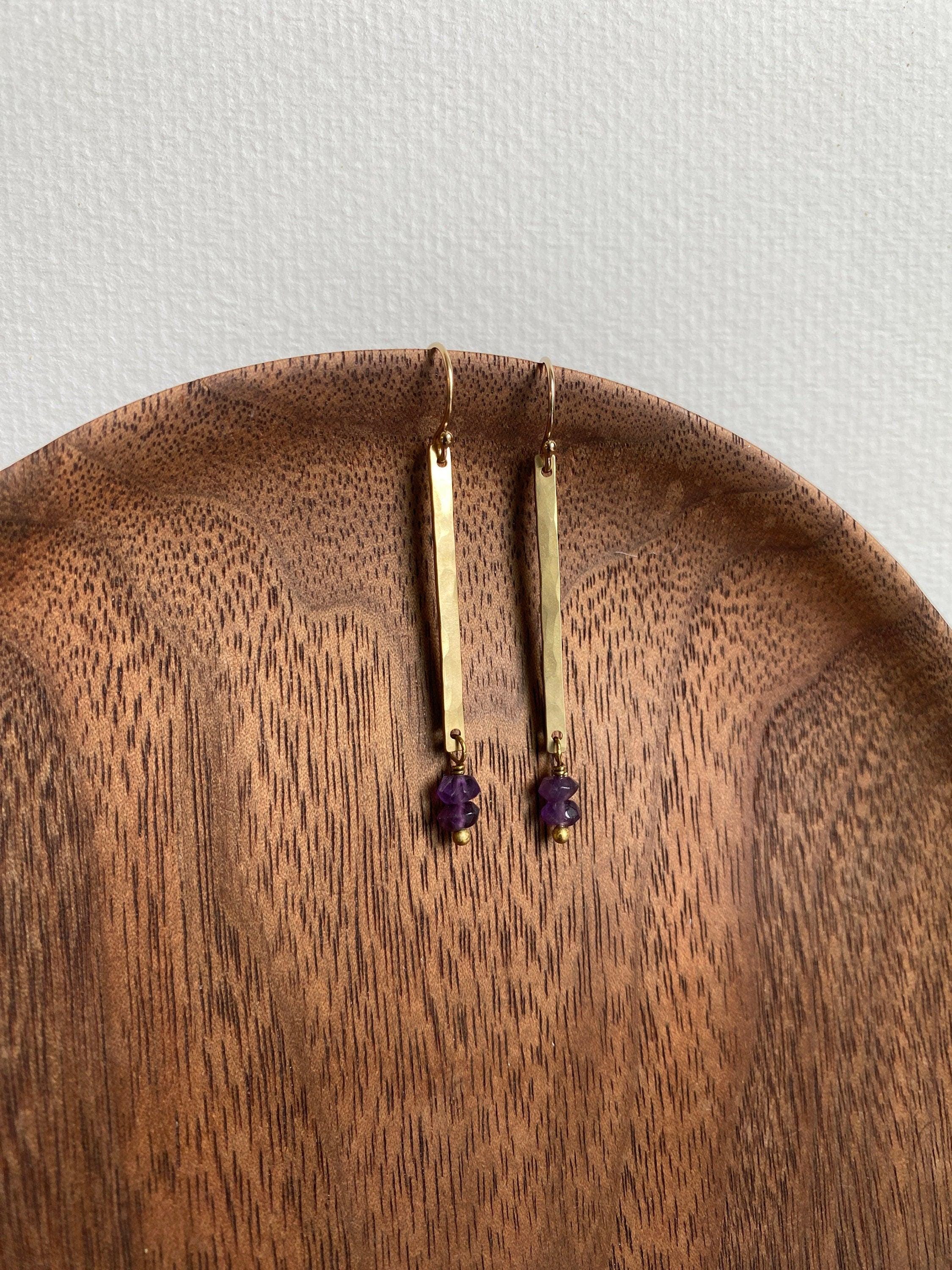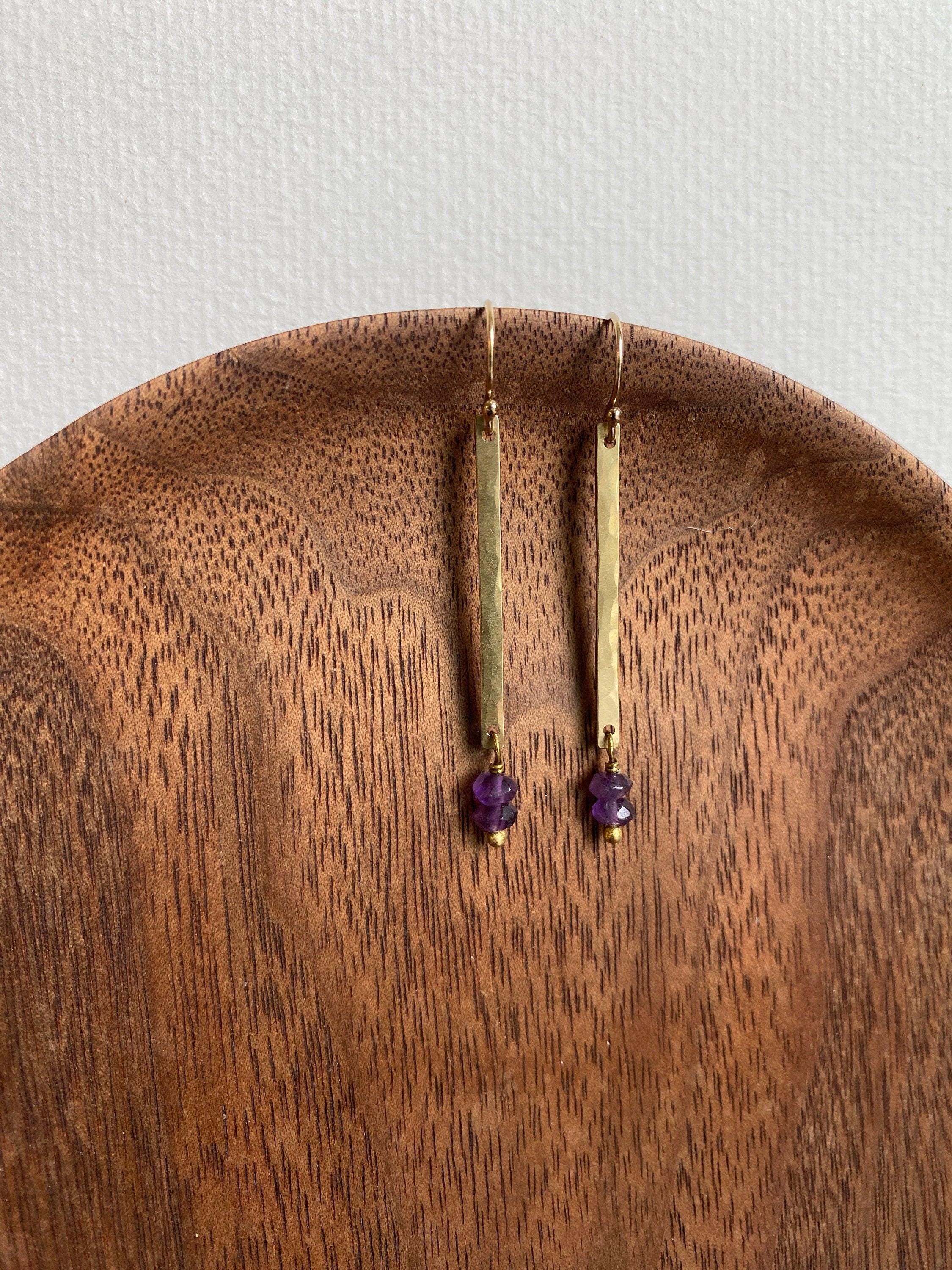 Brass & Amethyst Earrings, Pretty Hammered Long Brass Rectangle, Natural Purple Gemstone Earrings, February Birthstone