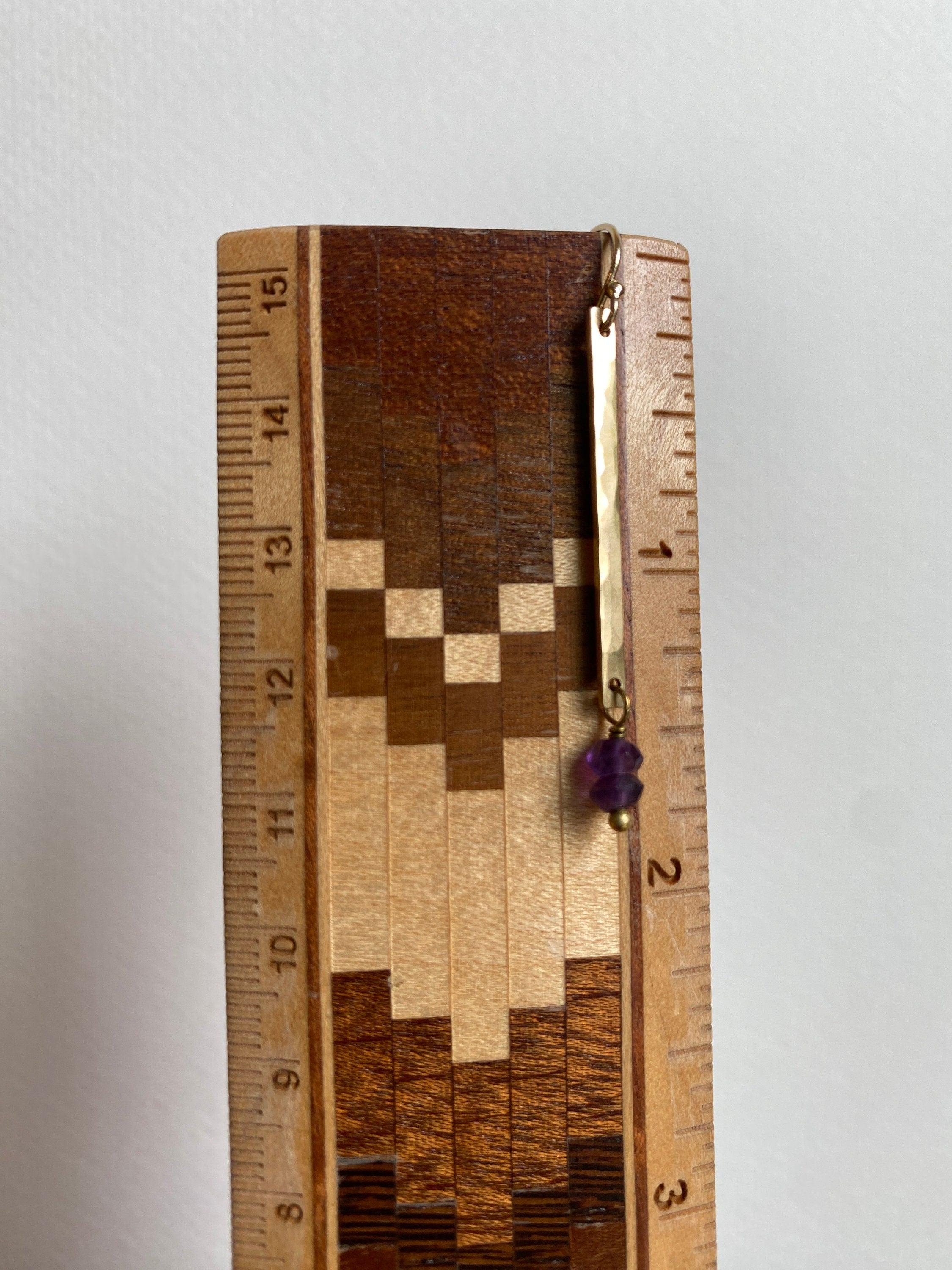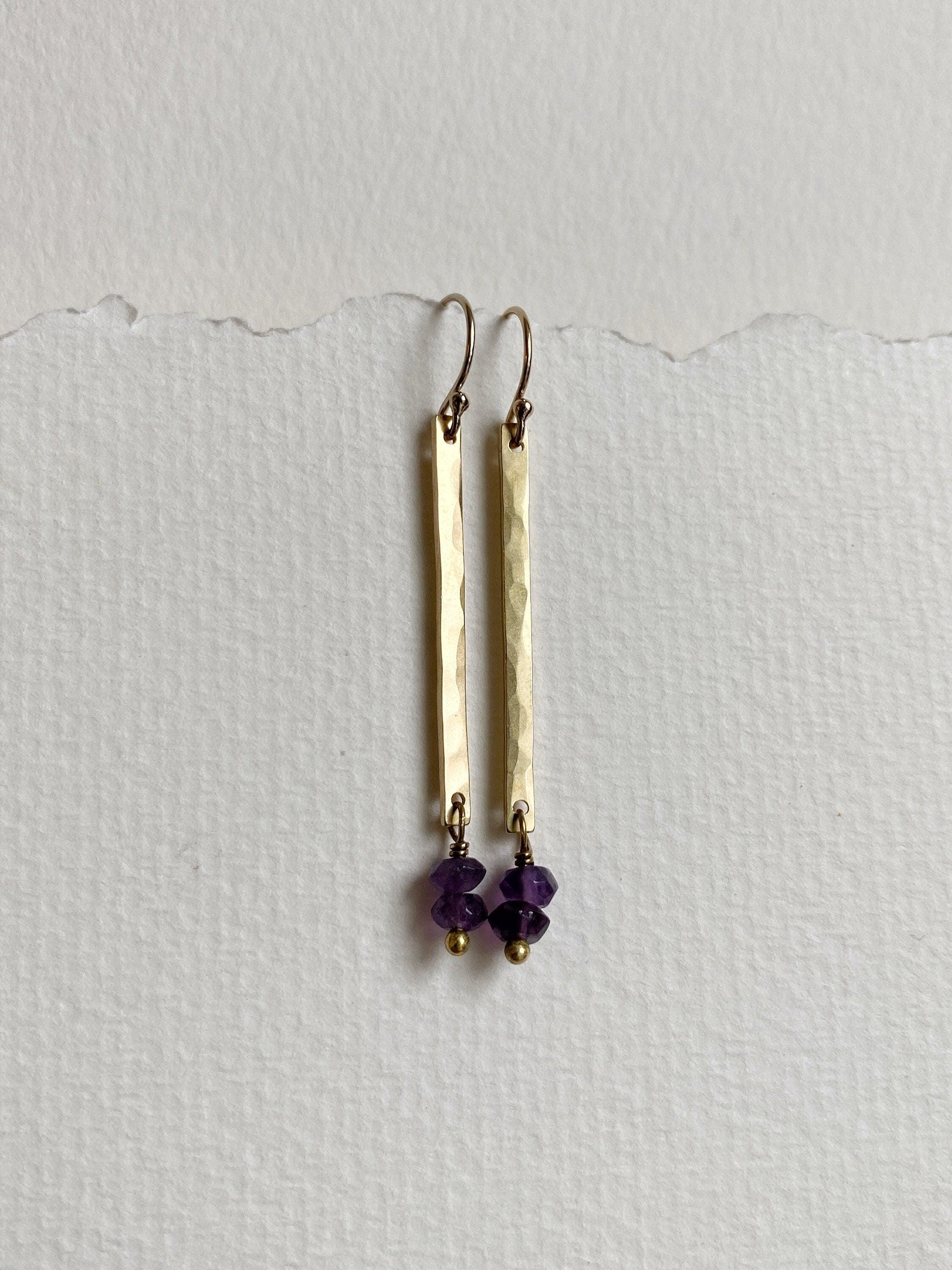 Lightly hammered brass long rectangle earrings with pretty purple Amethyst faceted gemstone beads. Amethyst is the birthstone of February, perfect for a February birthday gift. Elegant, Simple, Brass Hammered Earrings. These dangle from 14k gold-fill hooks. Easy to wear and gift.