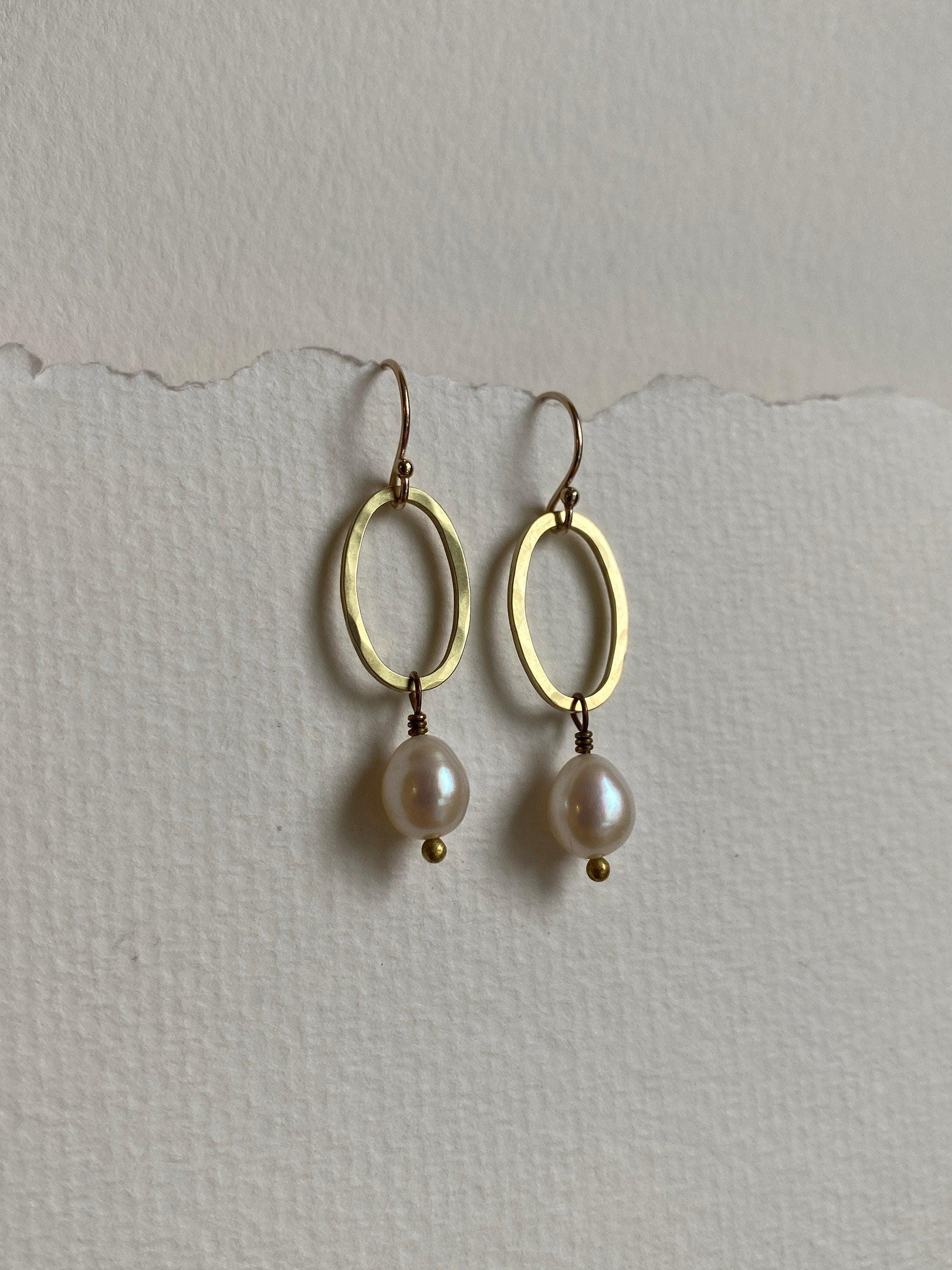Pearl Oval Drop Earrings, Brass Earrings, Gold and White Freshwater Pearl Earrings, June Birthstone