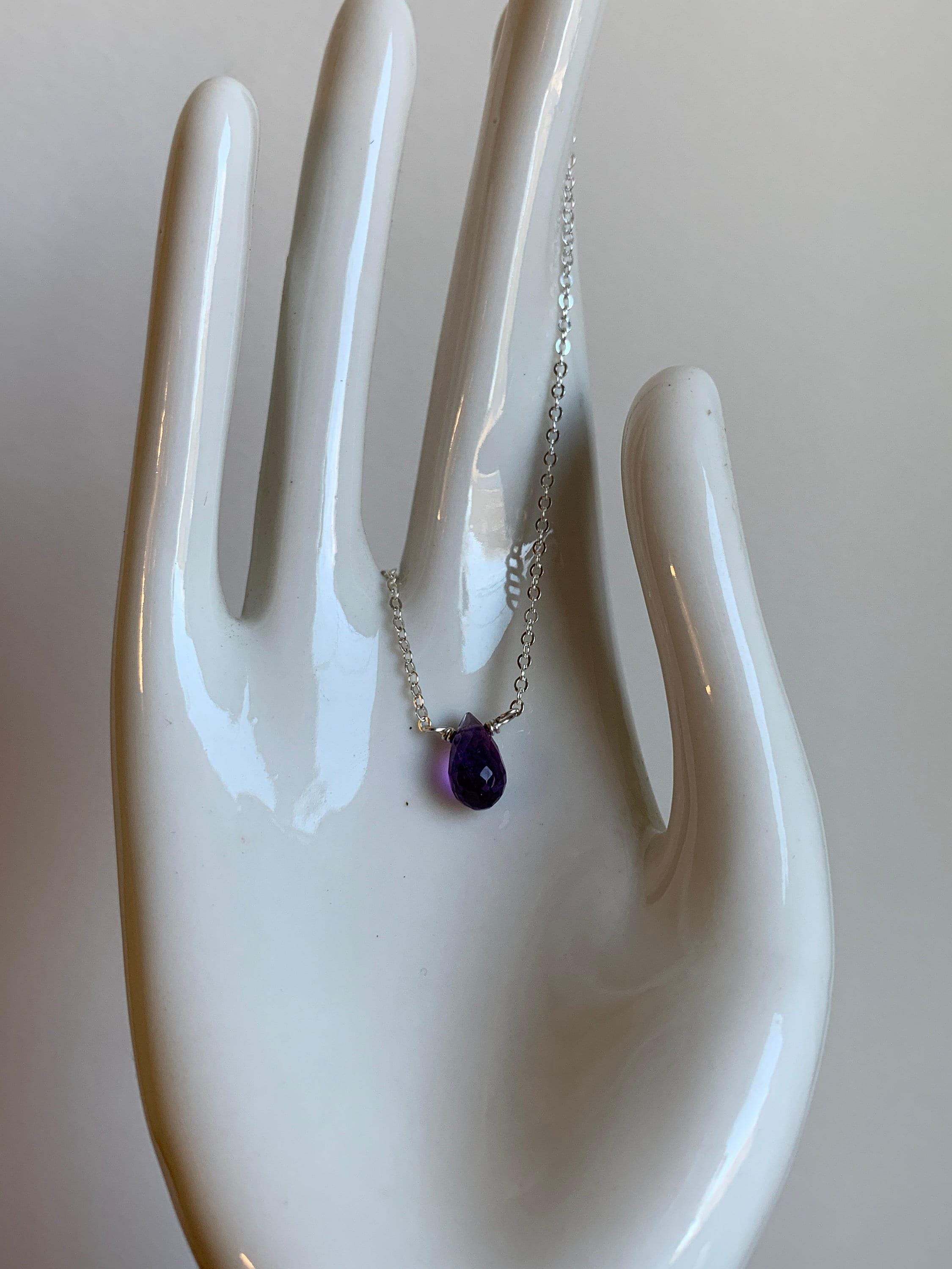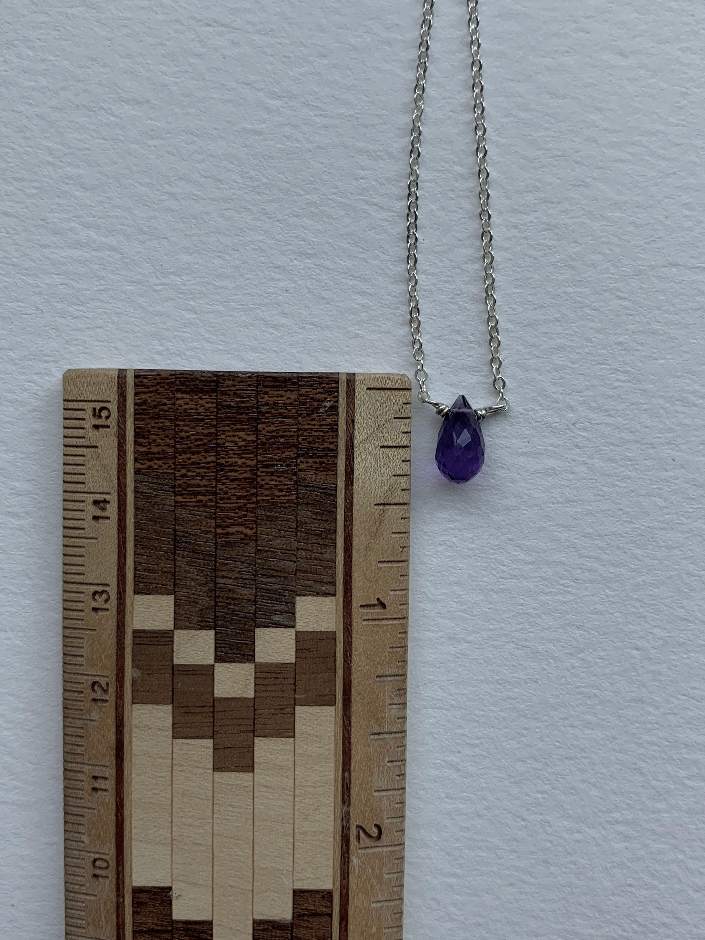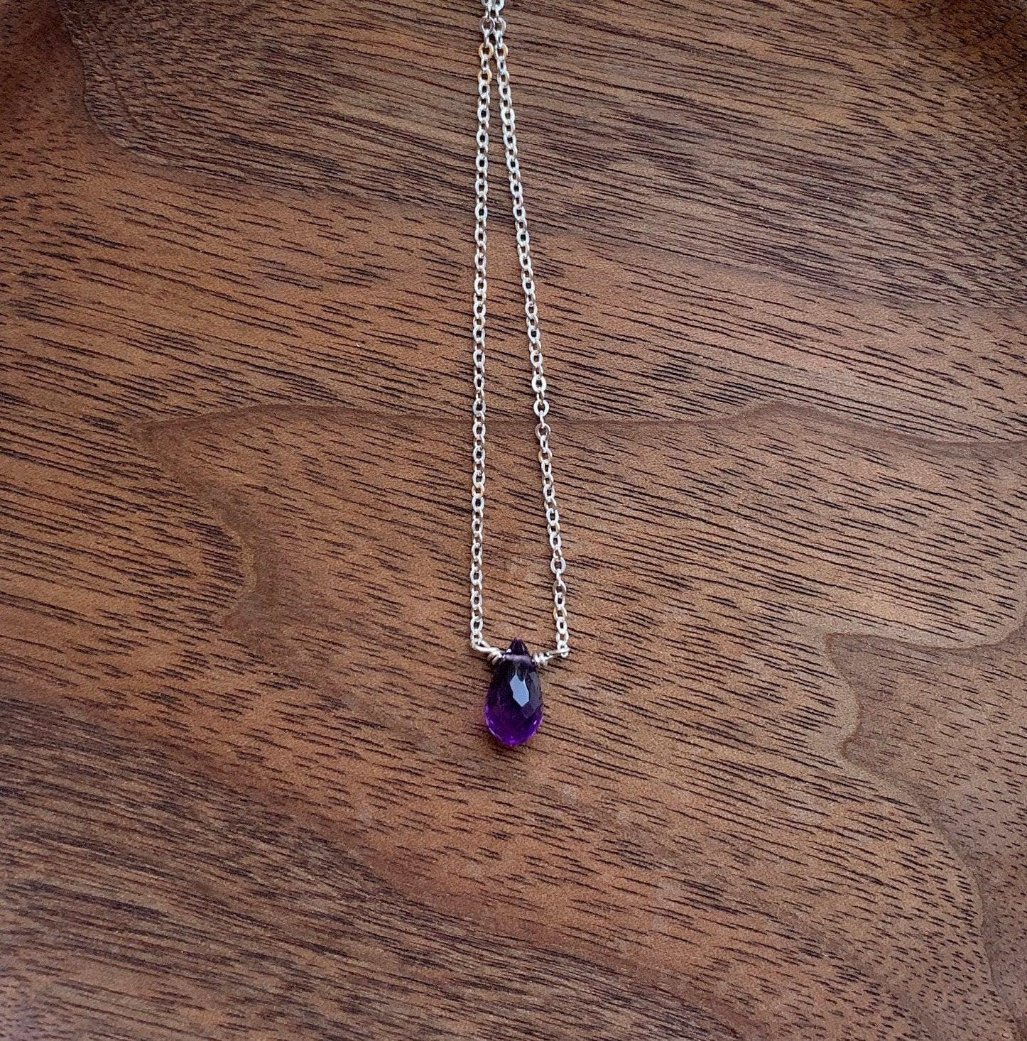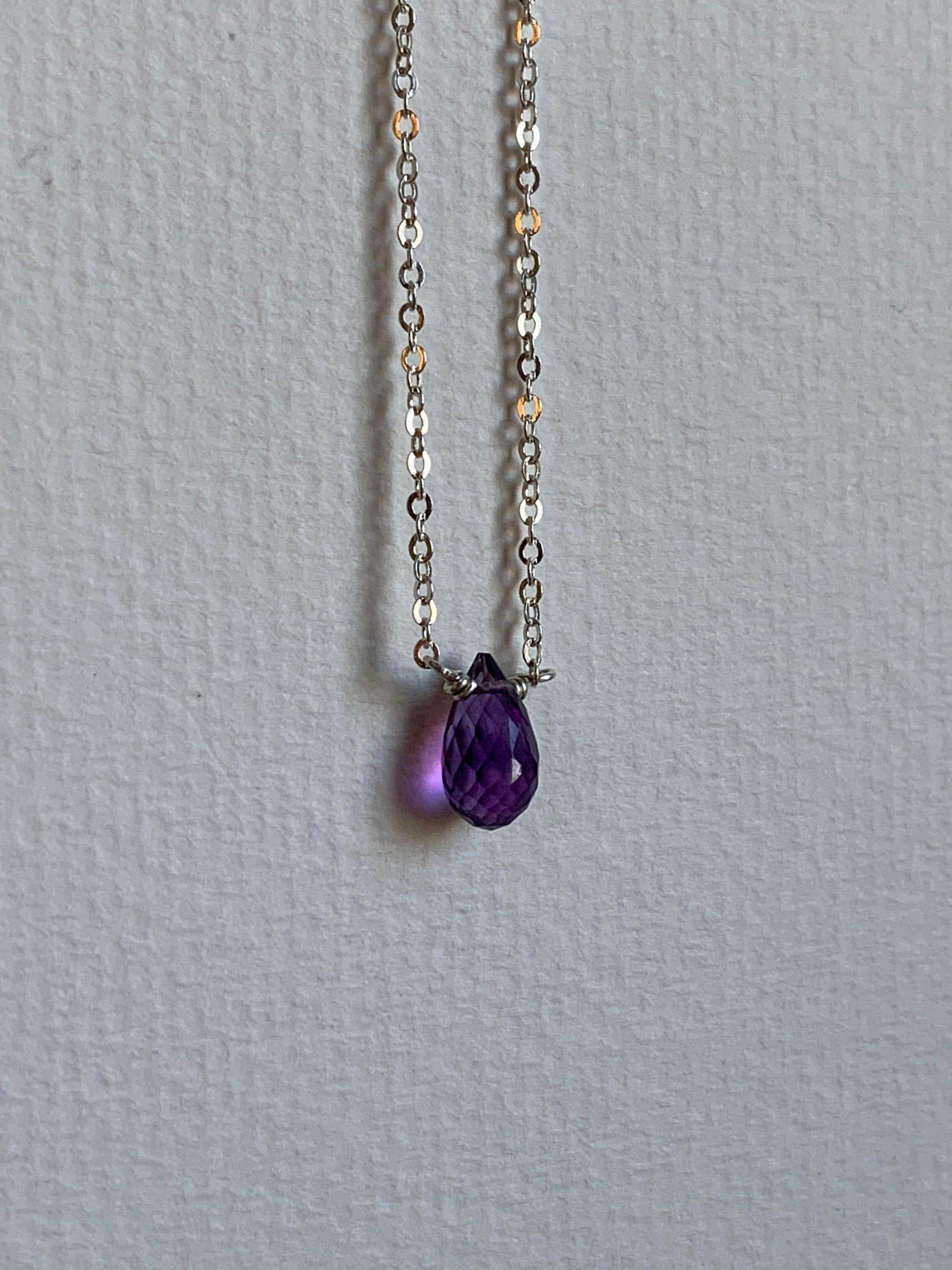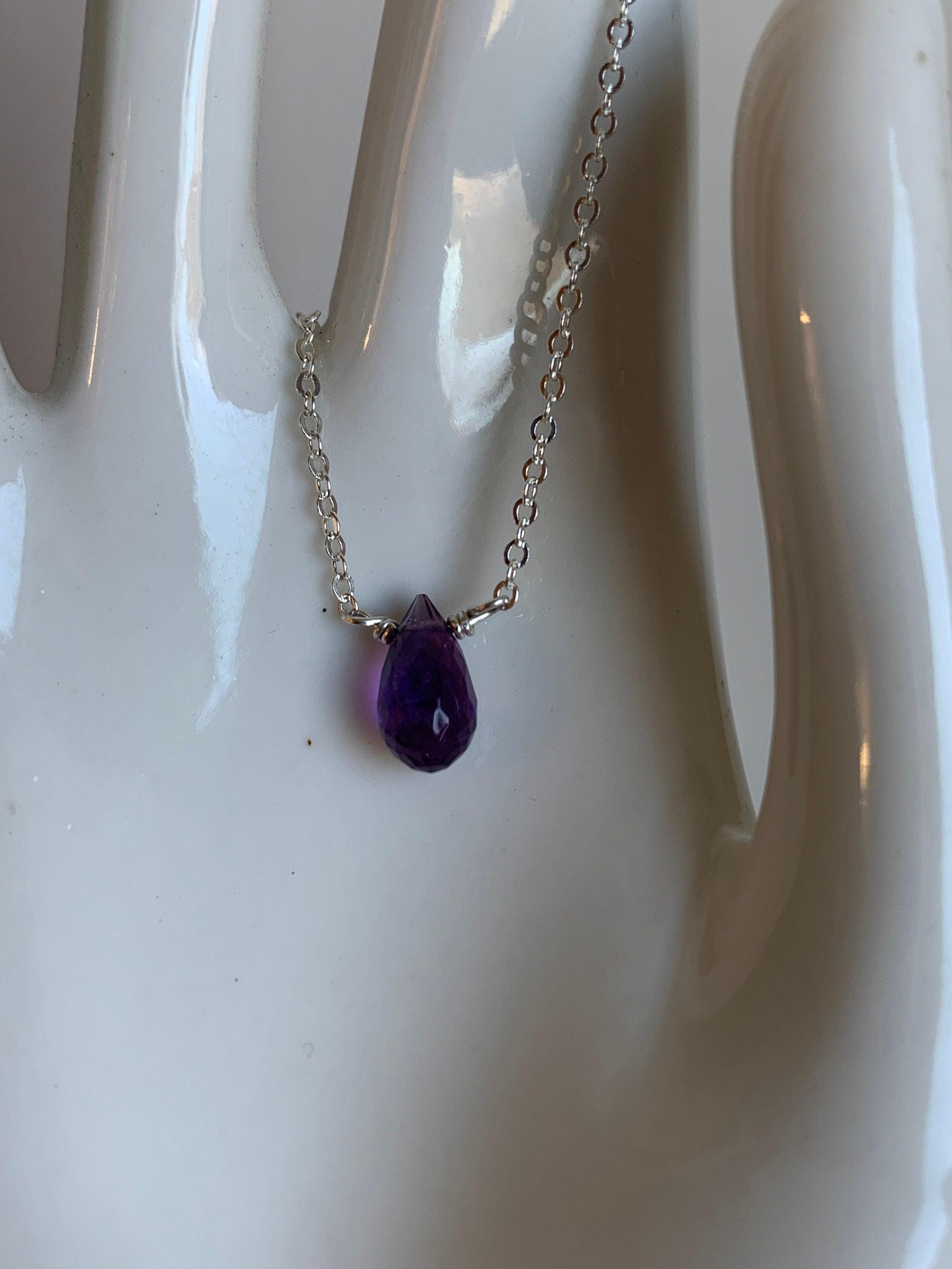 A delicate 925 Sterling Silver chain with a faceted purple natural gemstone. Amethyst is the birthstone of February. The stone is a colorful purple teardrop shape. These are natural, un-dyed stones. They have natural marks and inclusions that may vary slightly.