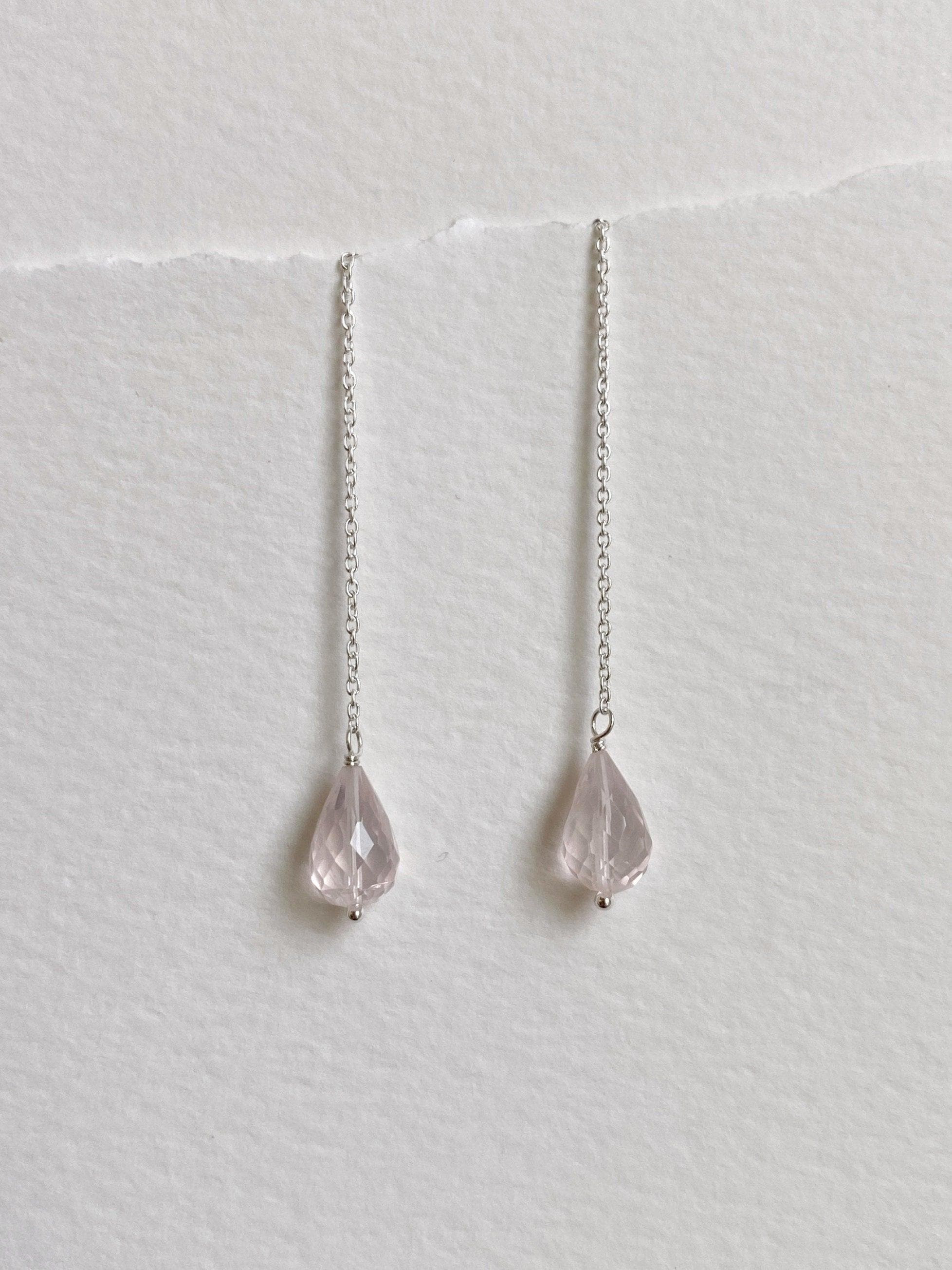 A pair of beautiful handmade rose quartz and sterling silver 925 threader earrings. Perfect for everyday use and special occasions. These are made with delicate, natural, faceted rose quartz teardrop on a threader chain. These are 5 3/8" long but will dangle at a shorter length when they are in your ears.