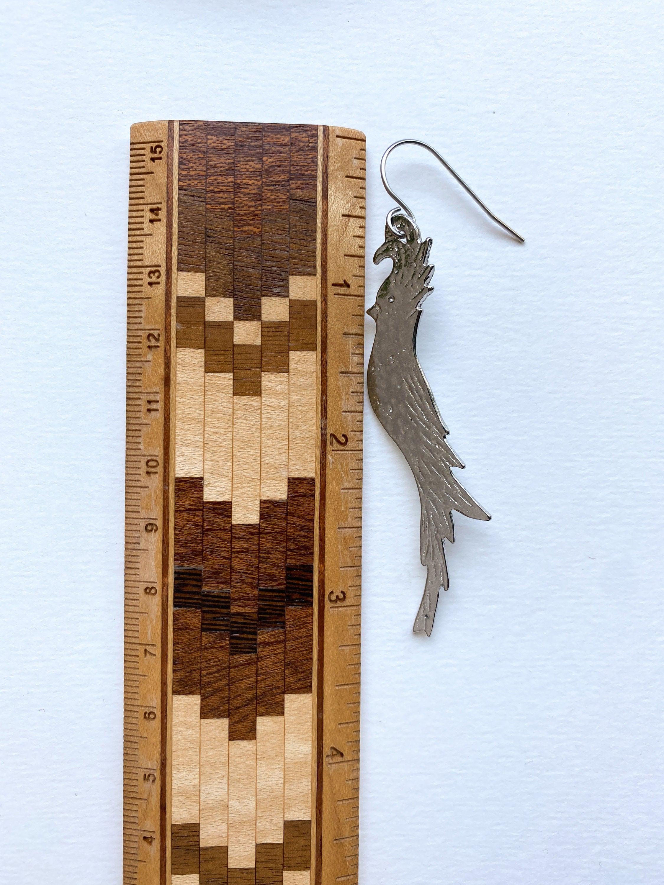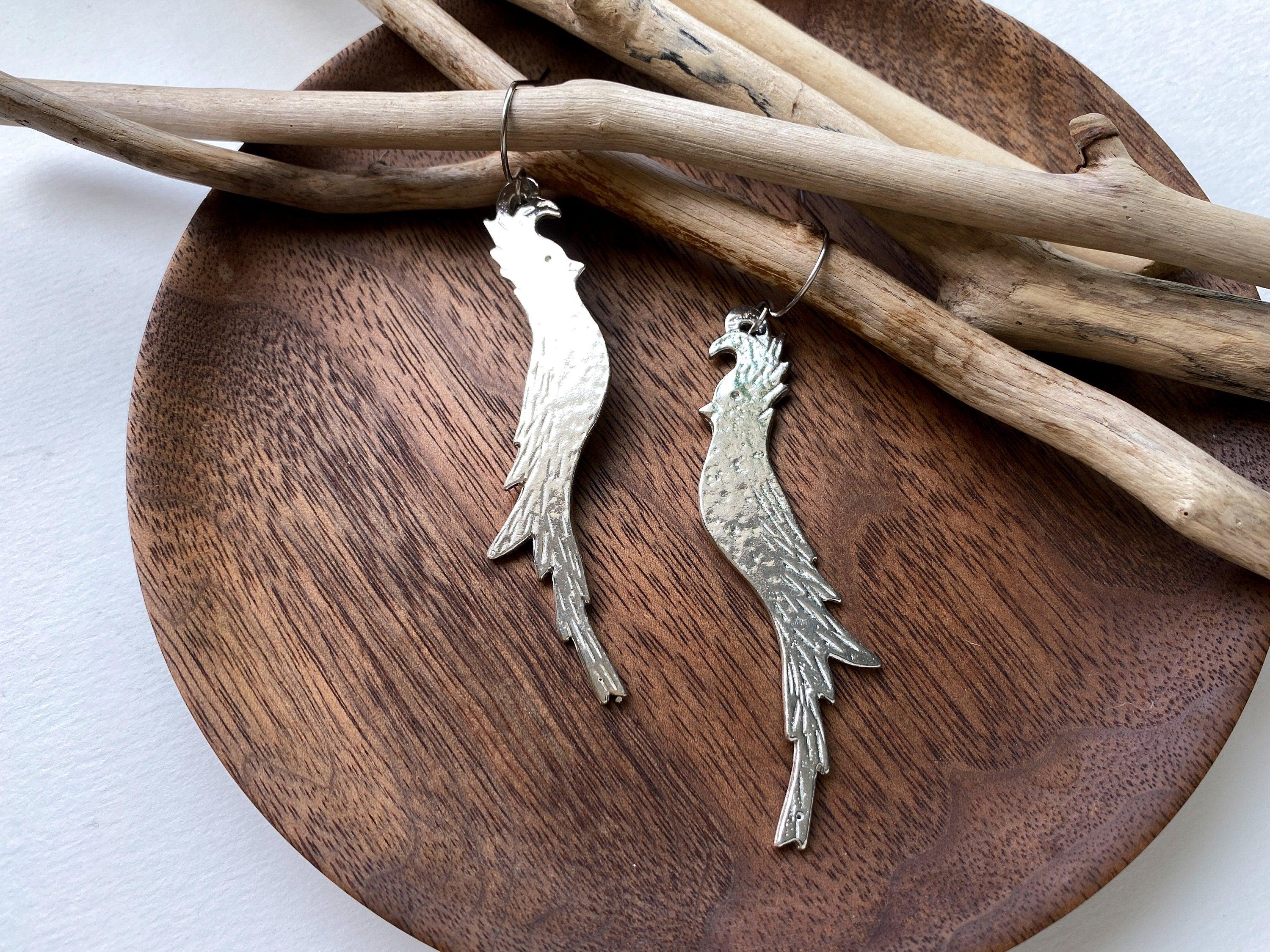 These cockatiel bird shaped earrings are long and funky, with a unique textured finish that will vary slightly from pair to pair. These hang at around 3 1/4 inches, making them almost shoulder length!