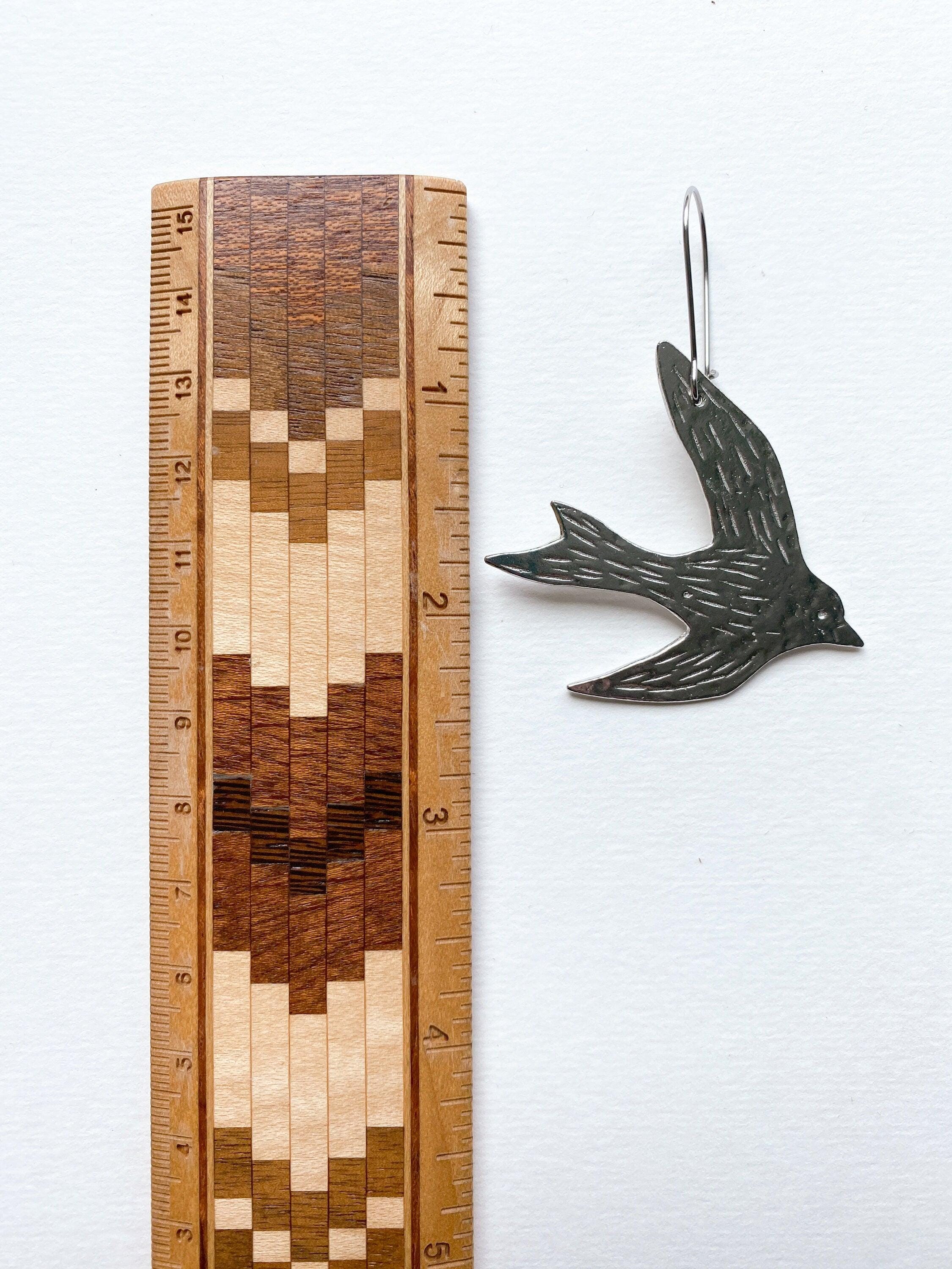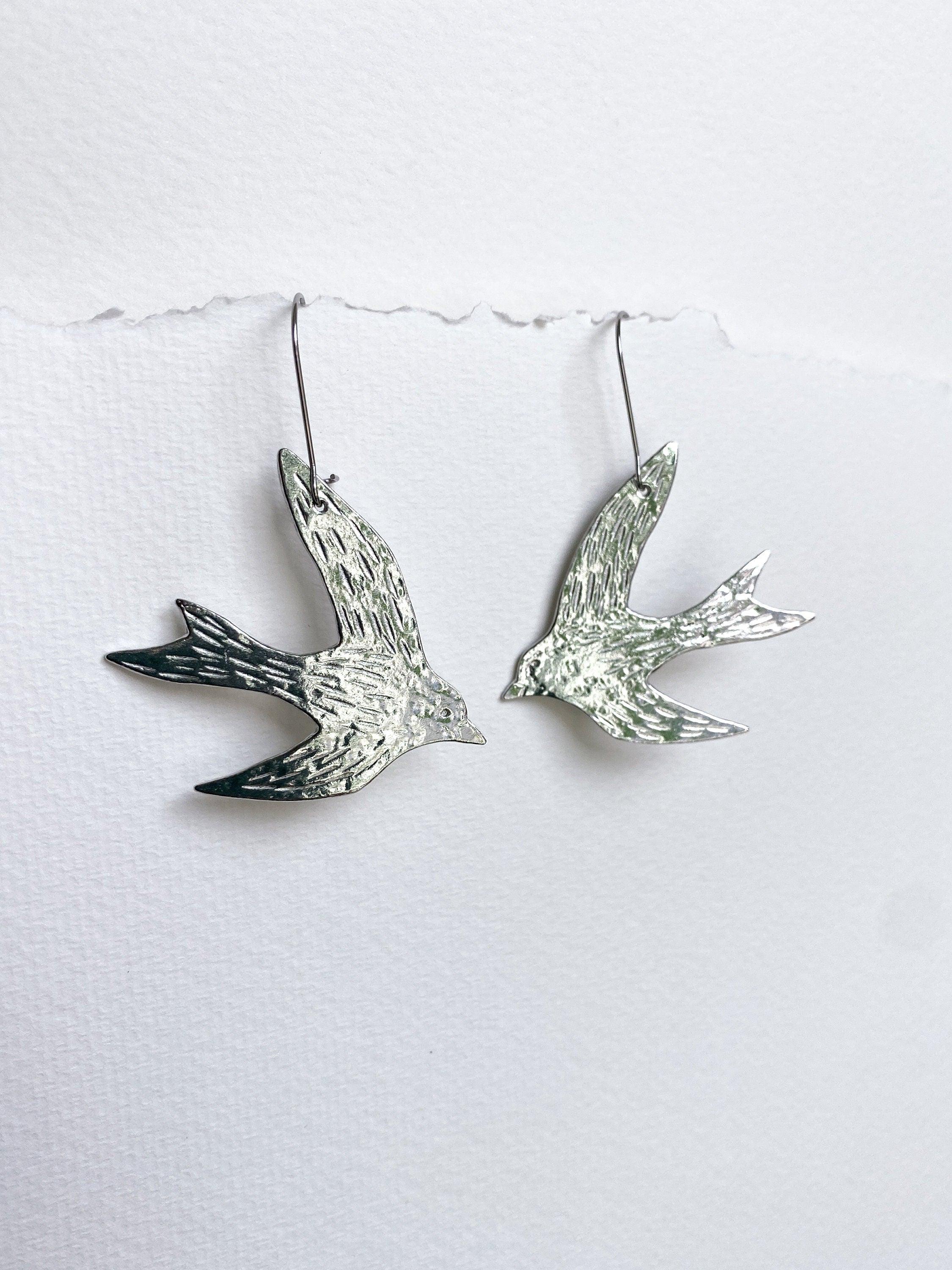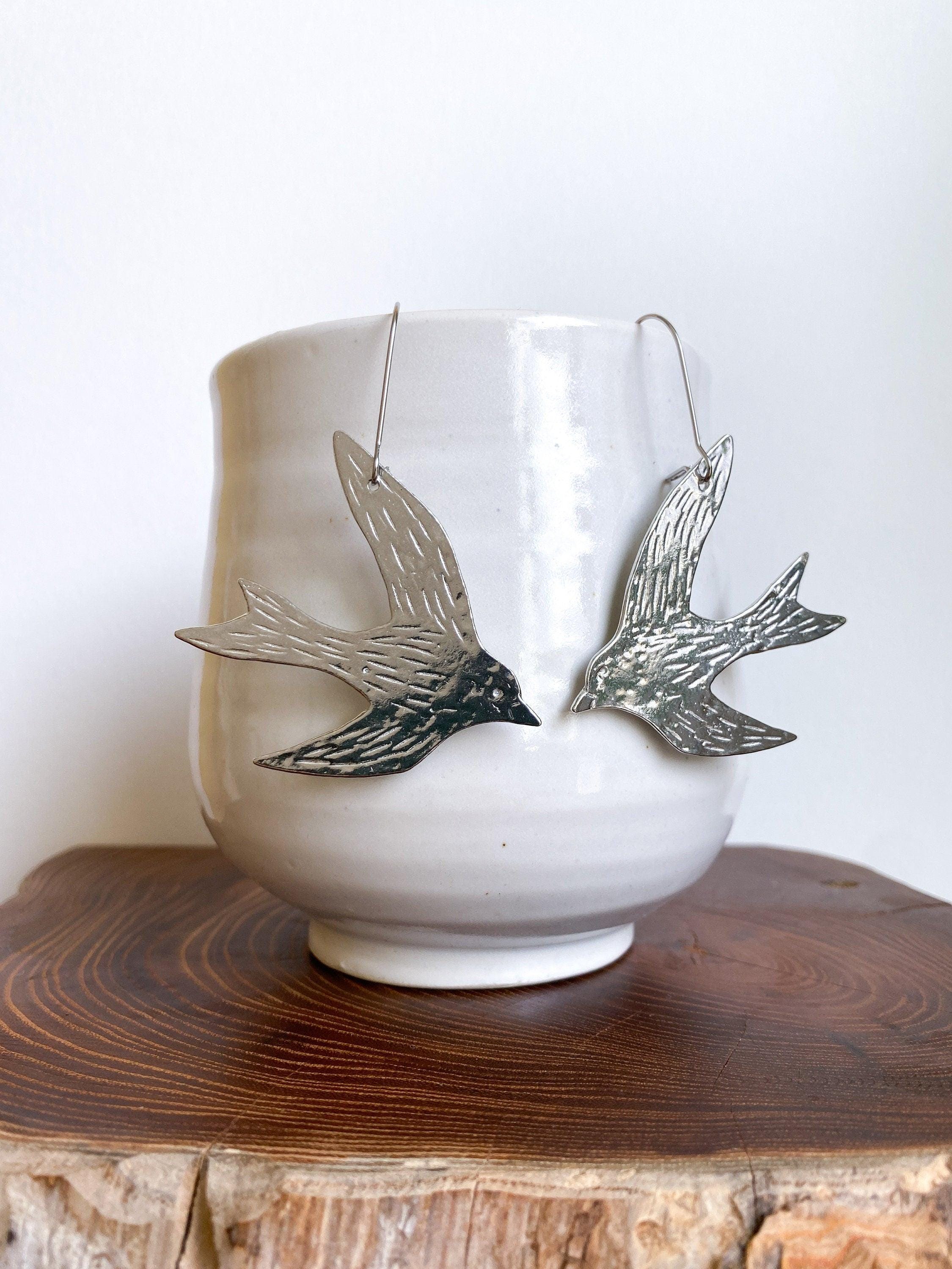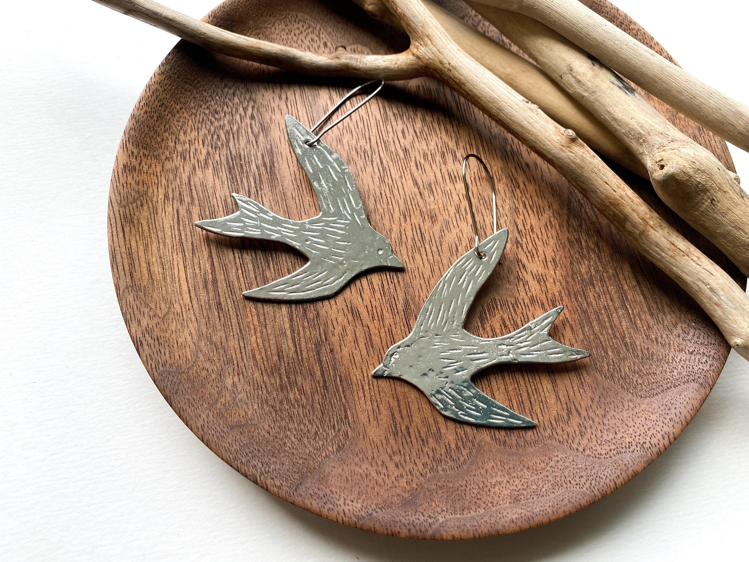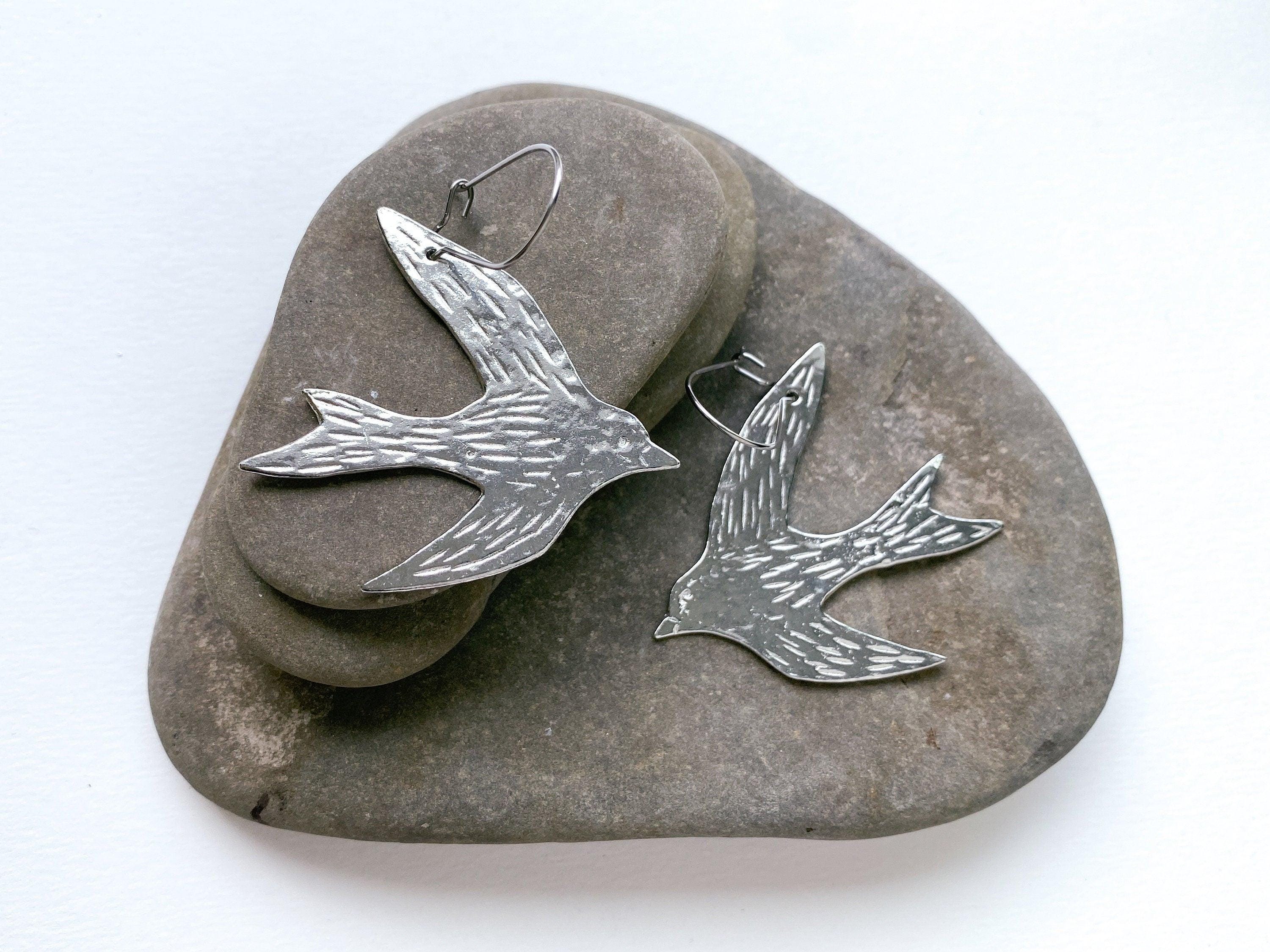 These large swift or swallow bird shaped earrings are pretty and fun, with a unique textured finish that will vary slightly from pair to pair.