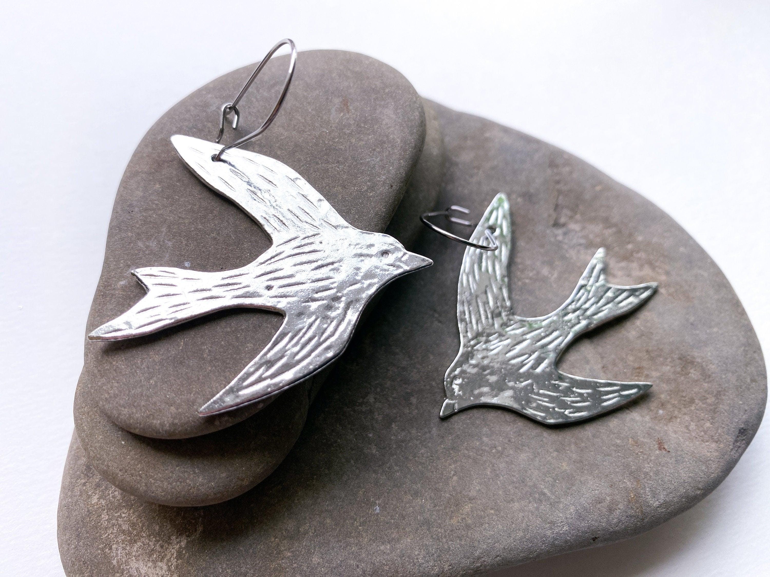 Pewter Large Bird Earrings, Modern Pewter Lead Free, Handmade Earrings