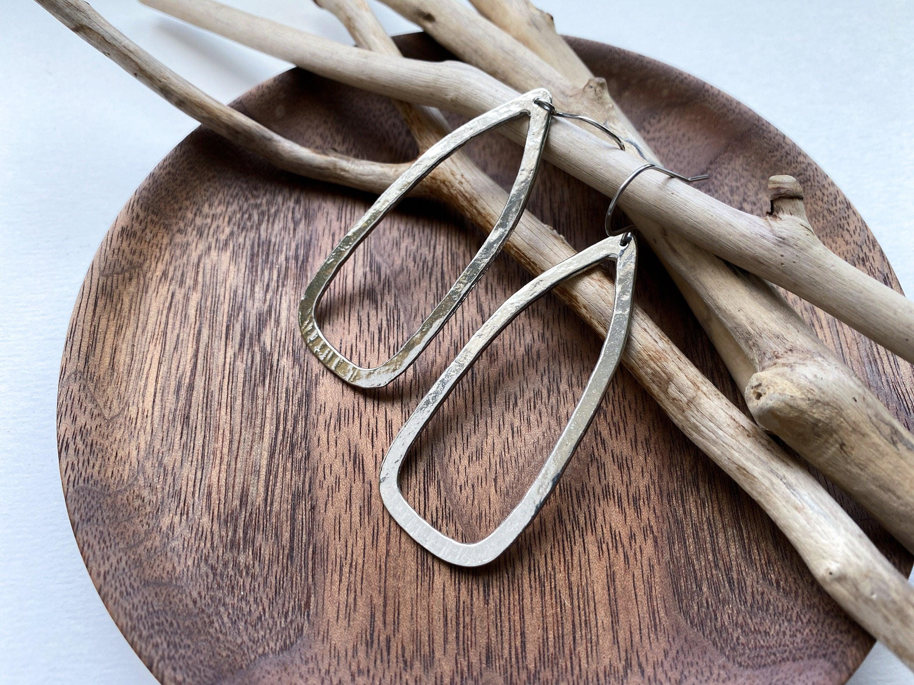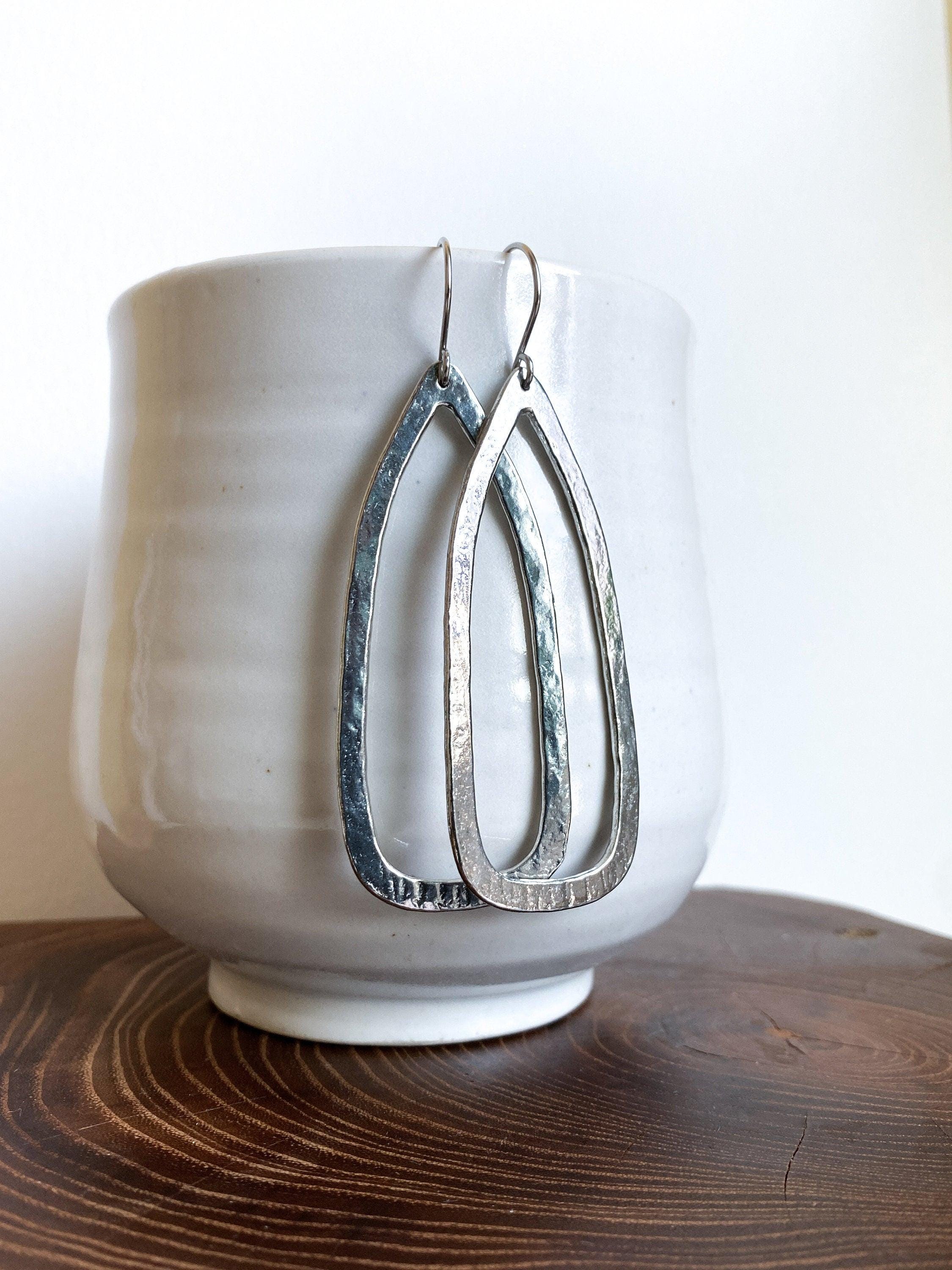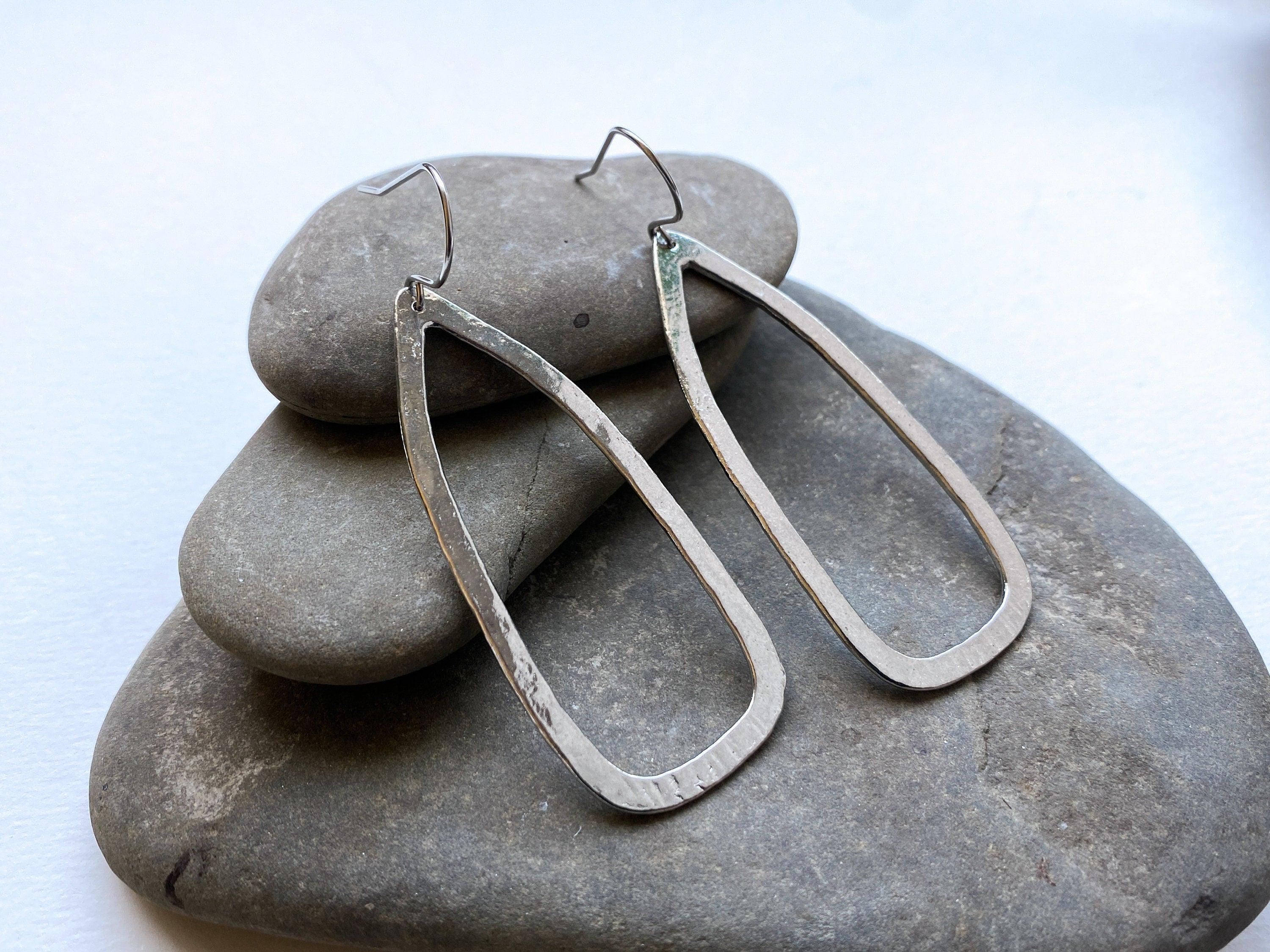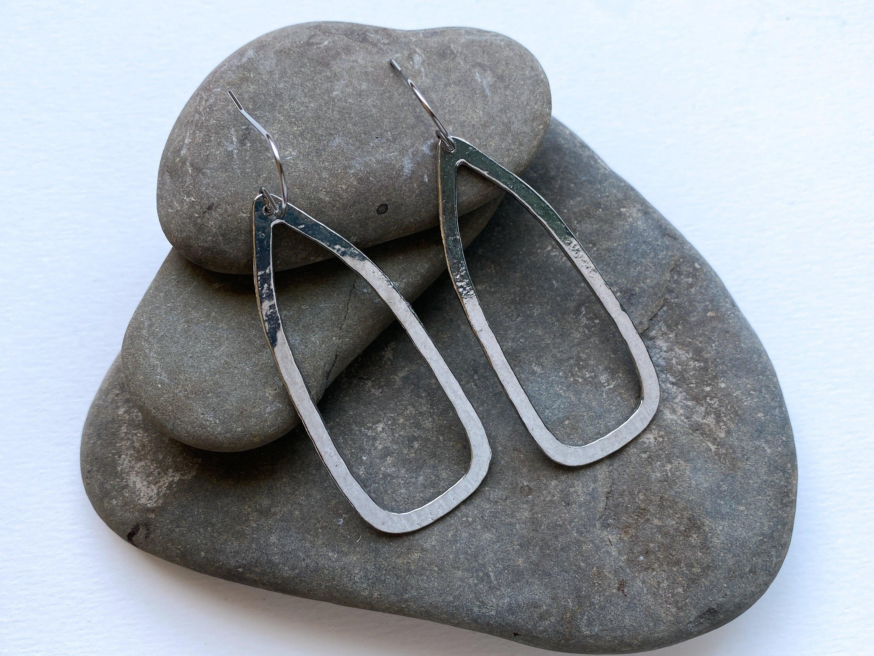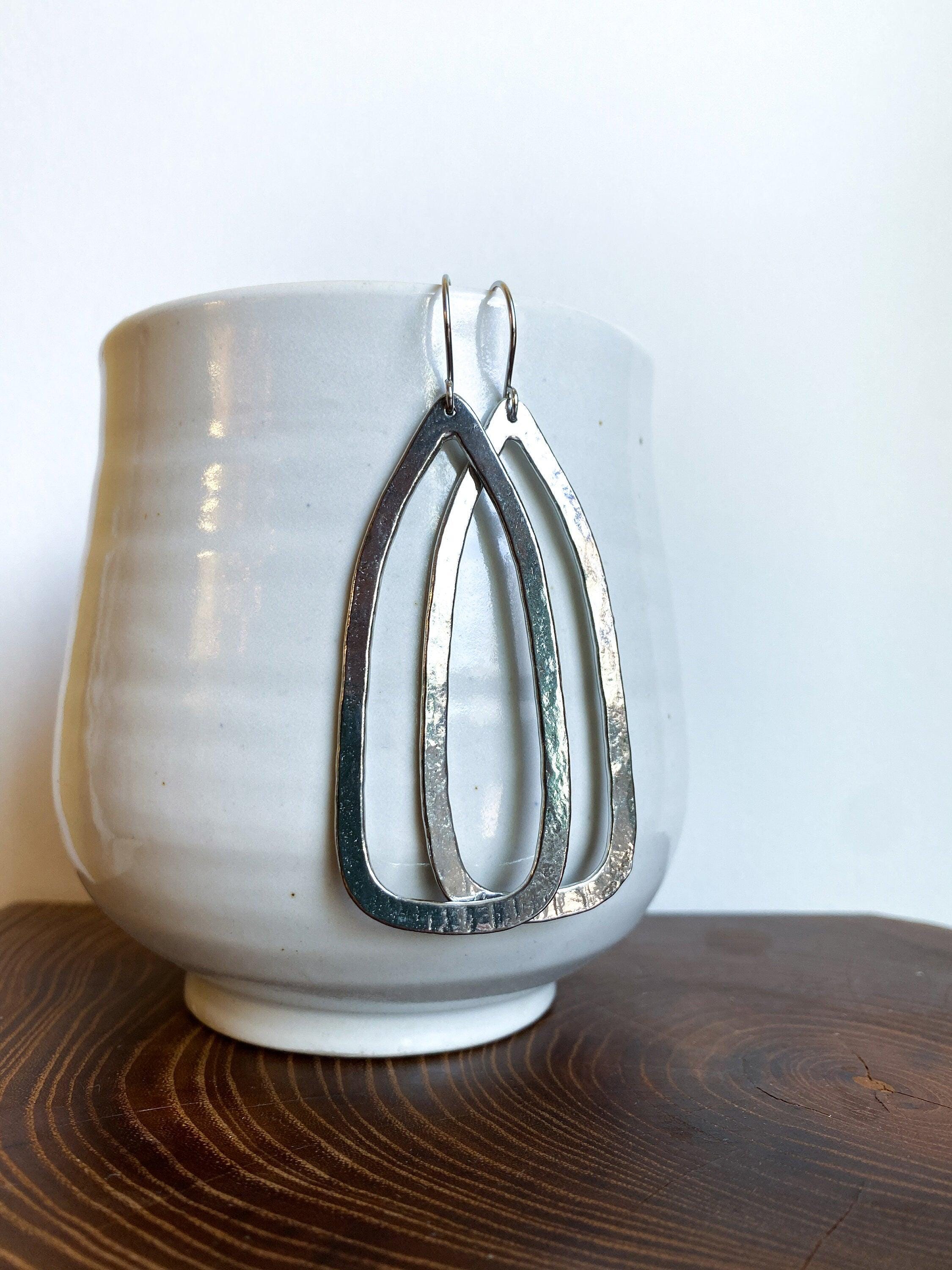 These handmade pewter earrings are shiny and lightweight, perfect for a bold everyday look. Our modern pewter is lead free, and the earrings dangle from stainless steel ear wires.