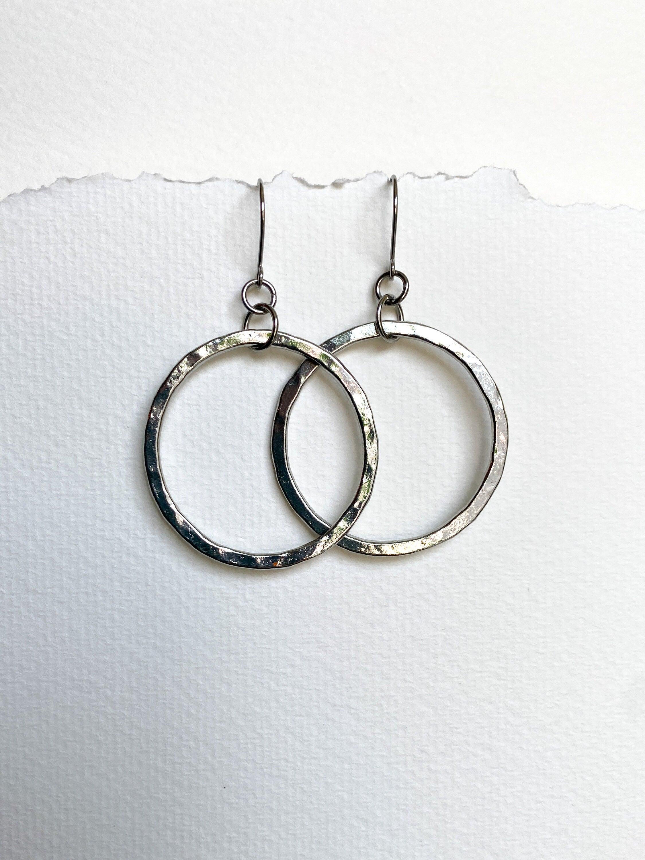 These round earrings are geometric and modern, with a unique hammered texture finish.