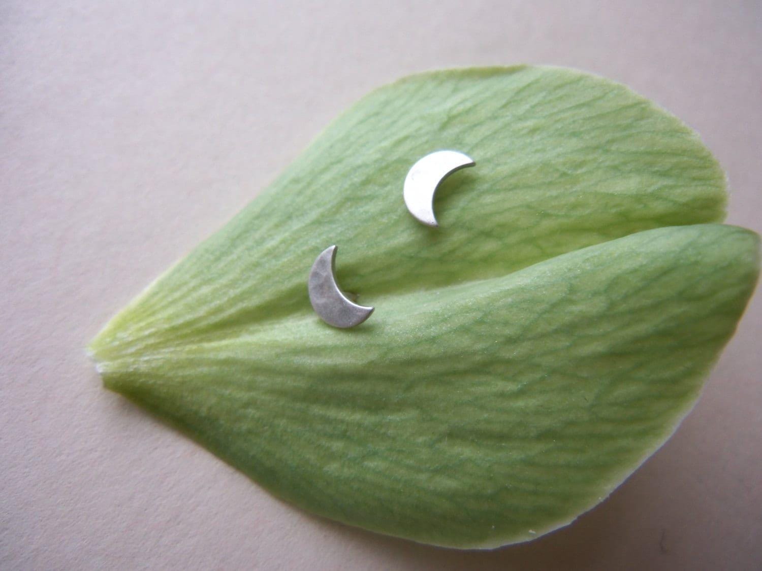 Sweet & Small Crescent moon stud earrings perfect for everyday wear. I make them entirely by hand. These have a soft hand hammered texture to mimic a lunar surface. A variety of size options are available. Each pair comes with a mini polishing kit. May vary slightly from photos due to unique handmade nature.