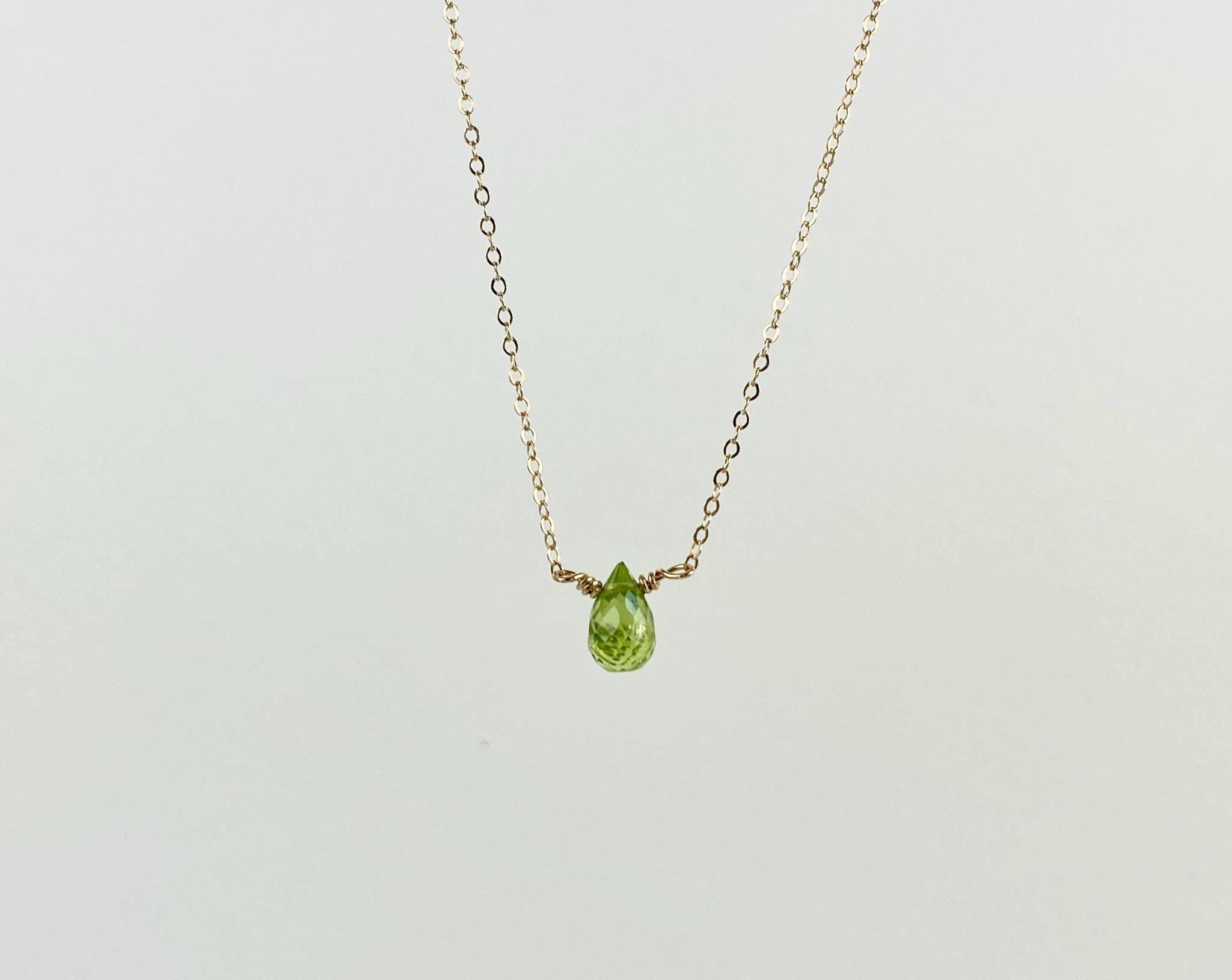 A delicate 14k gold fill chain with a faceted bright green natural peridot gemstone. Peridot is the birthstone of August. The stone is a colorful green teardrop shape. These are natural, un-dyed stones. They may have natural marks and inclusions that vary slightly.