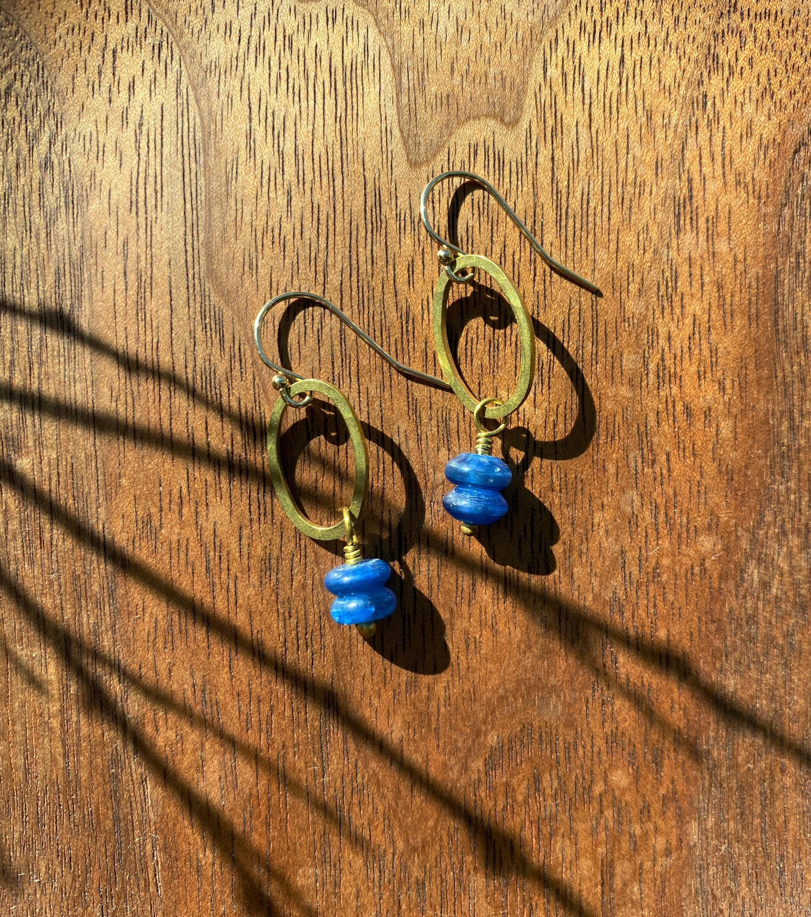 Little Blue Oval Earrings, Kyanite and Brass Dainty Hammered Oval Earrings, natural blue gemstones, 14k gold fill hooks