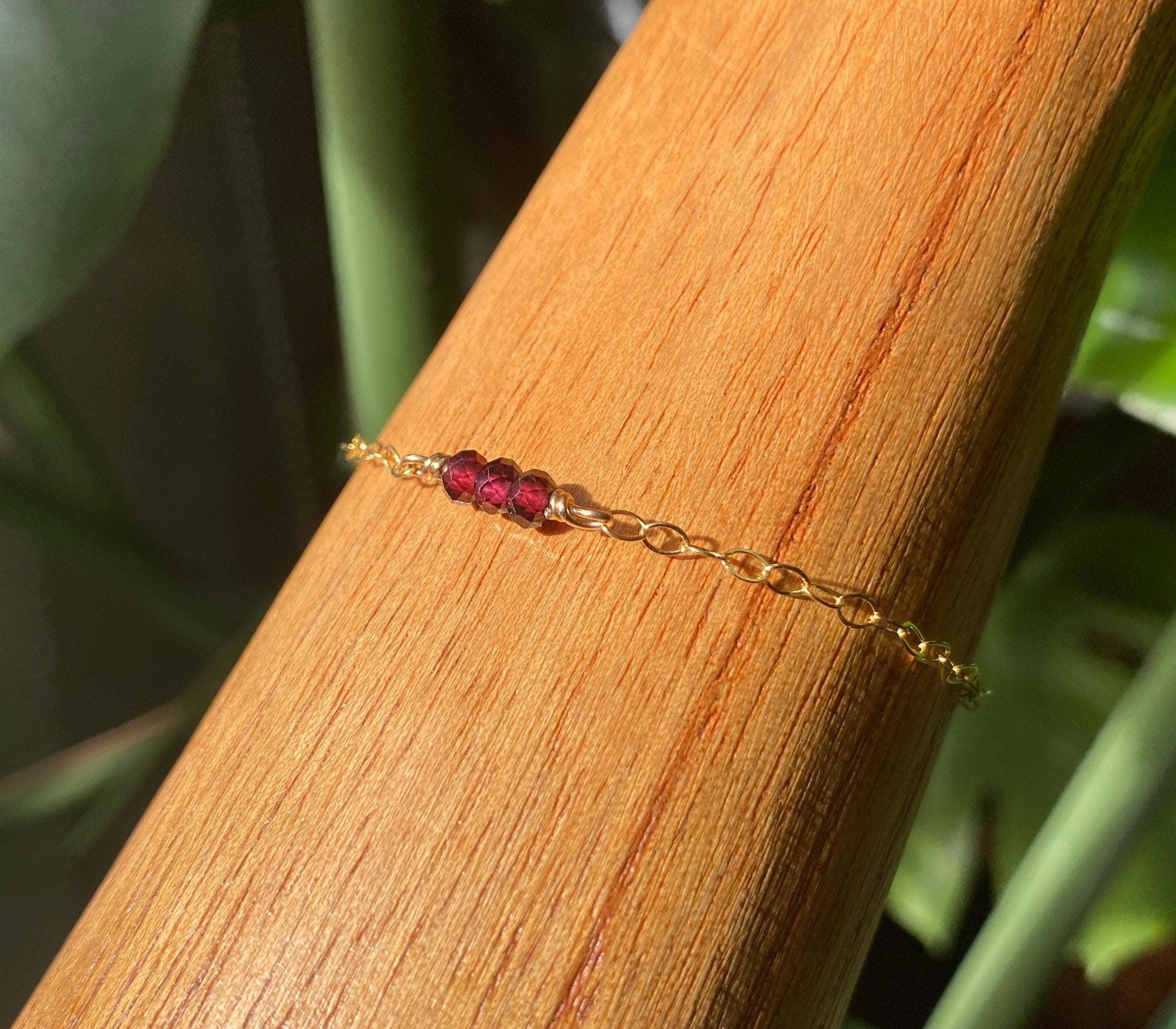 Elegant, unique gold and red garnet gemstone bracelet. 3 dainty faceted natural garnet gemstone beads on an adjustable gold fill bracelet. Delicate gold fill cable chain with a lobster clasp. Easy to wear or gift.