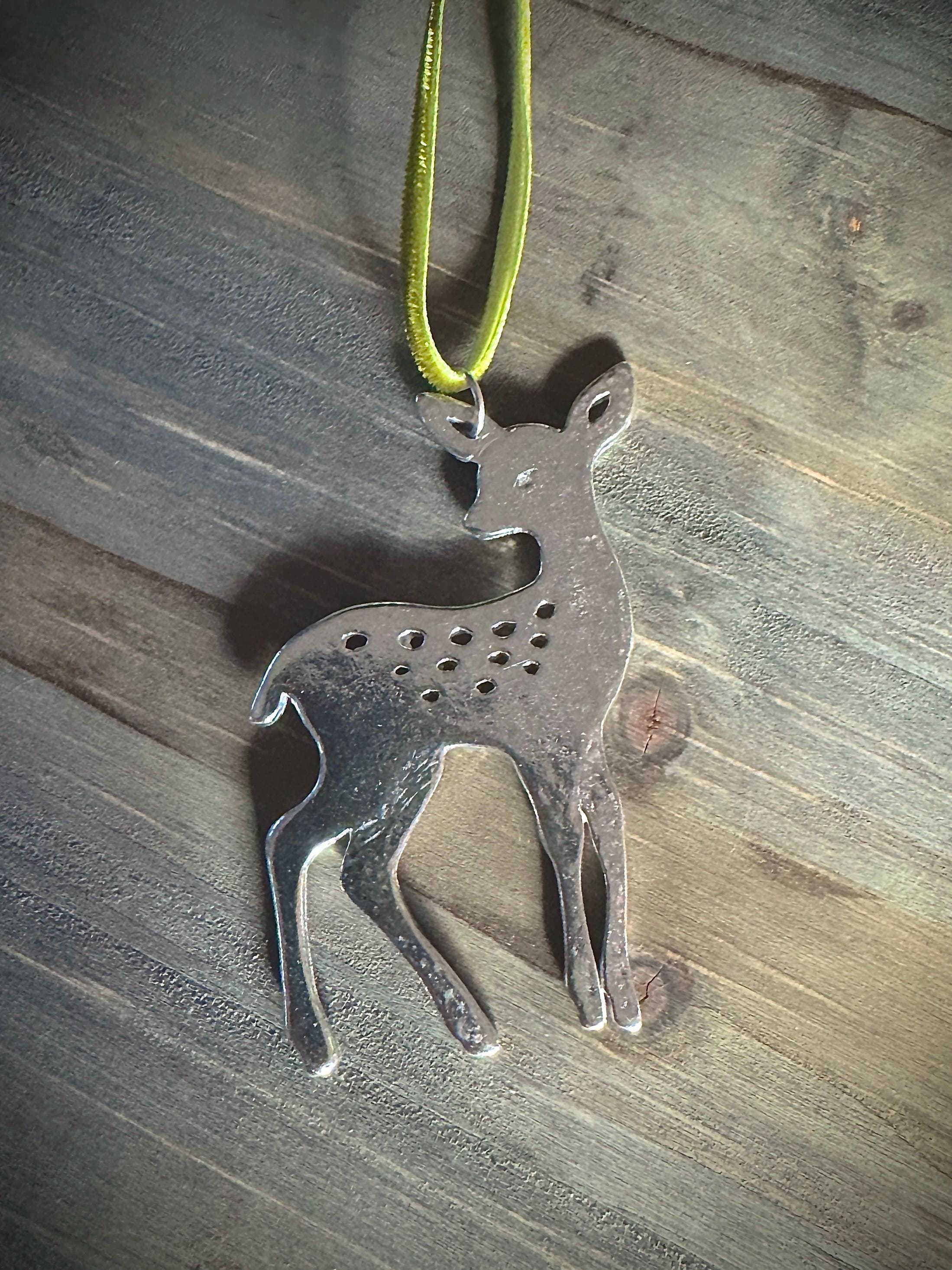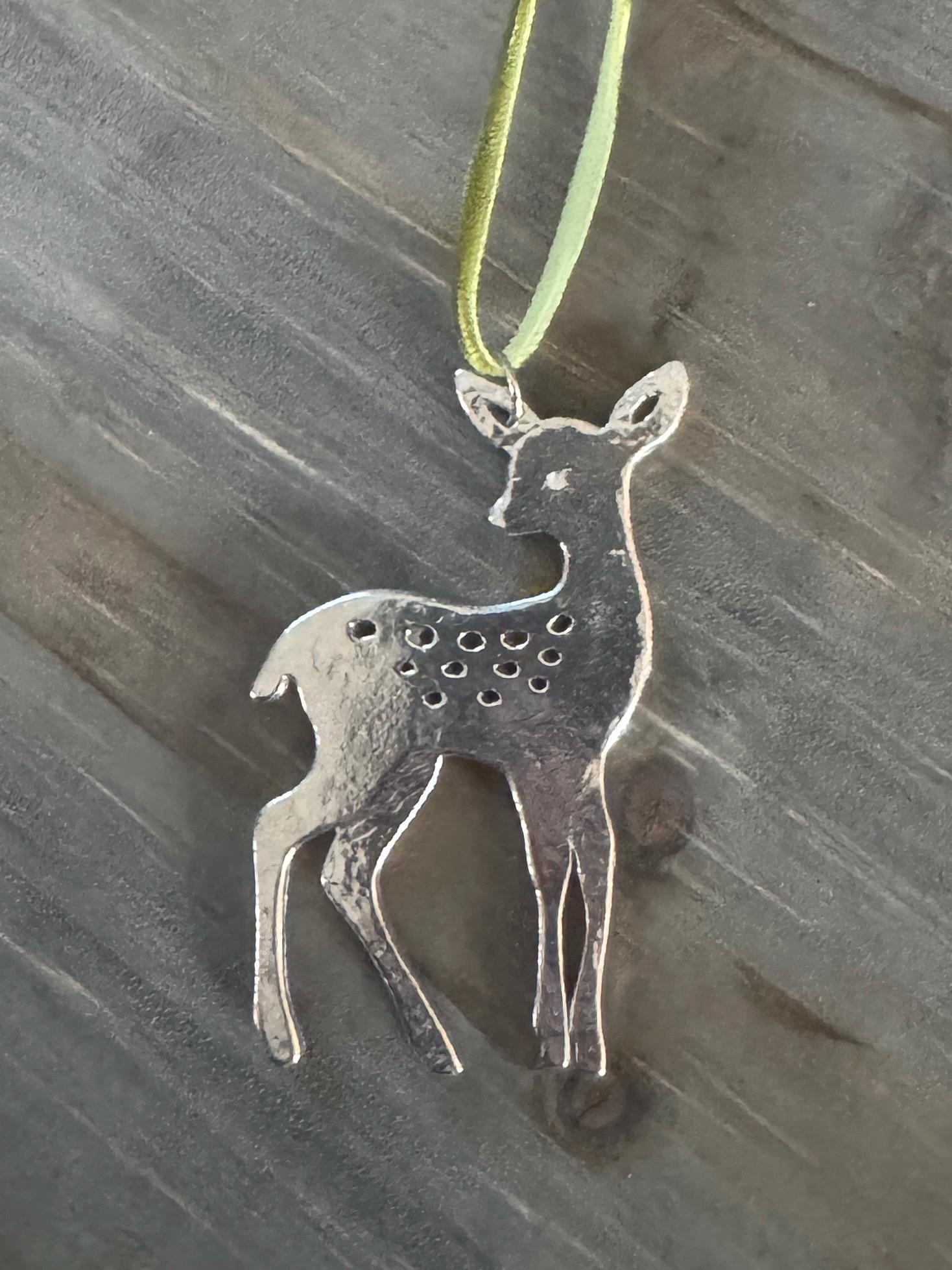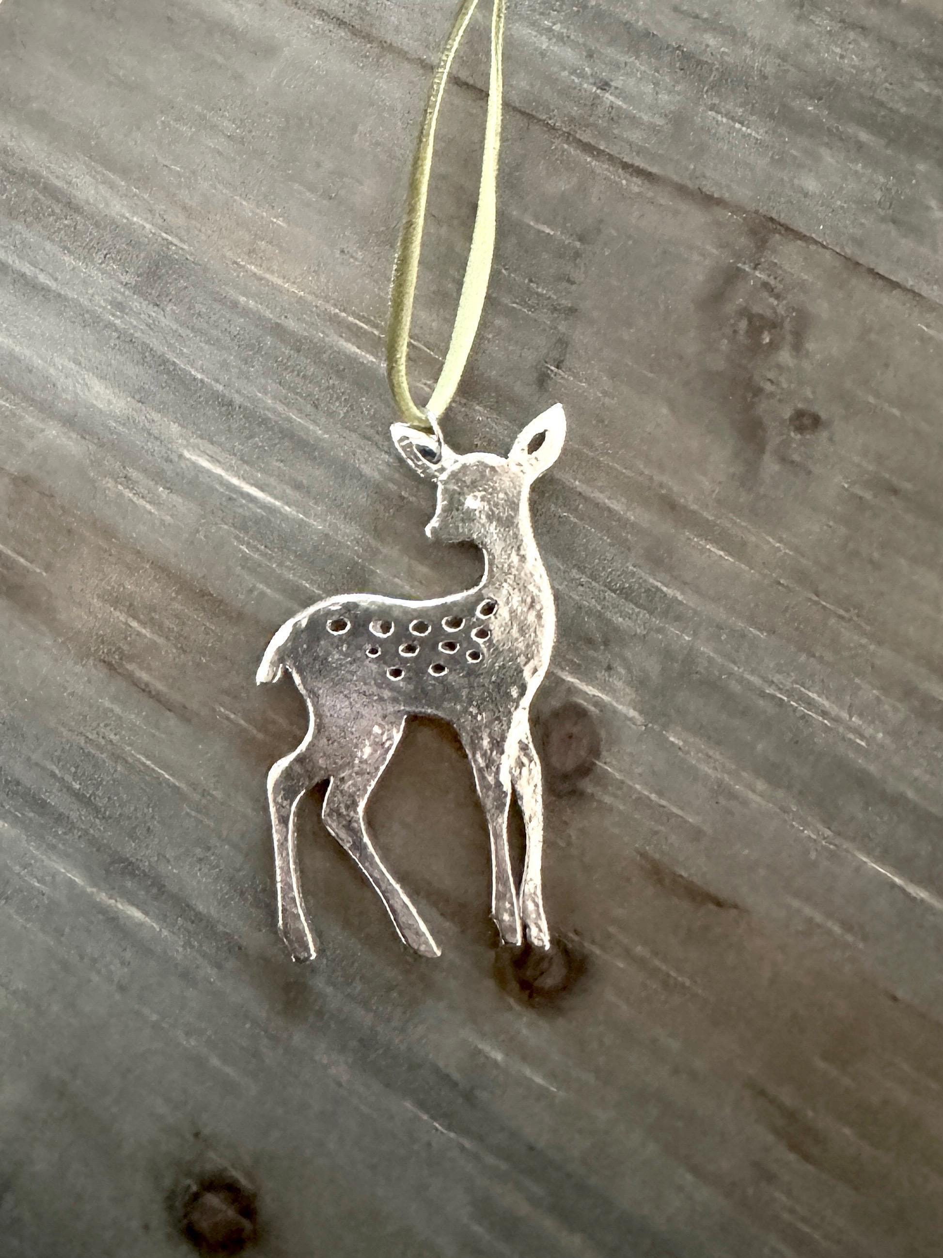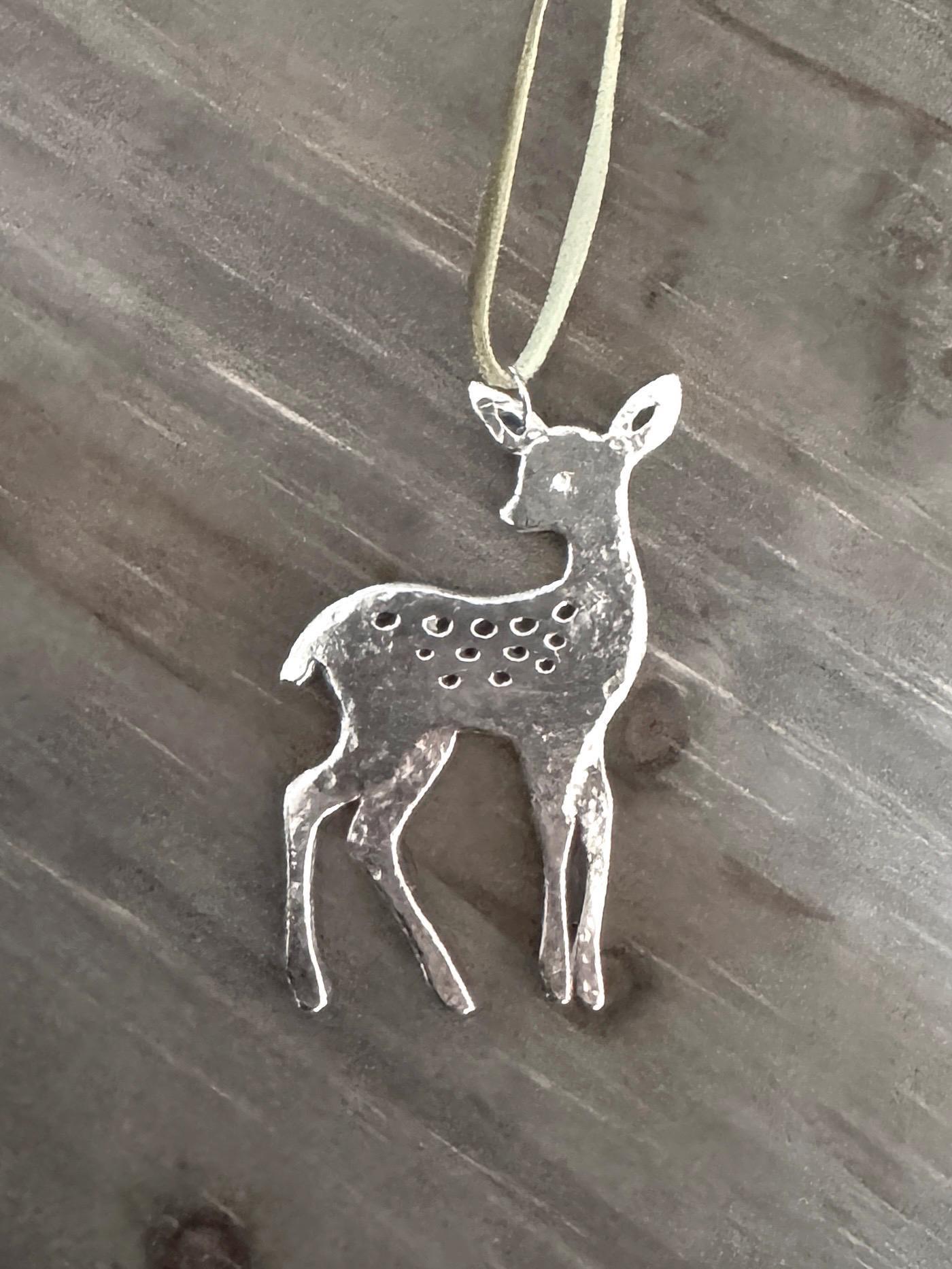 Pretty silver color in solid pewter and hanging from a pretty green velvet ribbon. Each side is textured and hand tooled too add detail to the Deer. These are handmade and each will vary slightly.