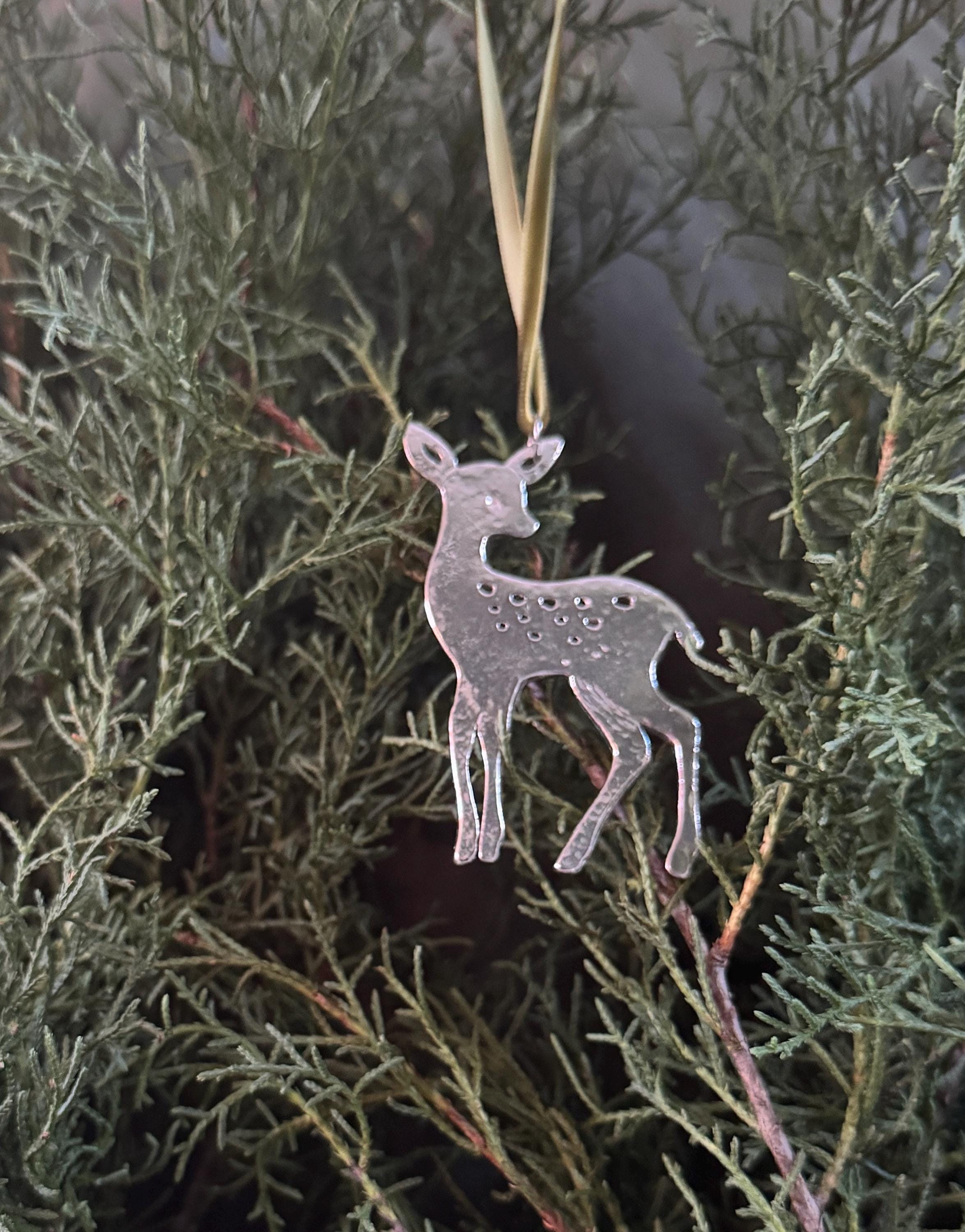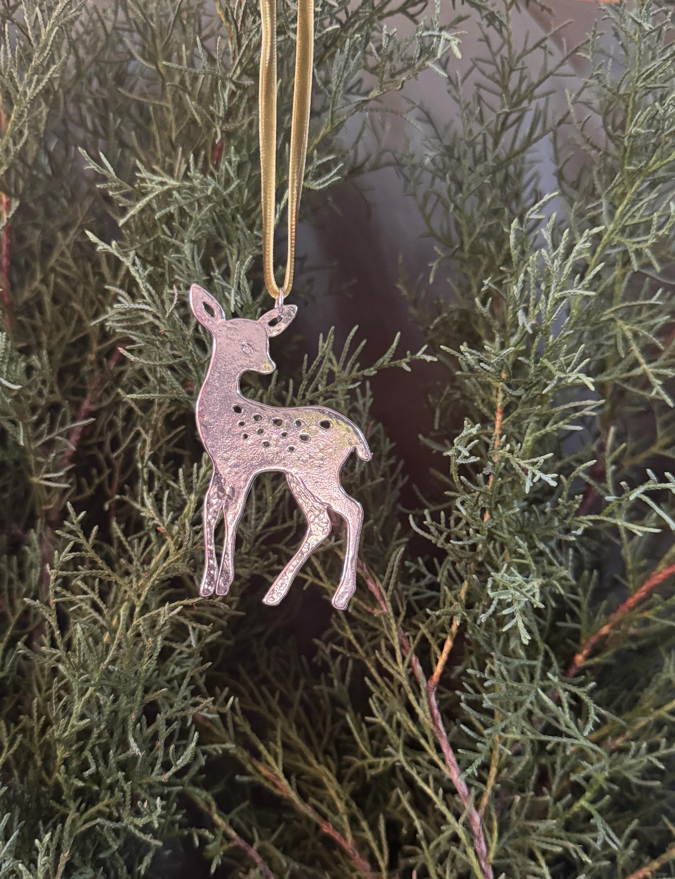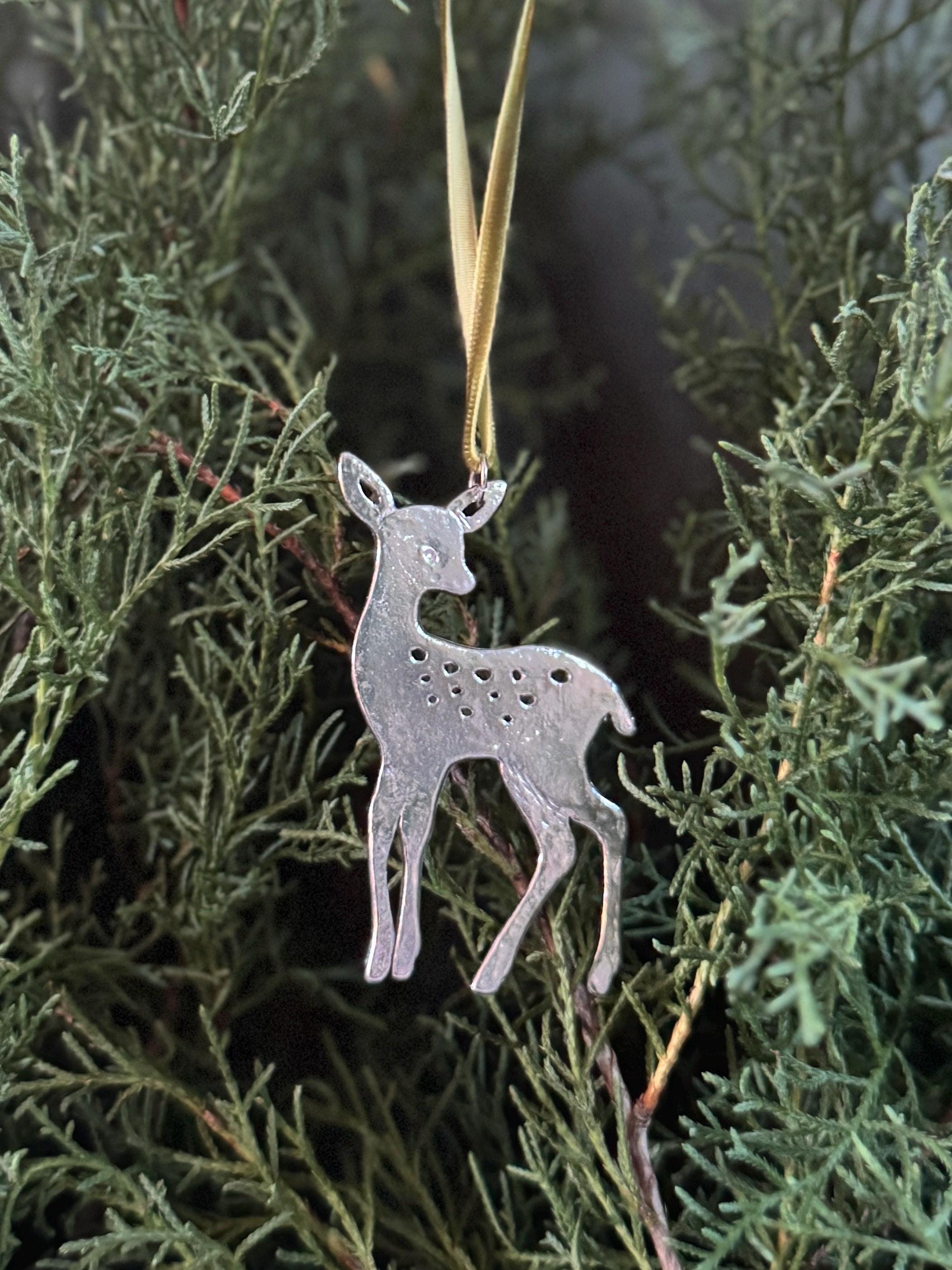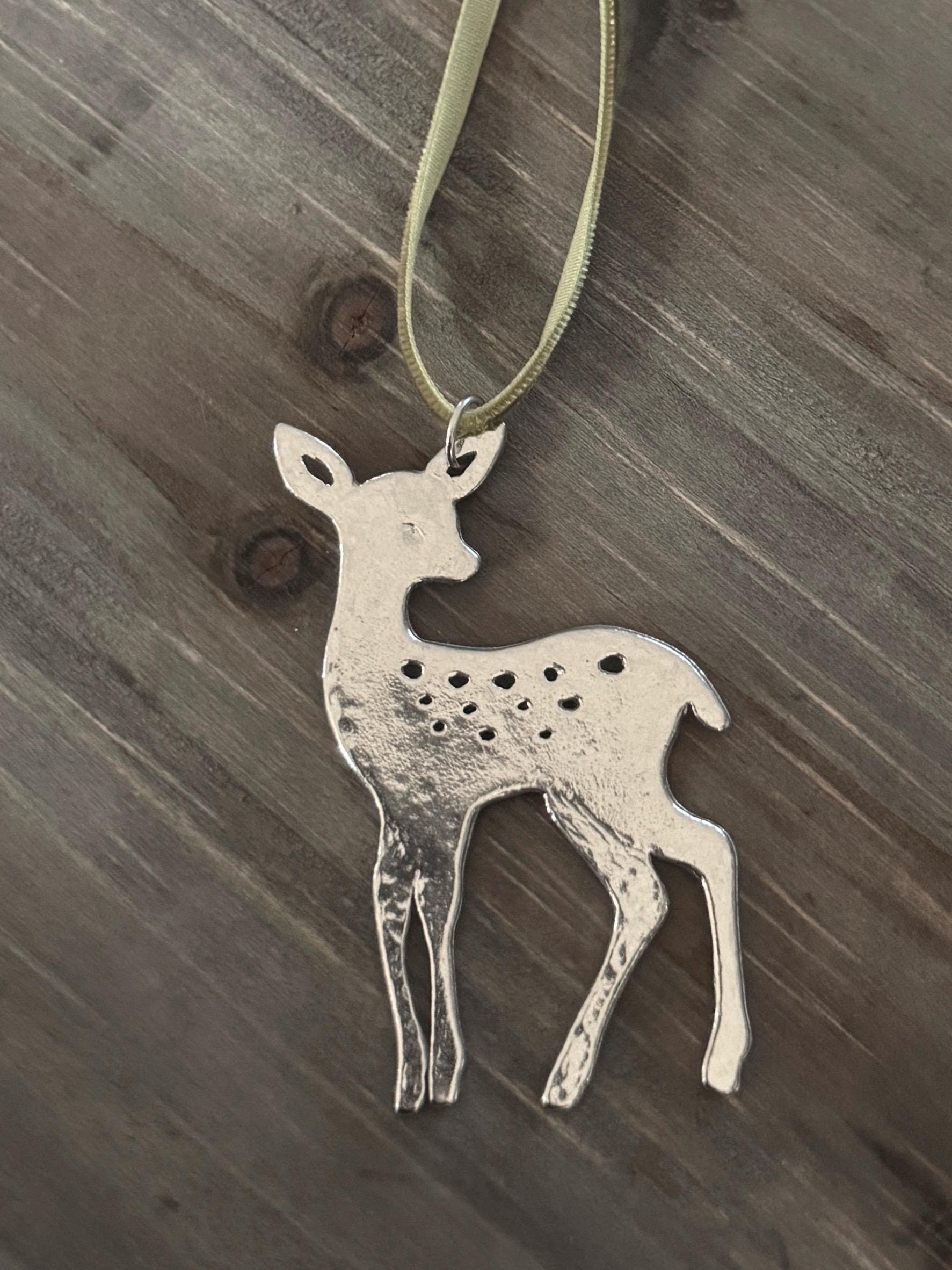 Pretty silver color in solid pewter and hanging from a pretty green velvet ribbon. Each side is textured and hand tooled too add detail to the Deer. These are handmade and each will vary slightly.