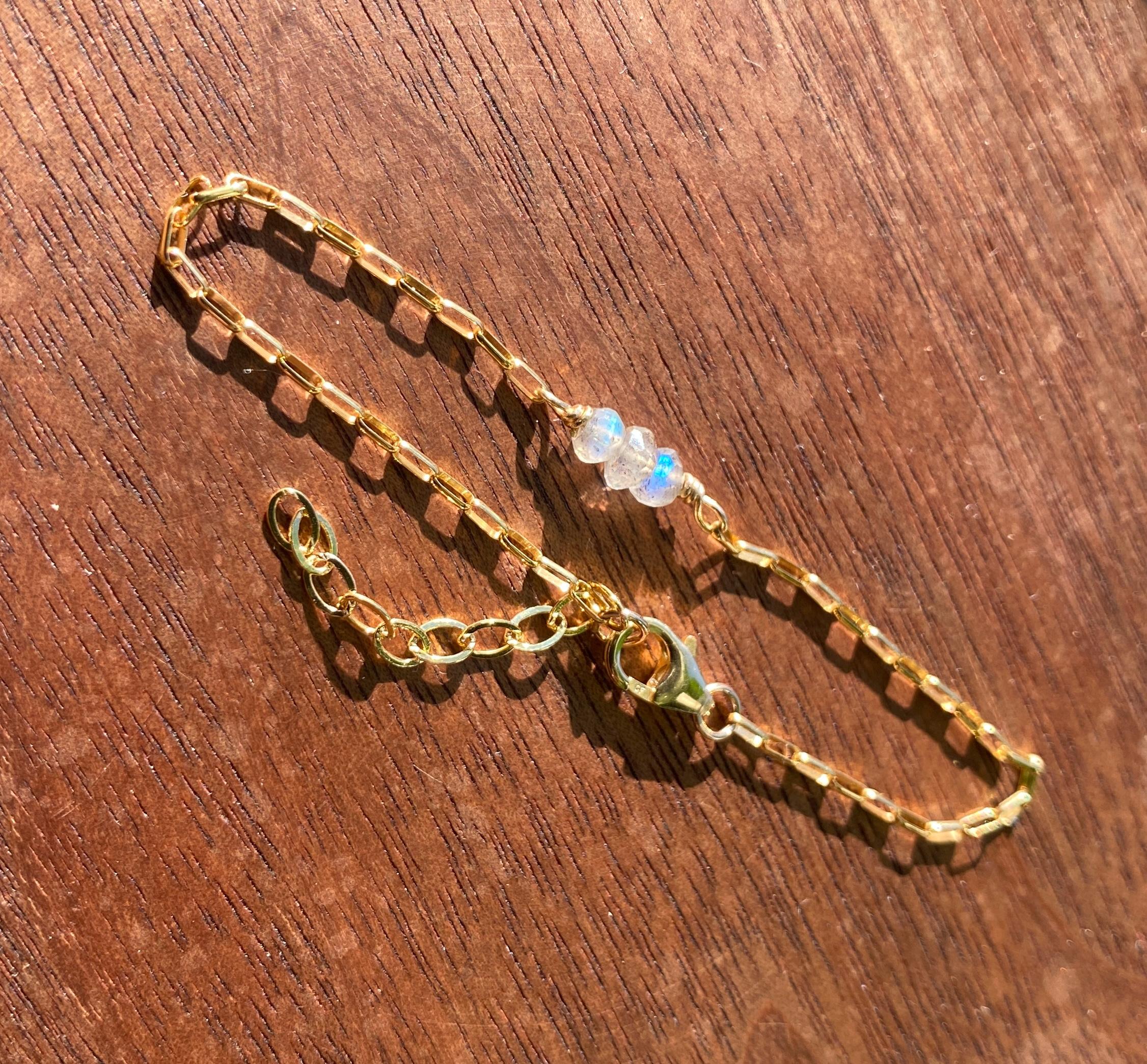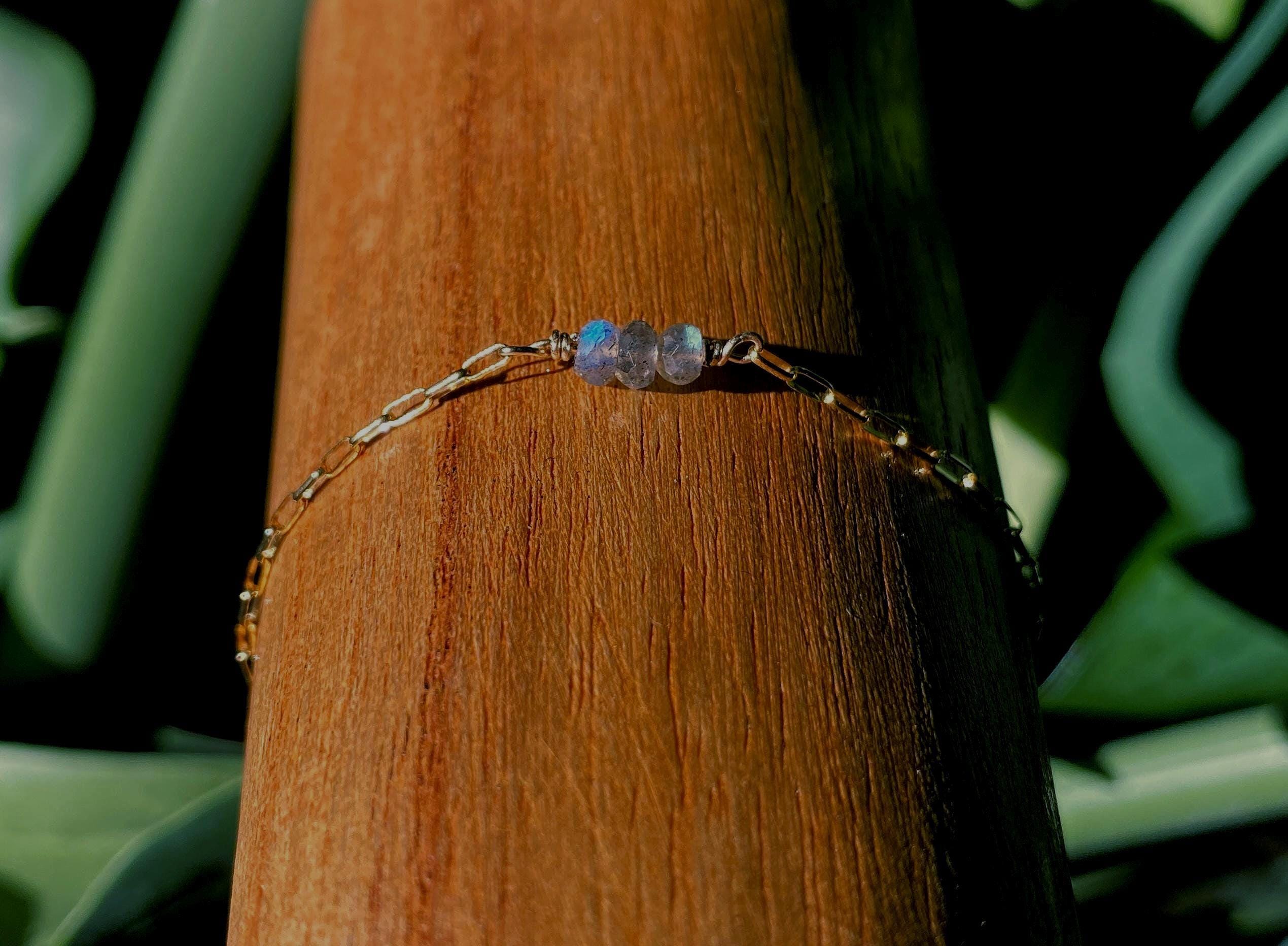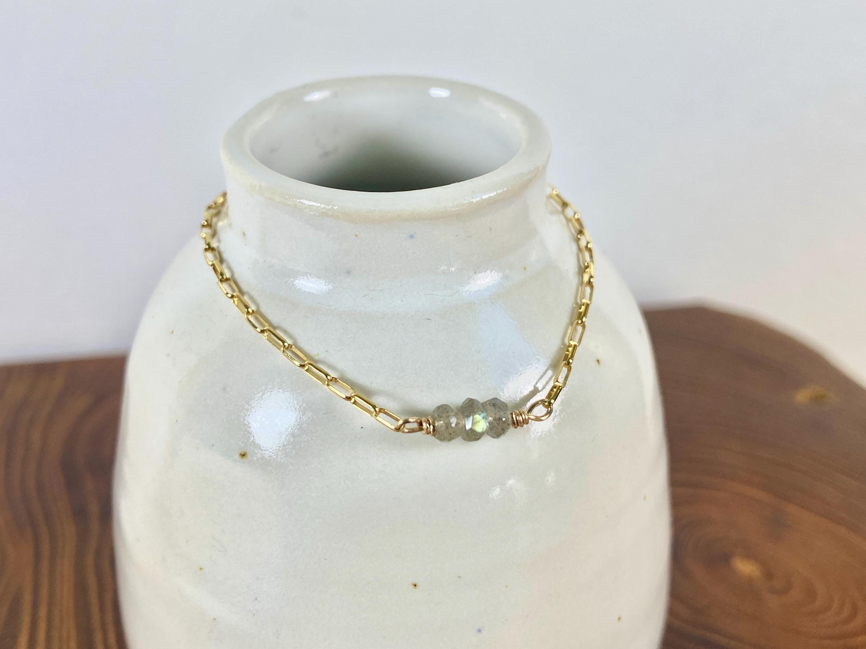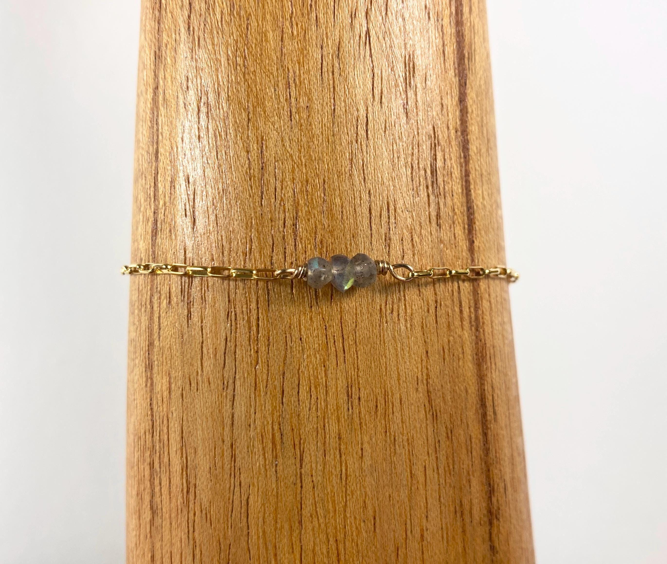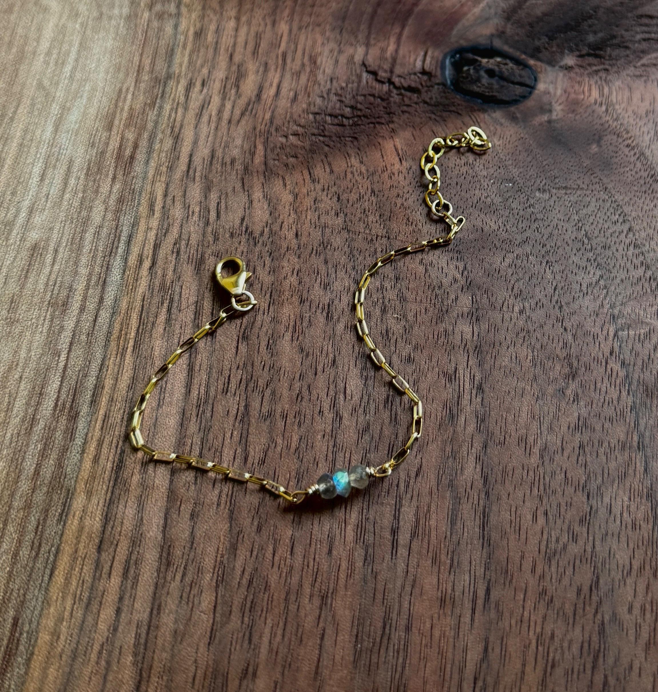 Elegant, unique gold and Labradorite bracelet. 3 dainty faceted natural labradorite gemstone beads on an adjustable gold fill bracelet. Grey stones with blue/green flash. Delicate gold fill paperclip chain with a lobster clasp. Easy to wear or gift.