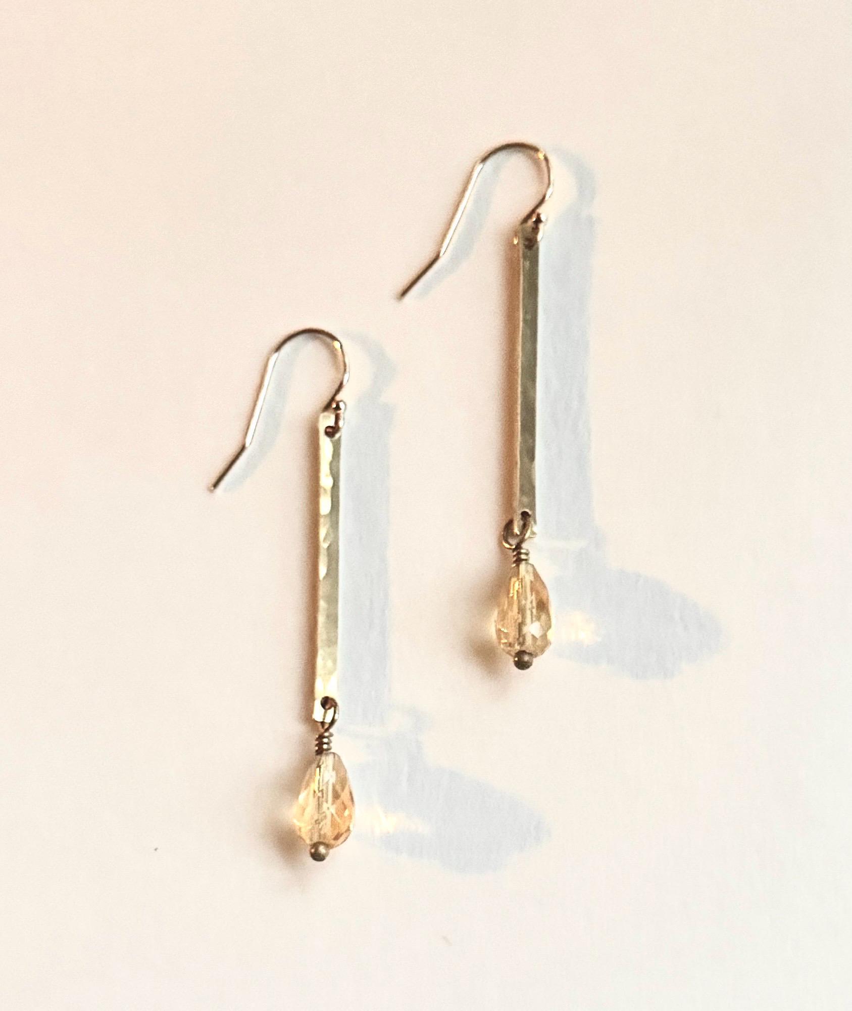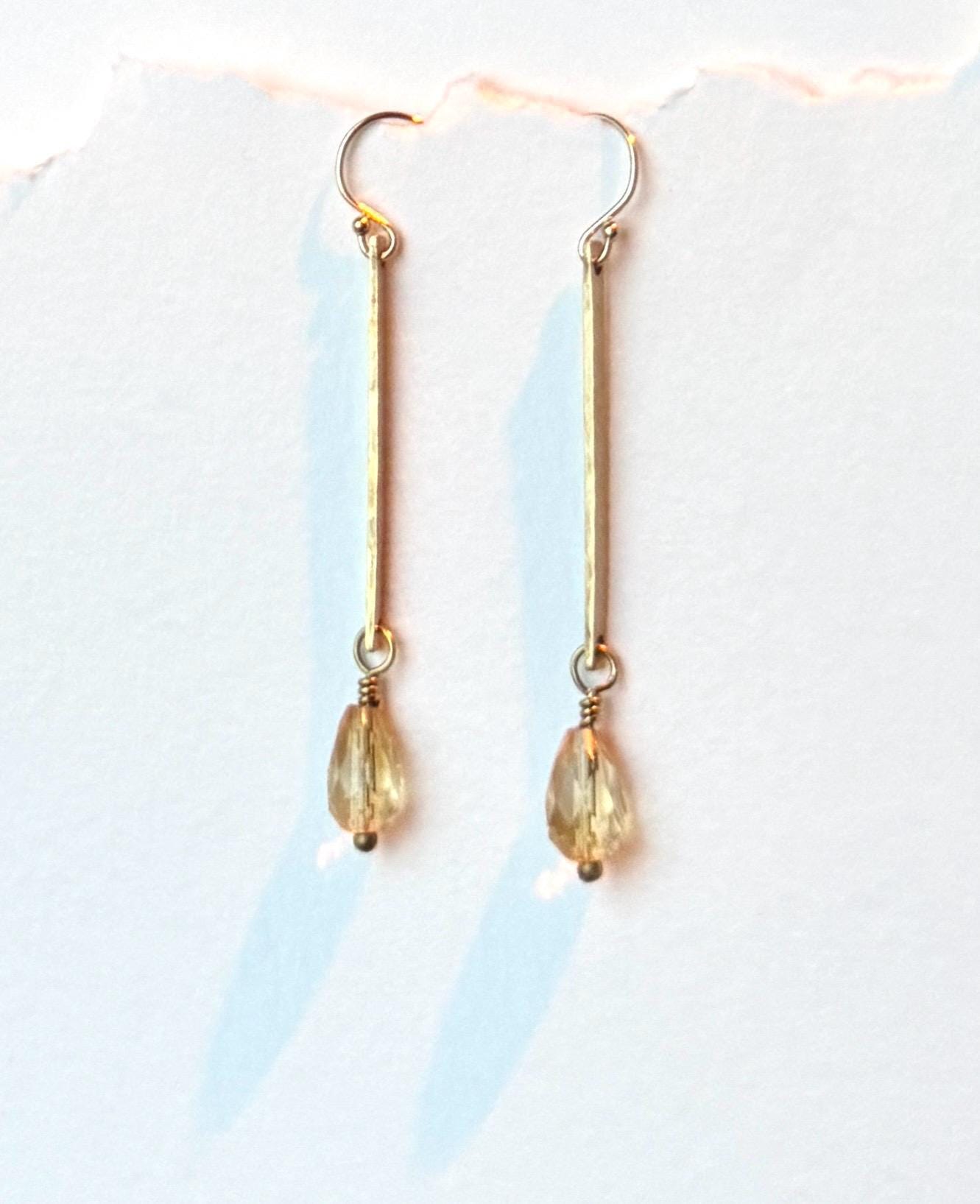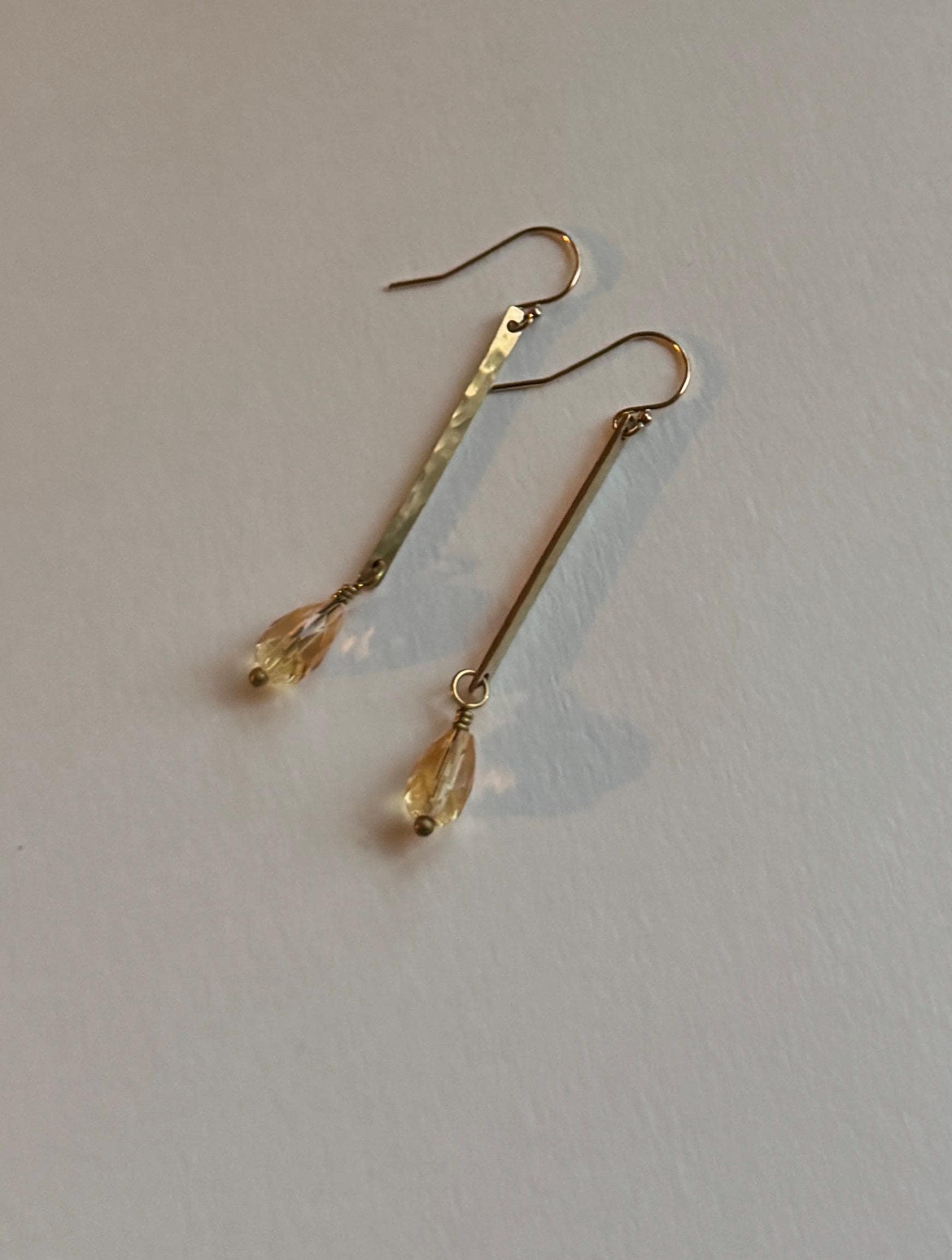 Lightly hammered brass long rectangle earrings with pretty Citrine faceted teardrop gemstones that catch the light with a warm sparkle. These are lightweight and easy to wear everyday. Citrine is the birthstone of November, perfect for a November birthday gift. Elegant, Simple, Brass Hammered Earrings. These dangle from 14k gold-fill hooks. Easy to wear and gift.
