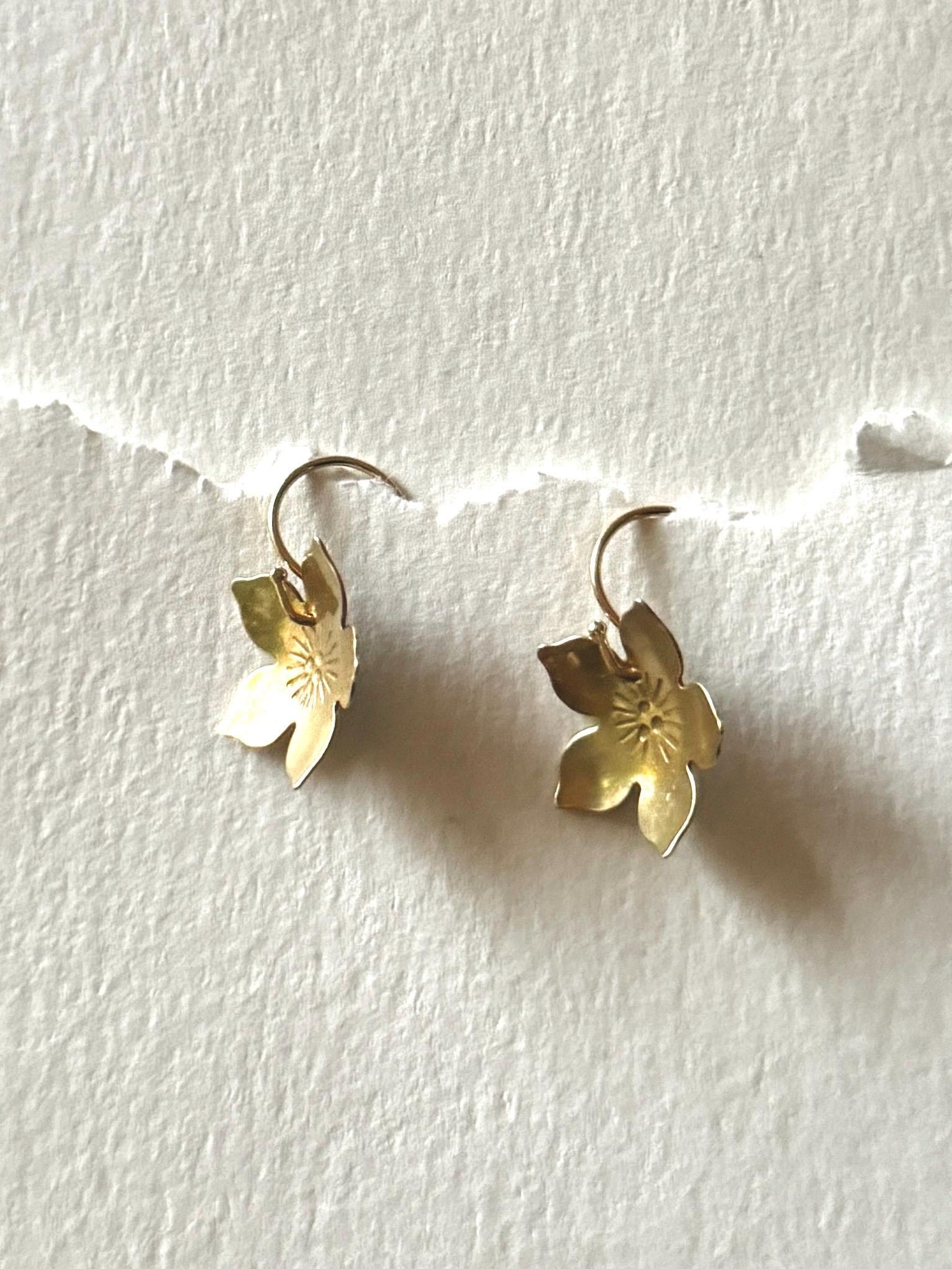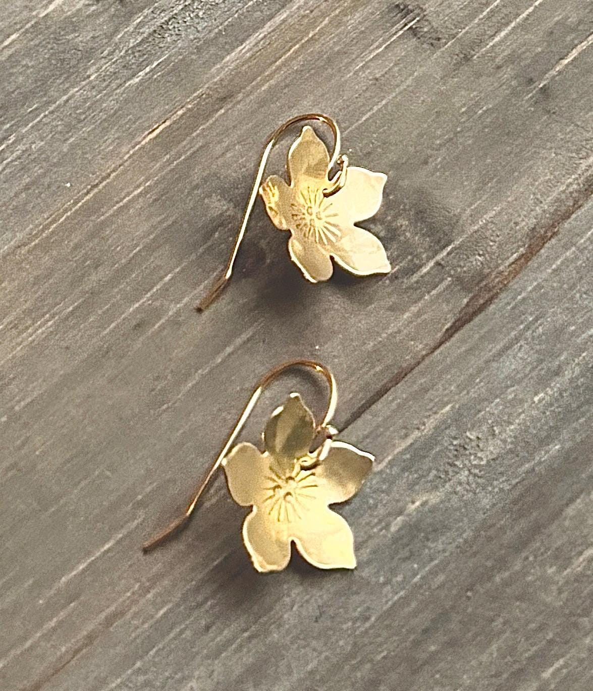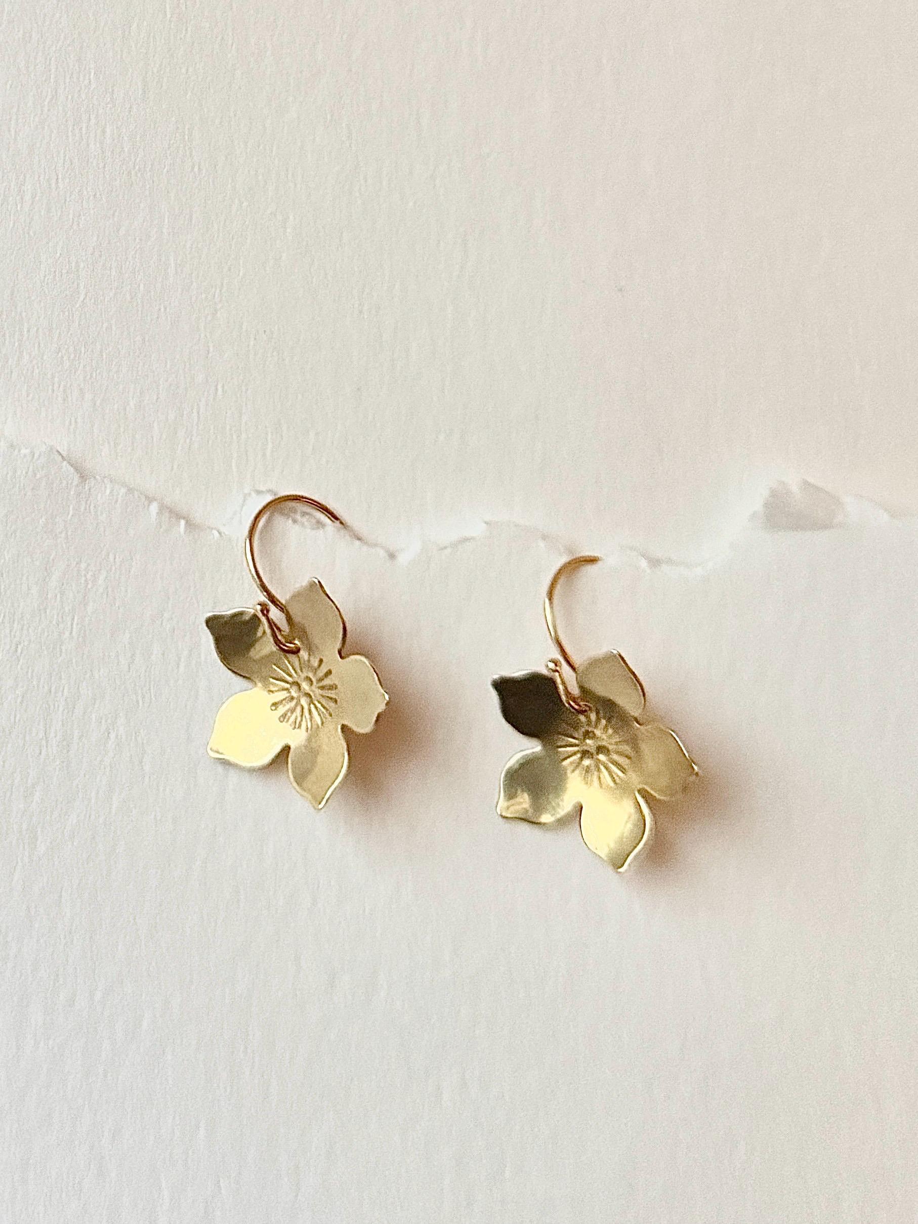Pretty Brass Flower Earrings, Pretty Handmade gold Blooms. 14K gold fill hooks.