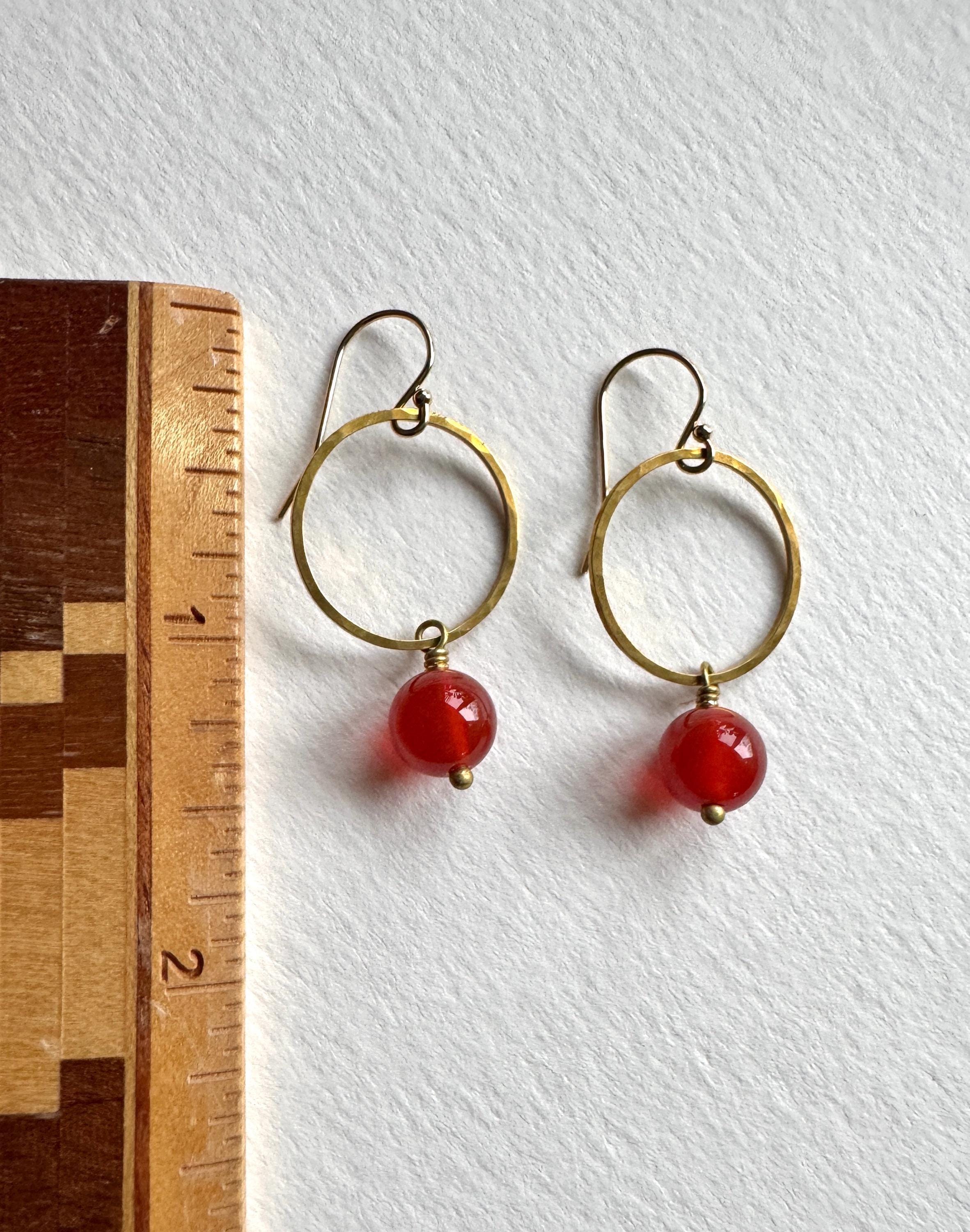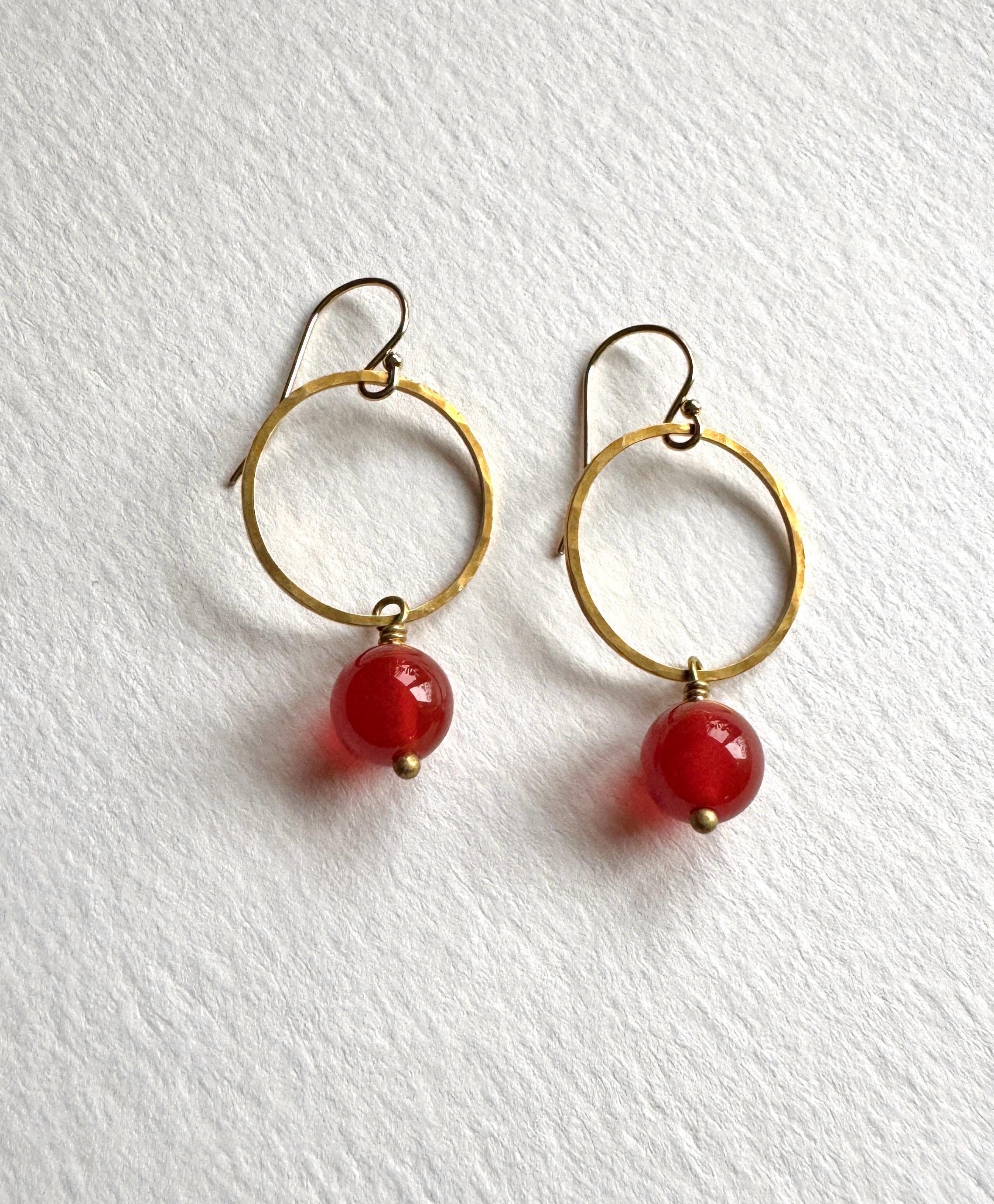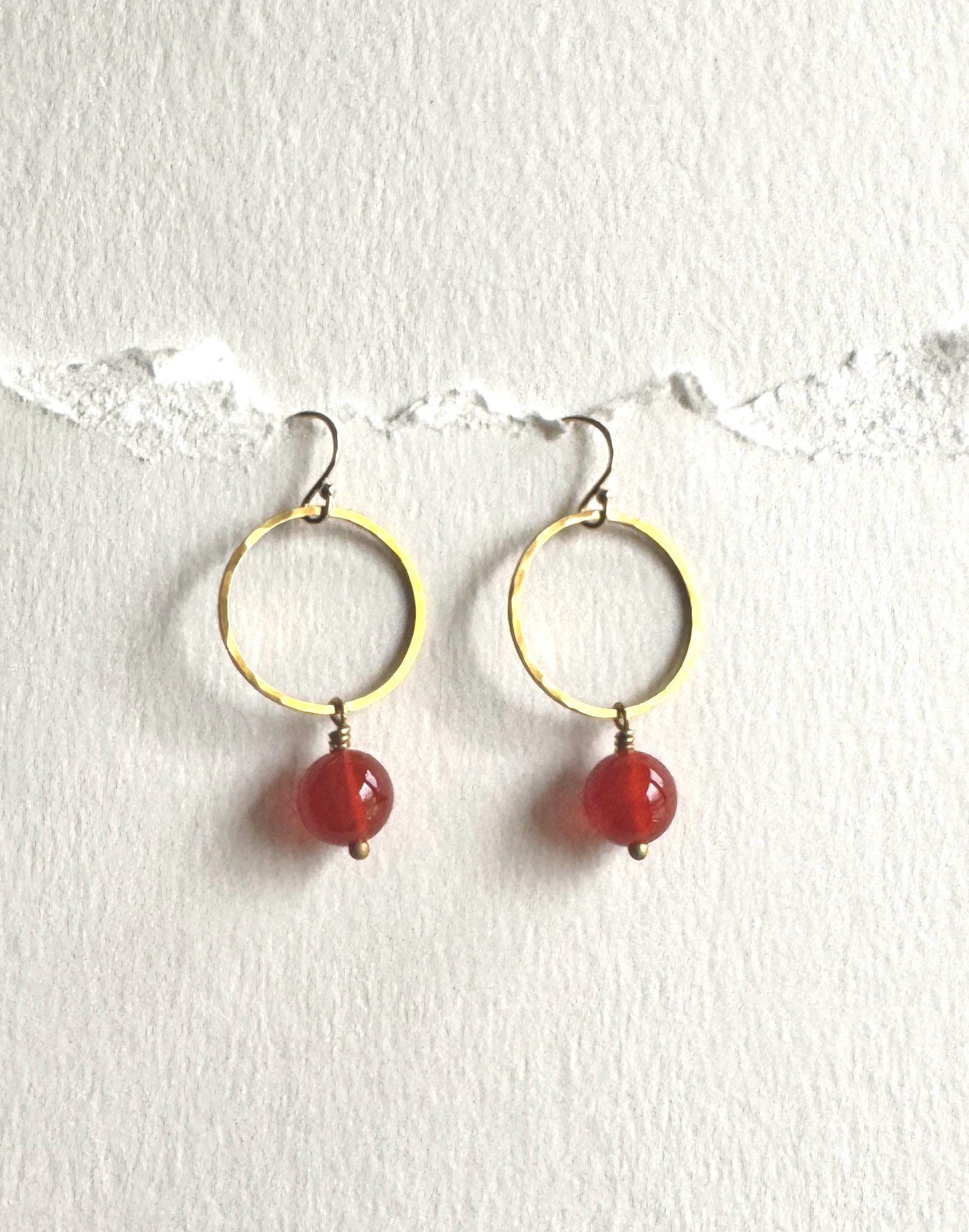 Lightly hammered brass round loop or hoop earrings with pretty Carnelian round gemstones. Pretty and easy to wear everyday. Elegant, Simple, Brass Hammered Earrings. These dangle from 14k gold-fill hooks. Easy to wear and gift.
