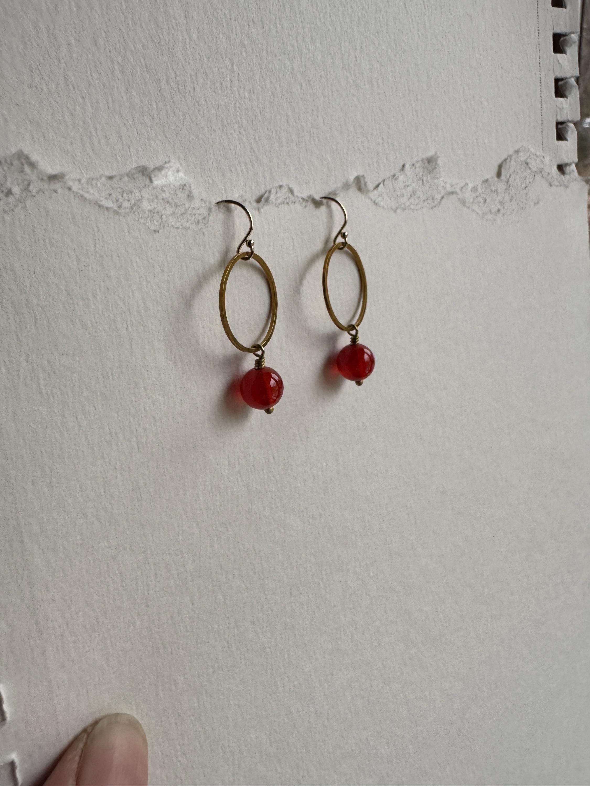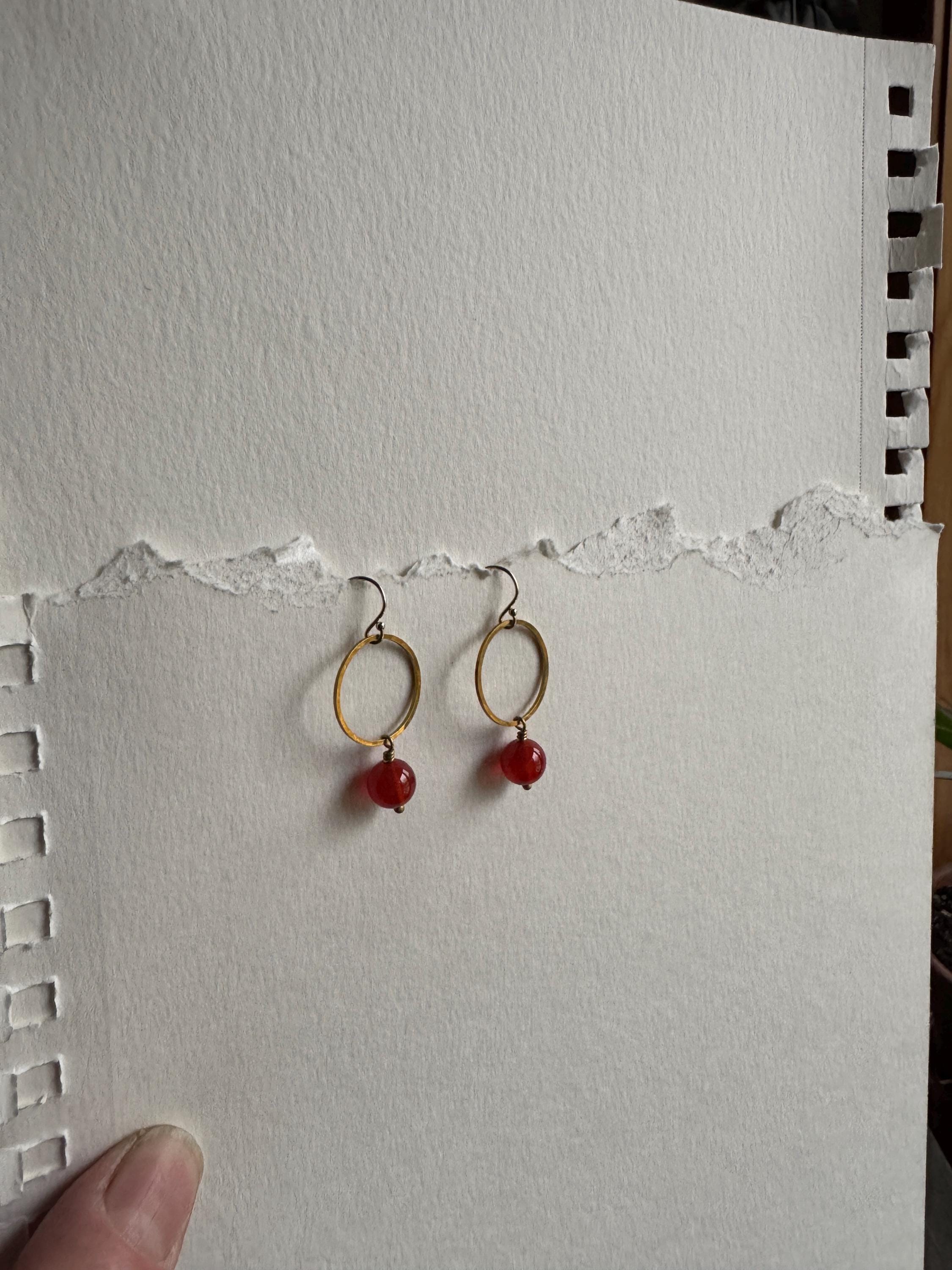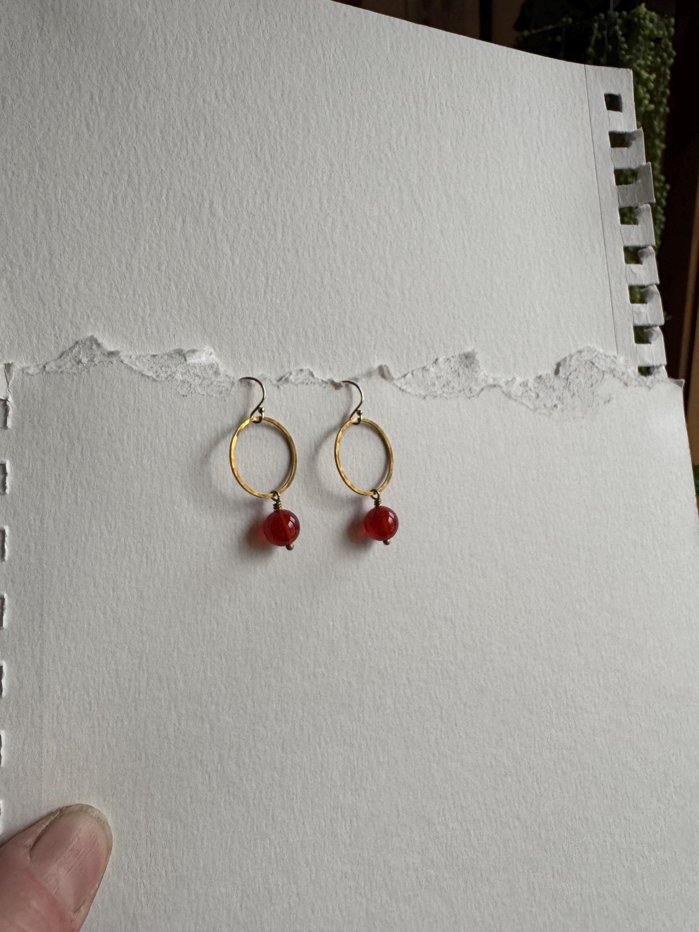 Lightly hammered brass round loop or hoop earrings with pretty Carnelian round gemstones. Pretty and easy to wear everyday. Elegant, Simple, Brass Hammered Earrings. These dangle from 14k gold-fill hooks. Easy to wear and gift.