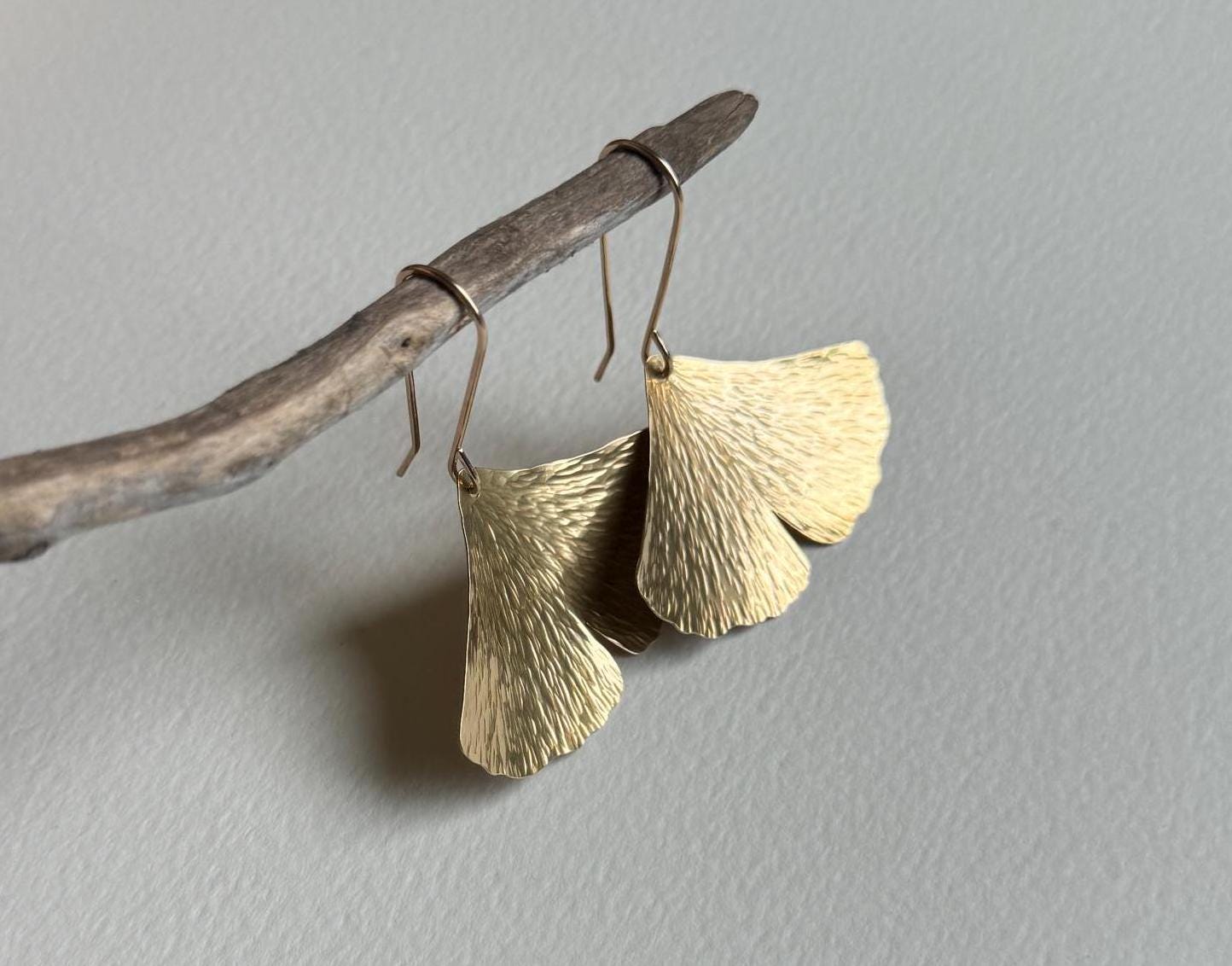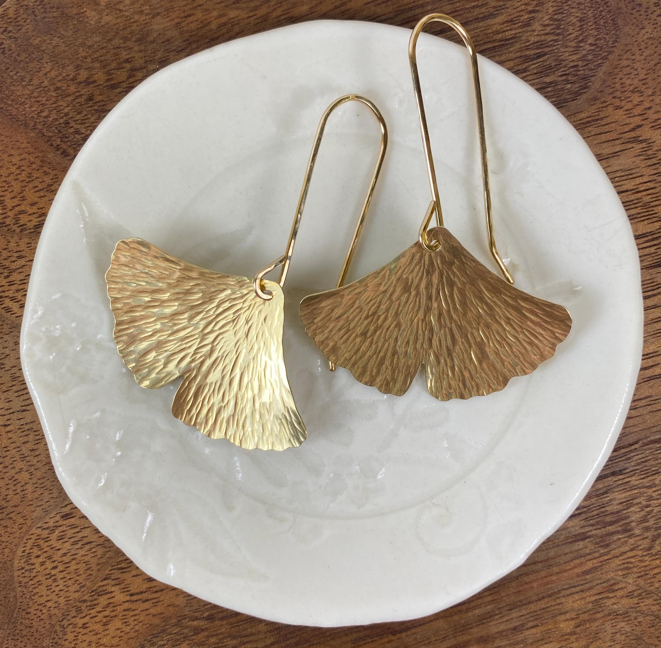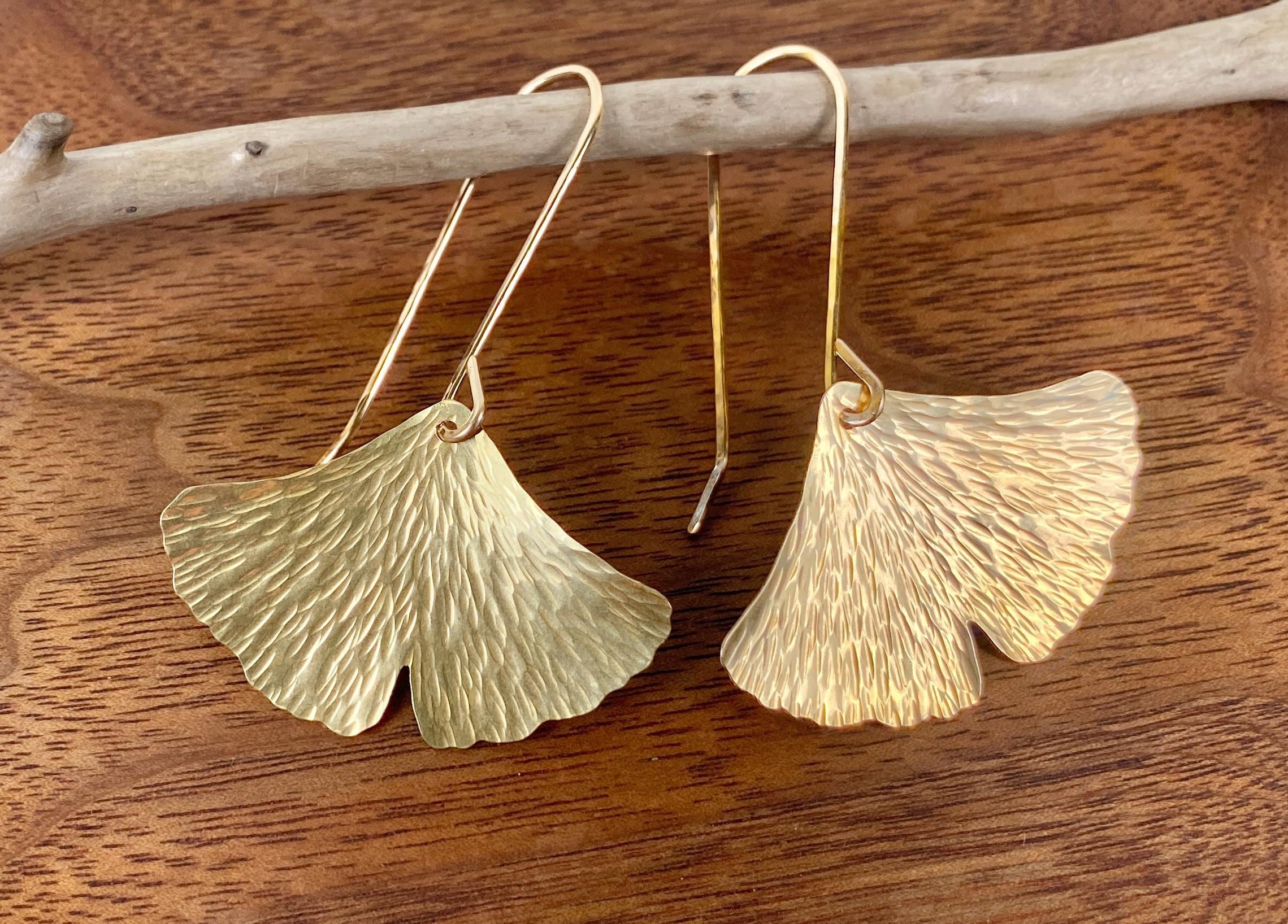 Ginkgo Leaf Earrings, Hammered Brass Earrings, Botanical Jewelry