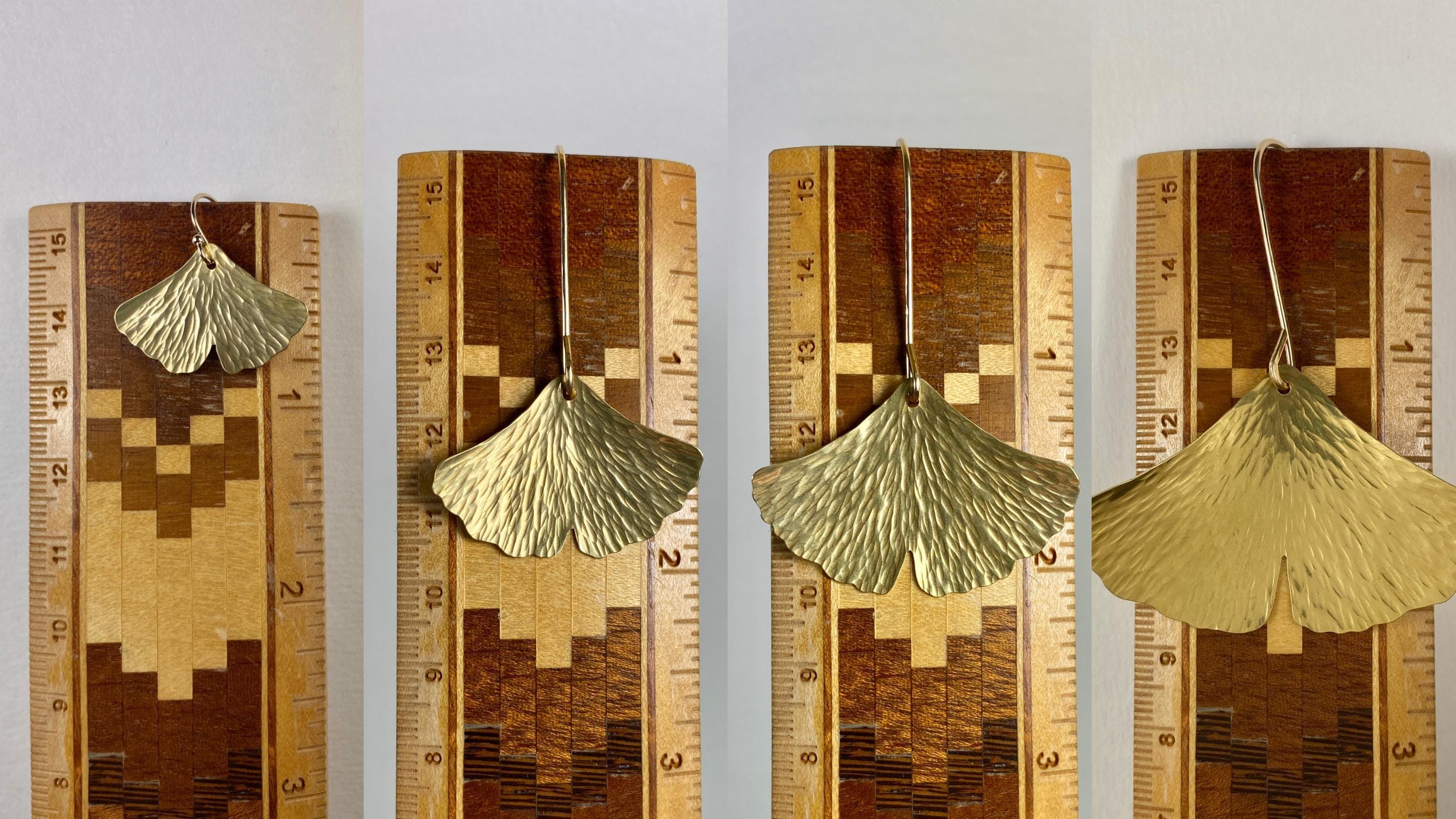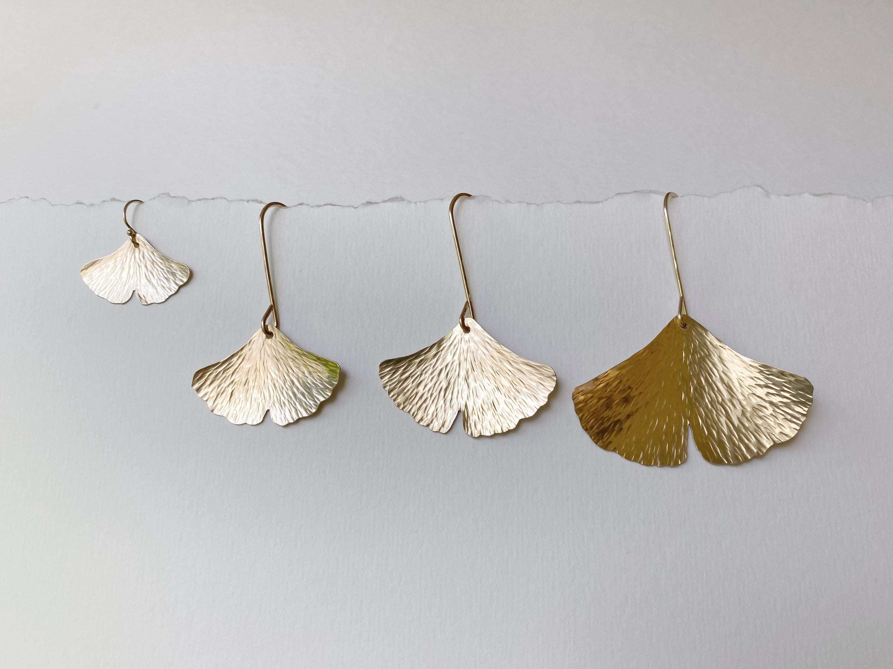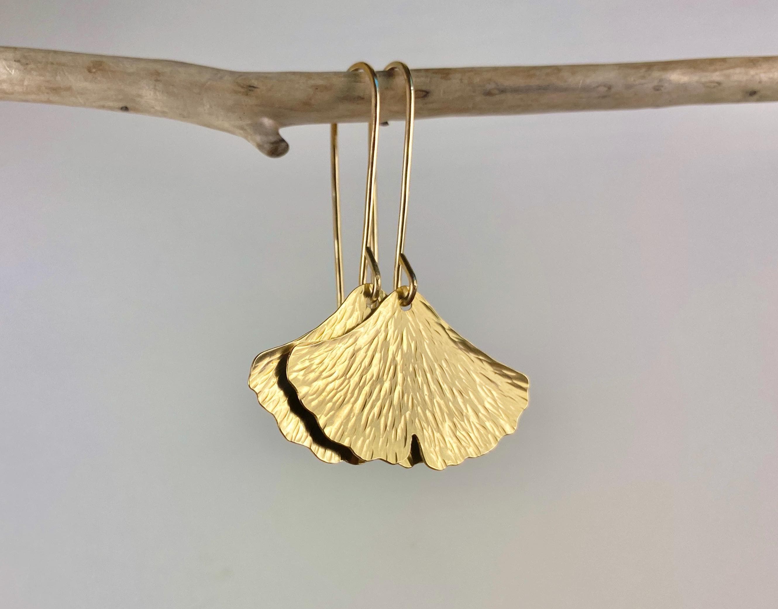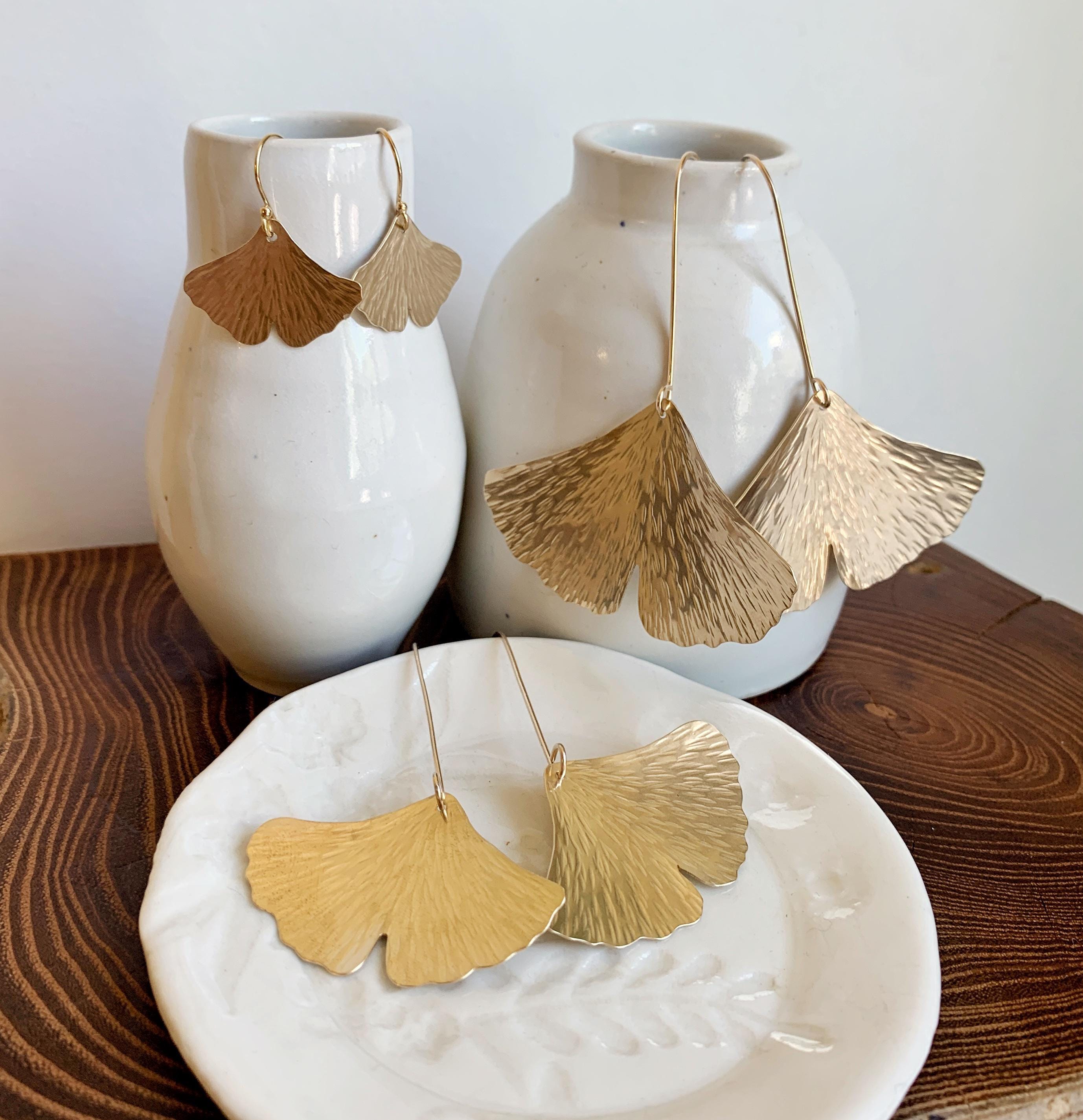 4 size options! Beautiful brass ginkgo leaves are a unique and elegant shape with a shimmery hammered finish. The leaves are hand cut and hammered, and are dangling from either short or handmade long 14k gold fill ear wires.