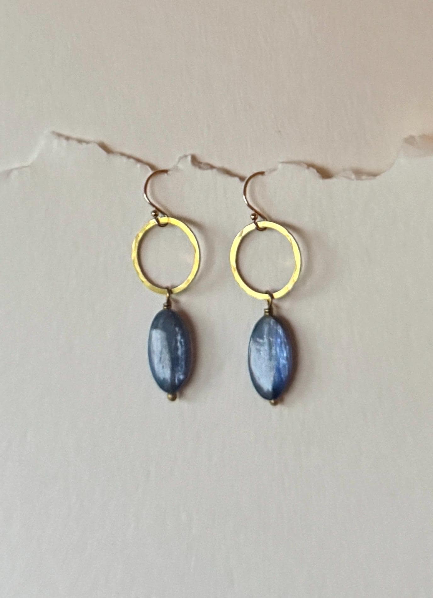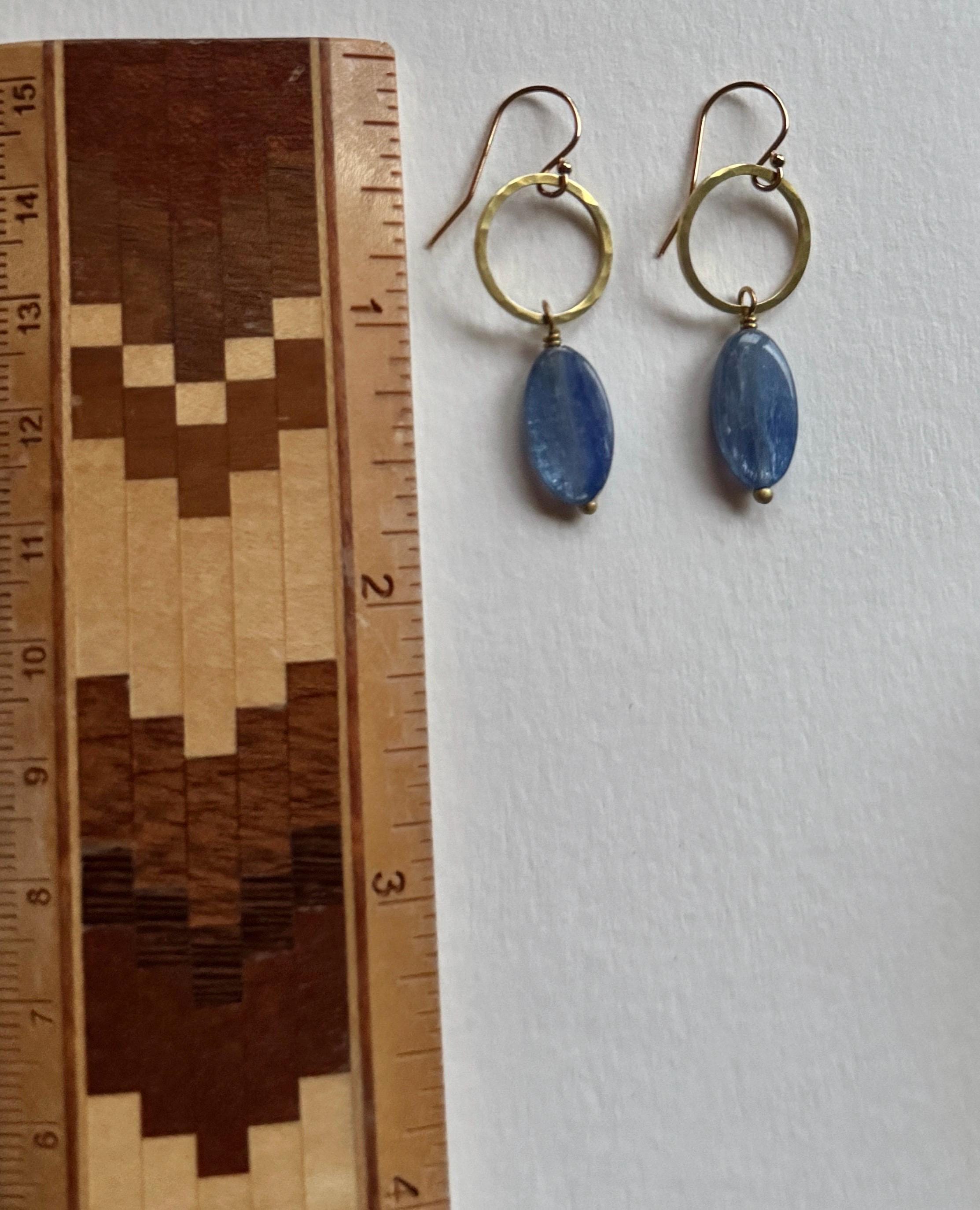 Elegant, Colorful, Simple, Brass Hammered Earrings. These are small, lightweight, everyday earrings. Natural beautiful kyanite gemstone beads are a pretty blue with pretty striations. Each pair will vary slightly as they are handmade. They dangle from 14k gold fill ear wires. Easy to wear and gift.