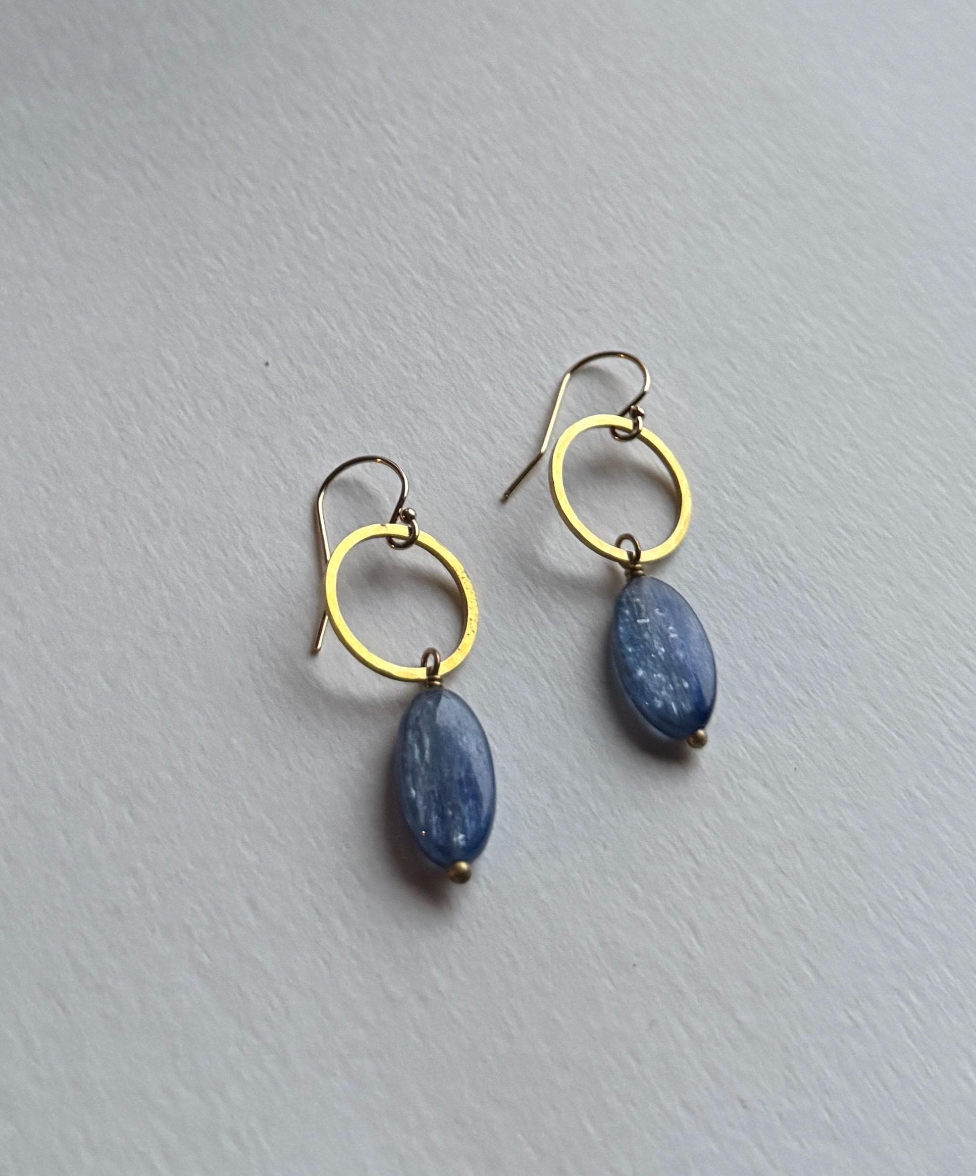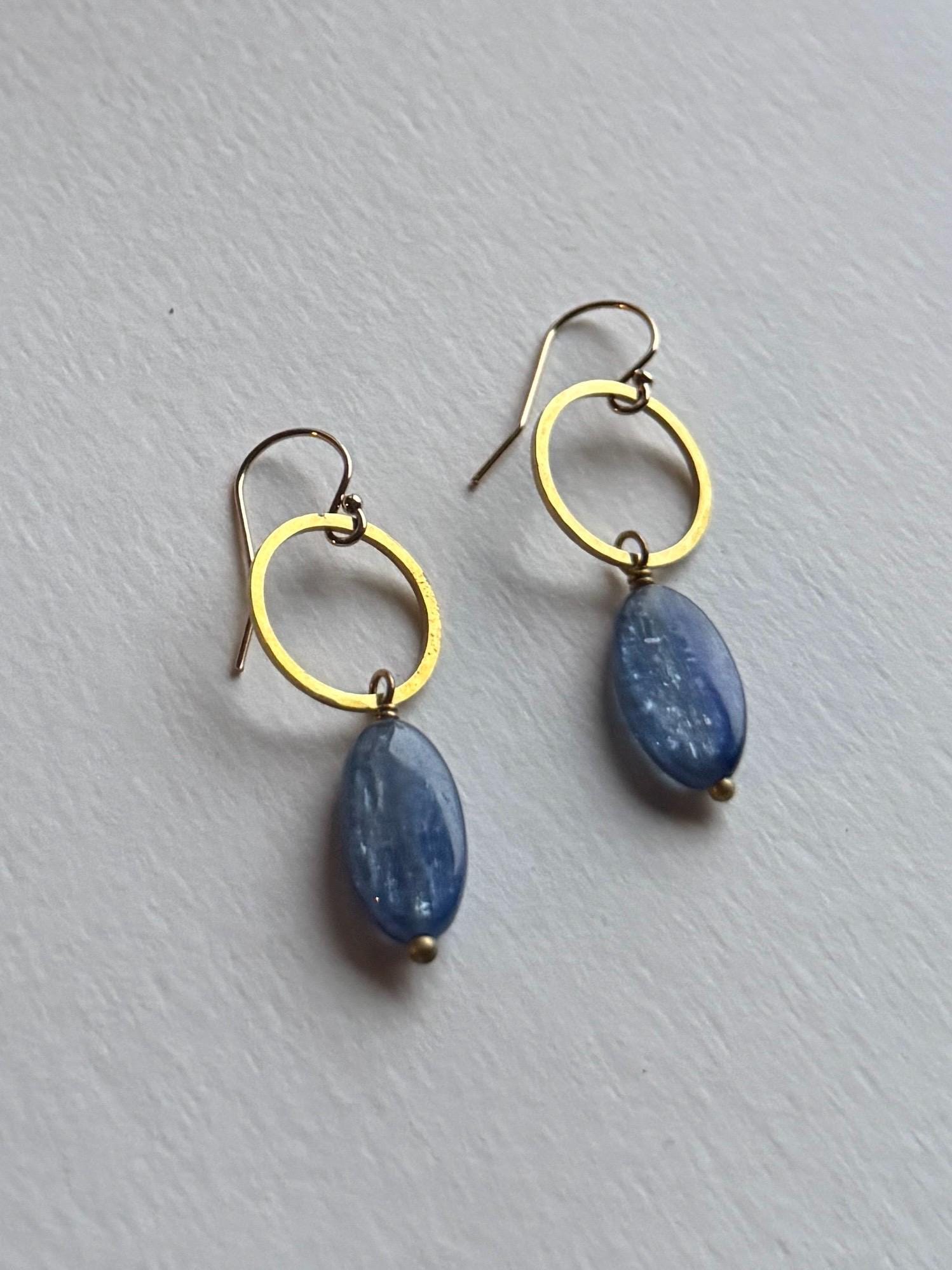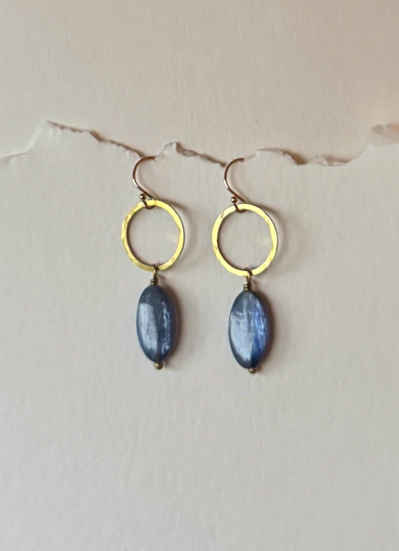 Blue Circle Earrings, Kyanite and Brass Dainty Hammered hoops, natural blue gemstones, 14k gold fill hooks.