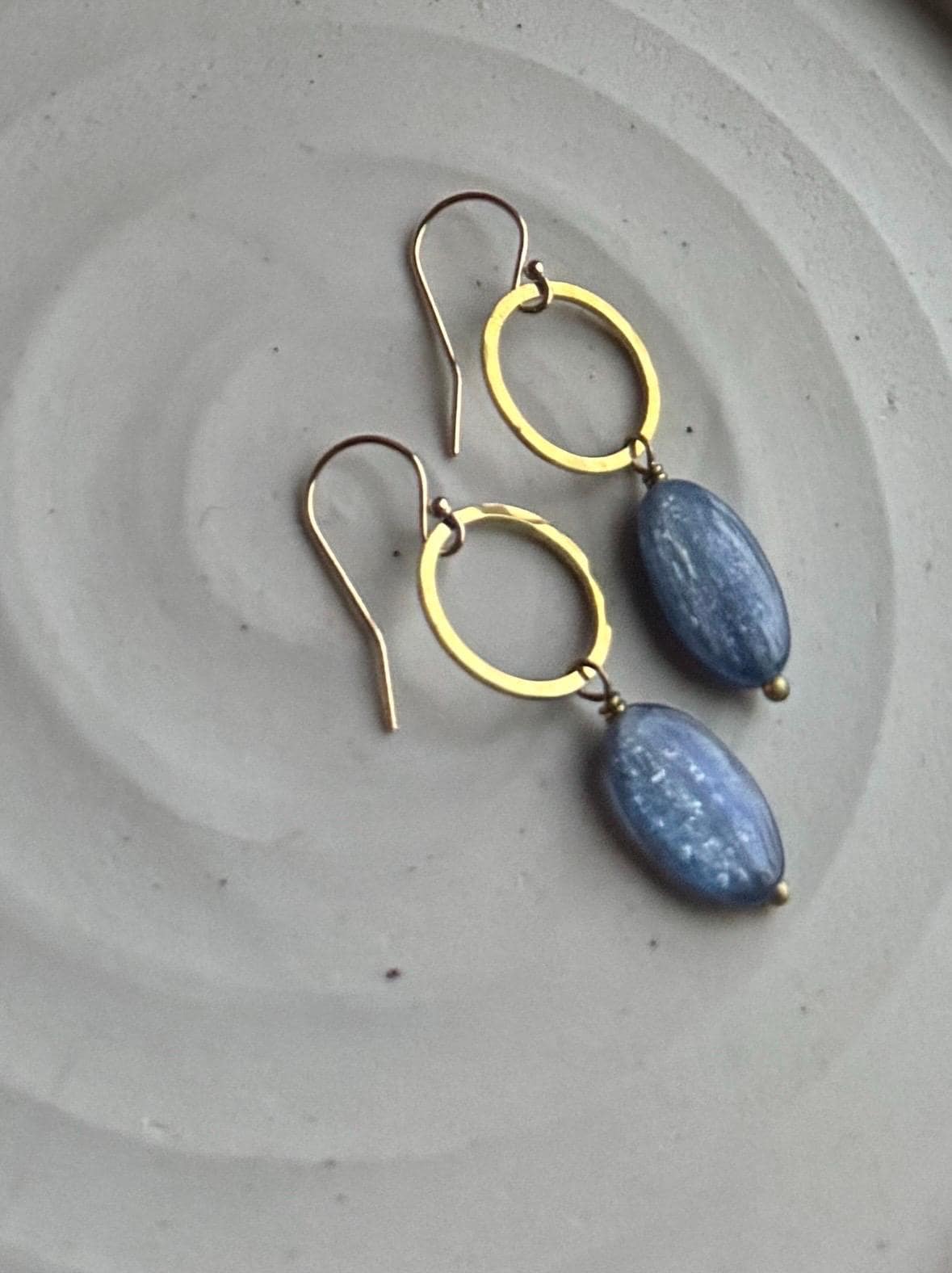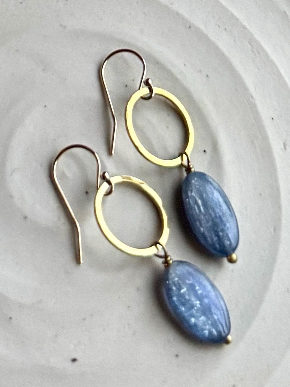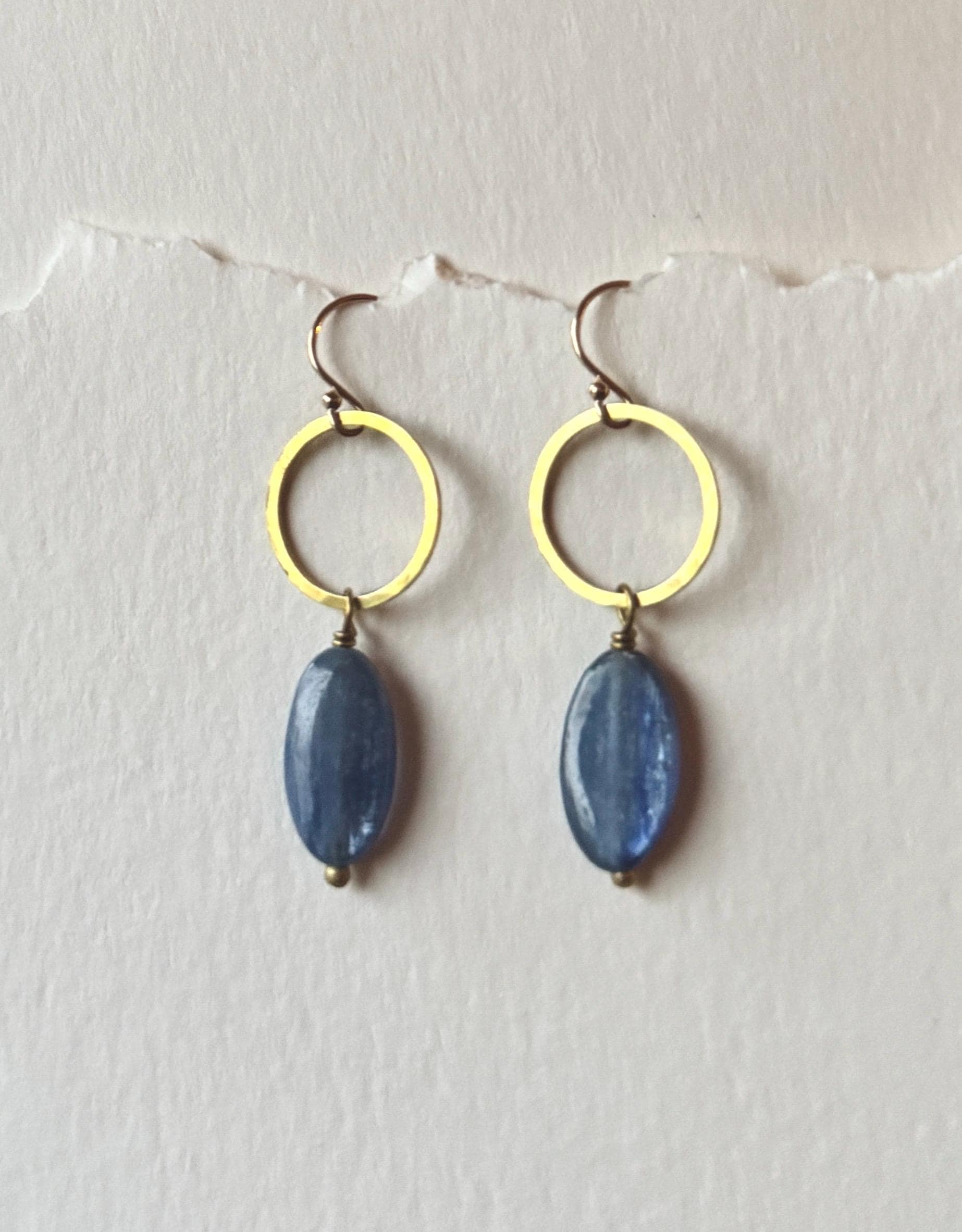 Blue Circle Earrings, Kyanite and Brass Dainty Hammered hoops, natural blue gemstones, 14k gold fill hooks.