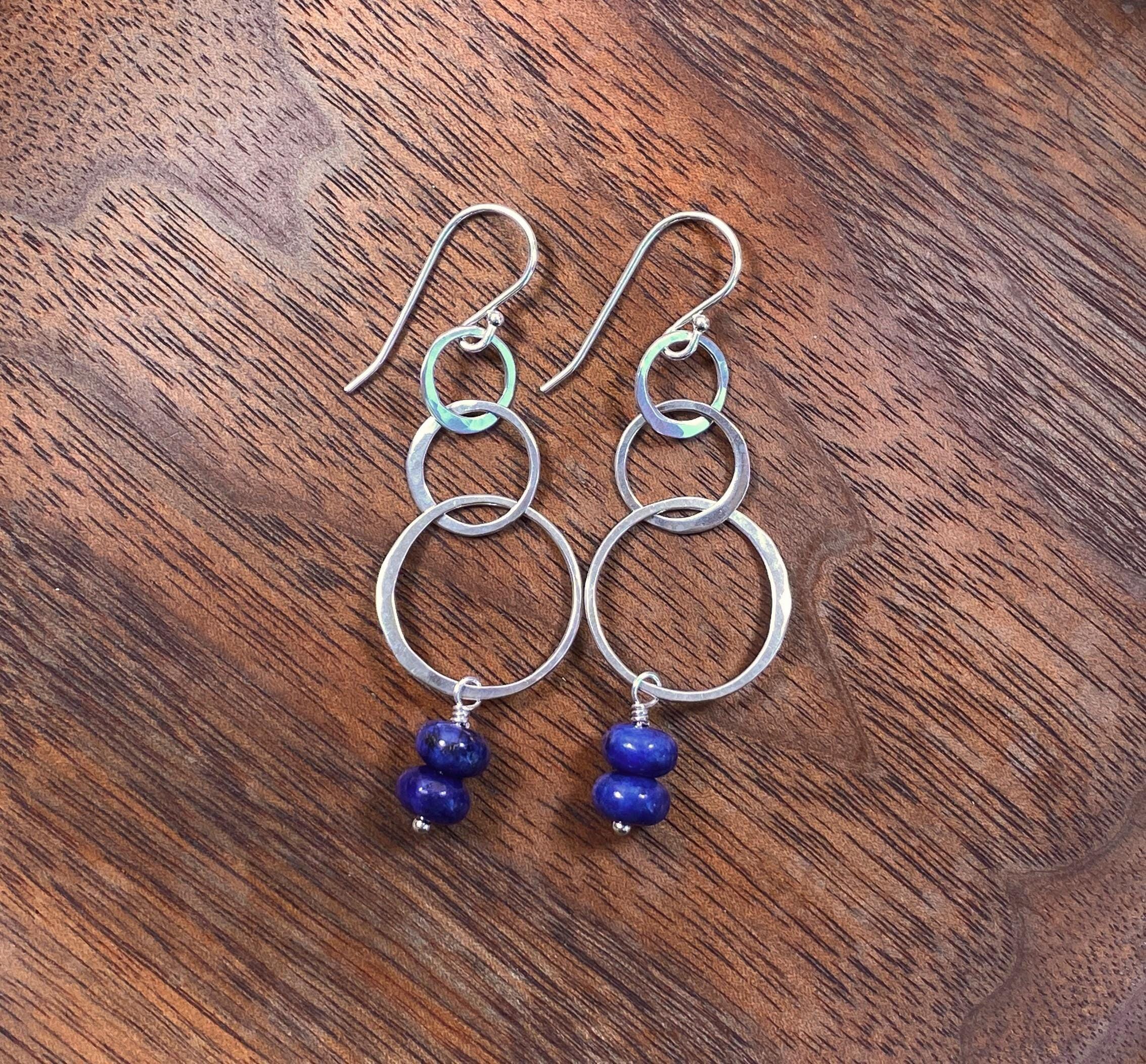 Lapis Gemstone & Sterling Silver, Pretty Hammered Silver triple Circles, Natural Blue Earrings, December Birthstone Jewelry