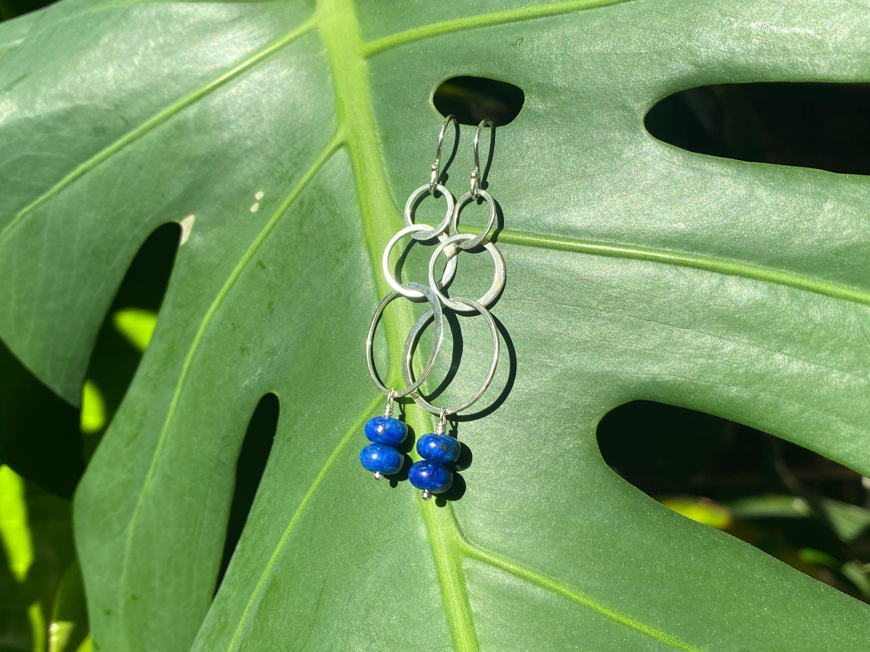 Lightly hammered solid 925 sterling silver interlocking circles earrings with beautiful, Lapis stones. Natural Lapis is the birthstone of December and a great gift. Elegant, Simple, silver hammered earrings. These dangle from sterling silver 925 hooks. Easy to wear and gift.