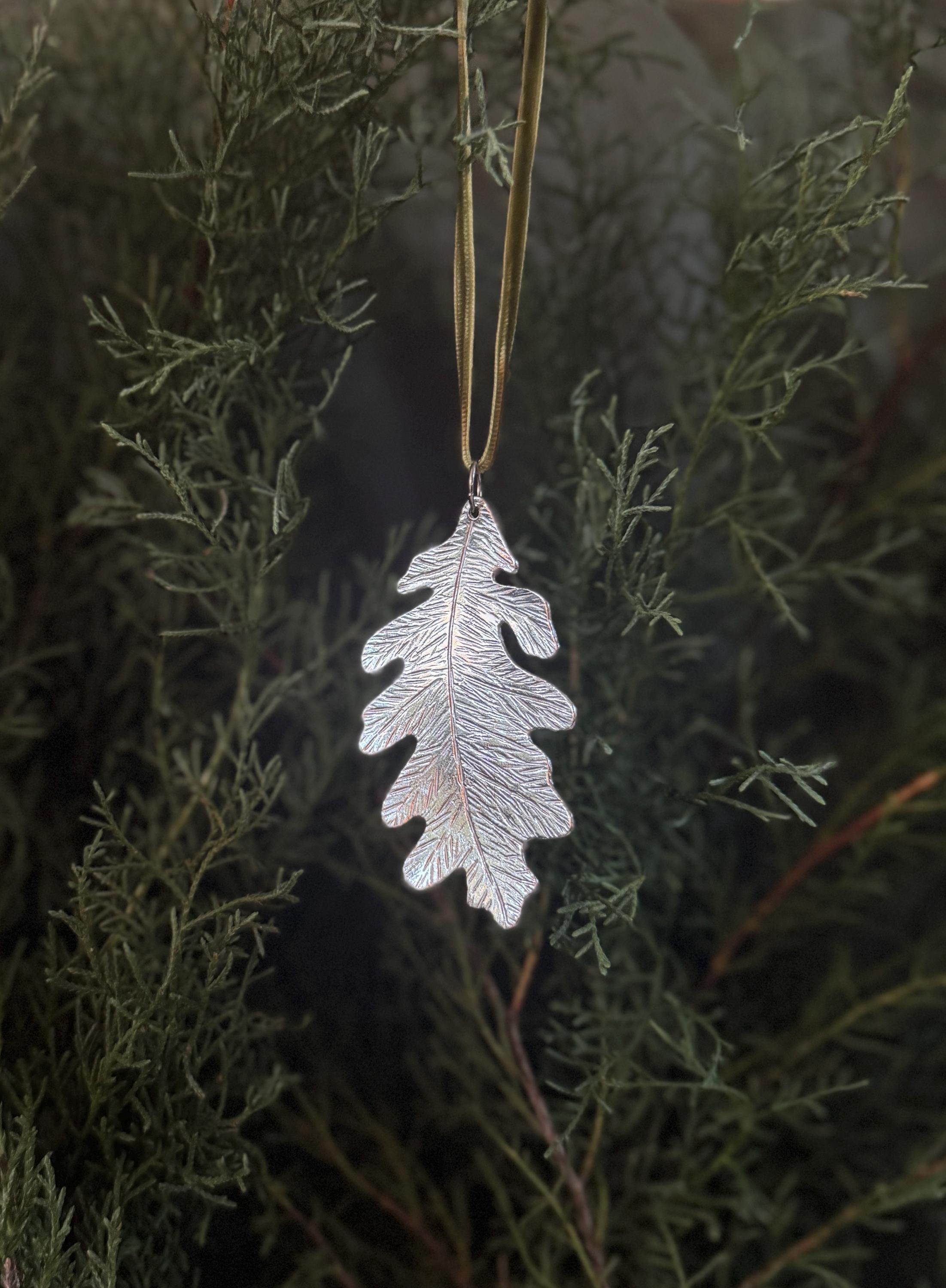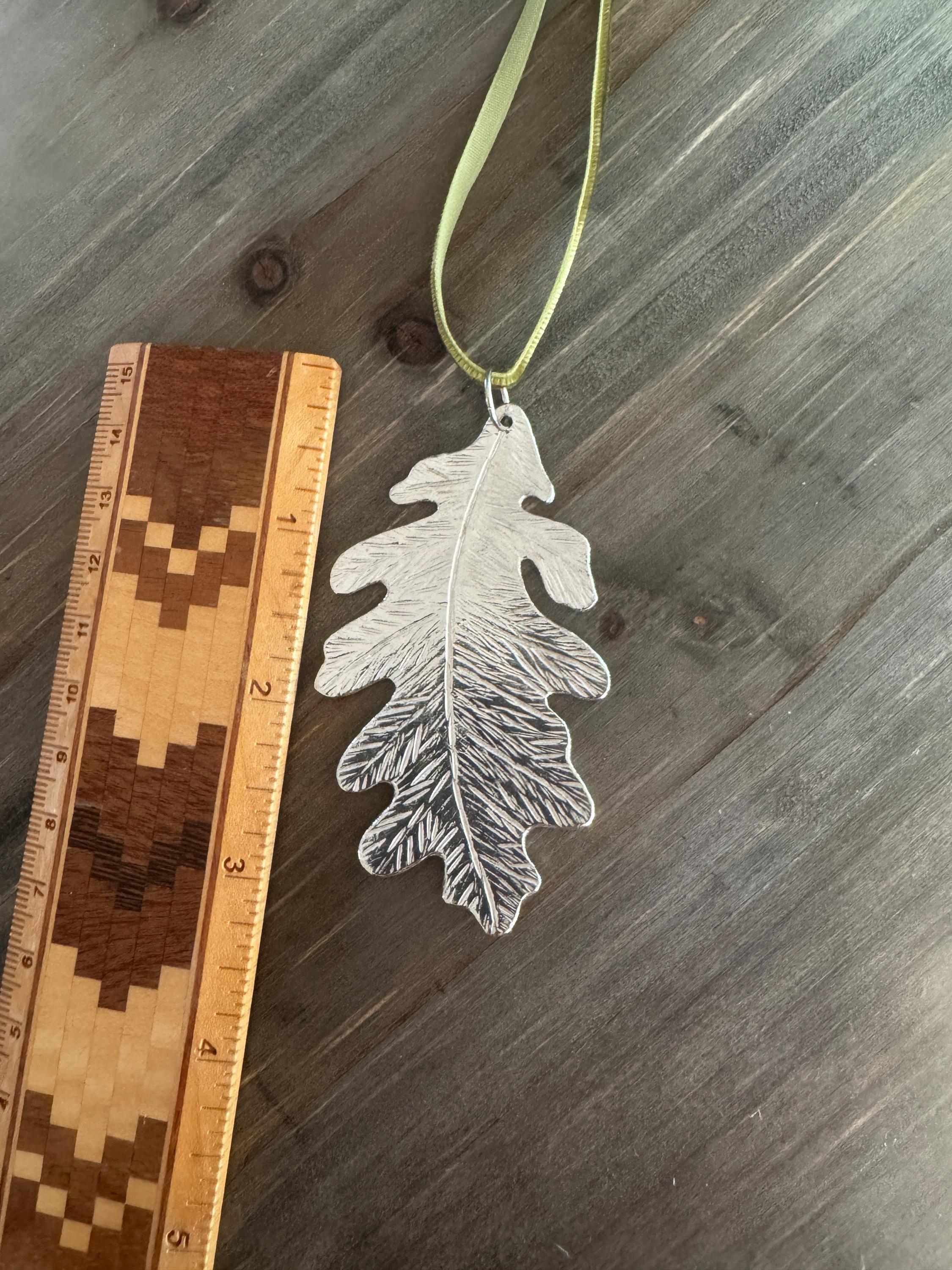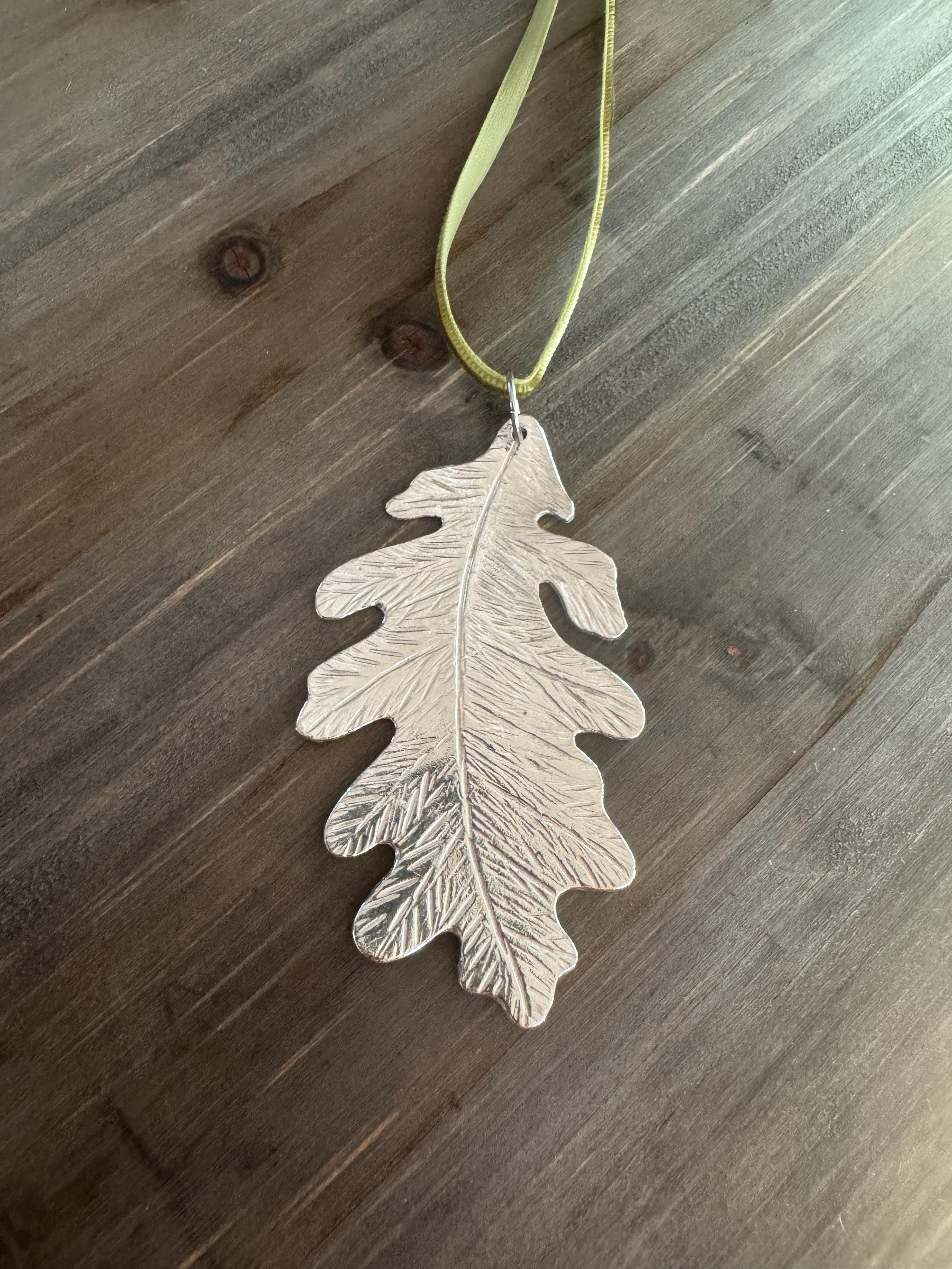 Handmade Oak Leaf Ornament. Solid Pewter, shiny silver in color.