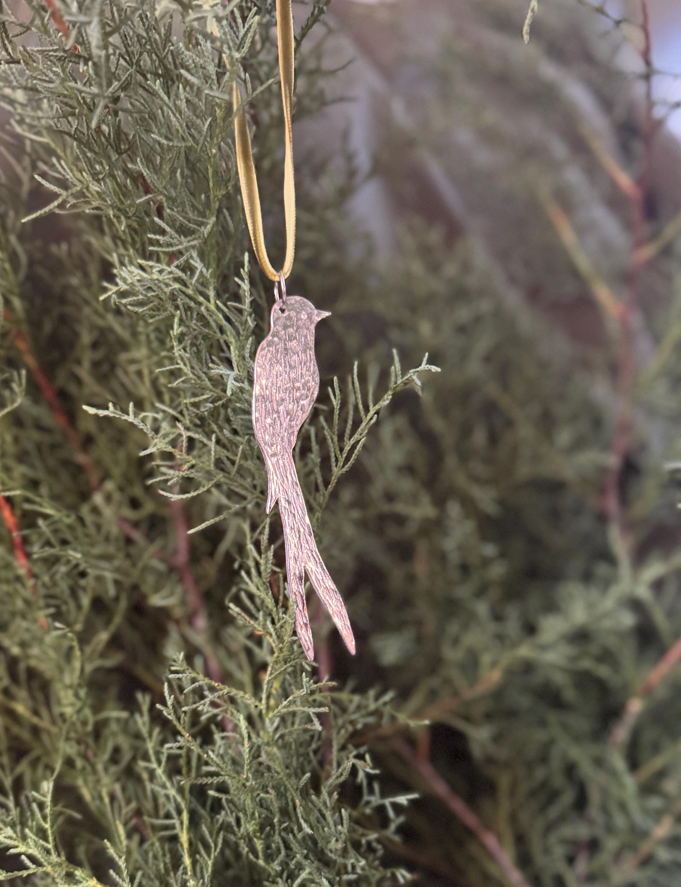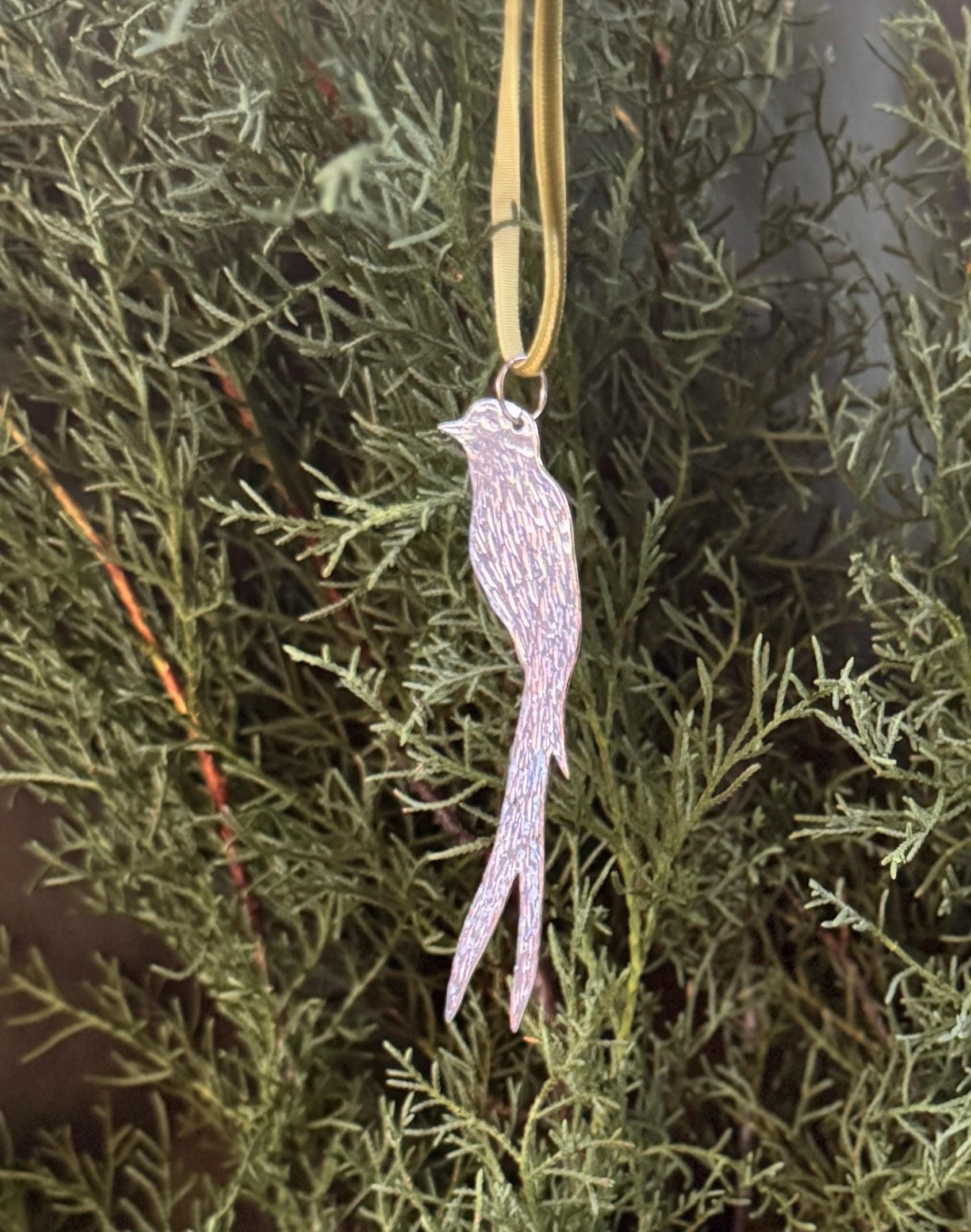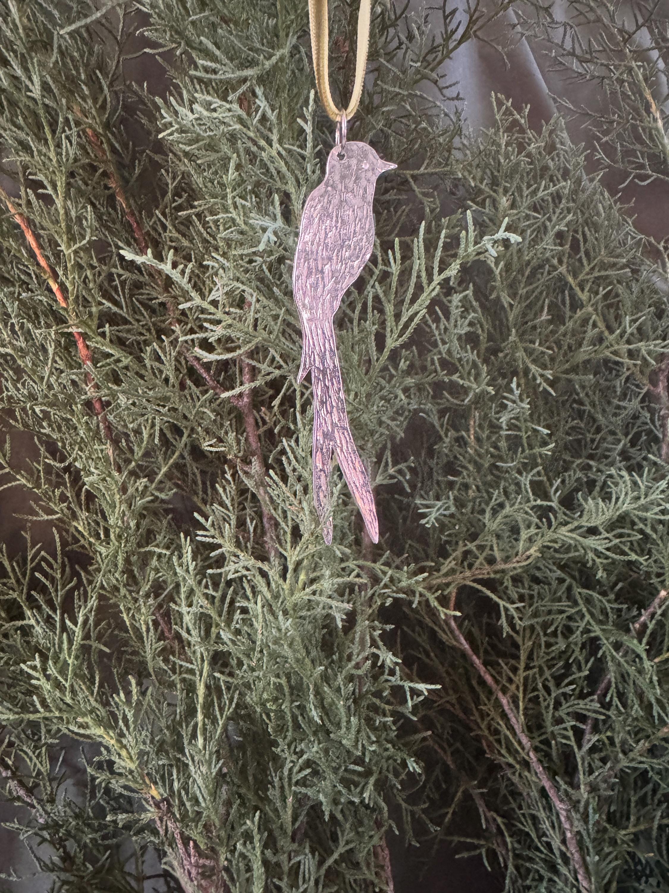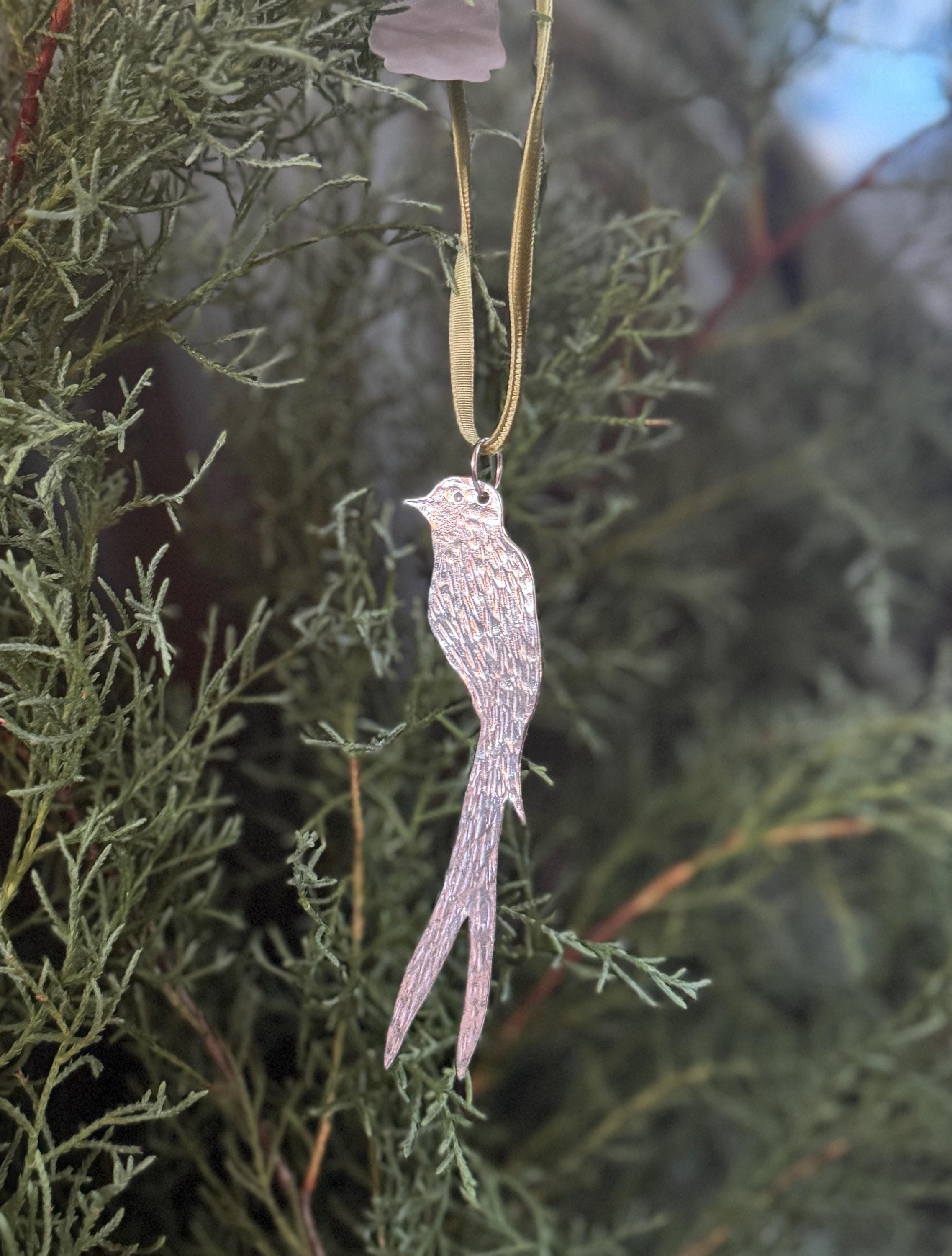 Handmade Elegant Bird Ornament. Solid Pewter, shiny silver in color.