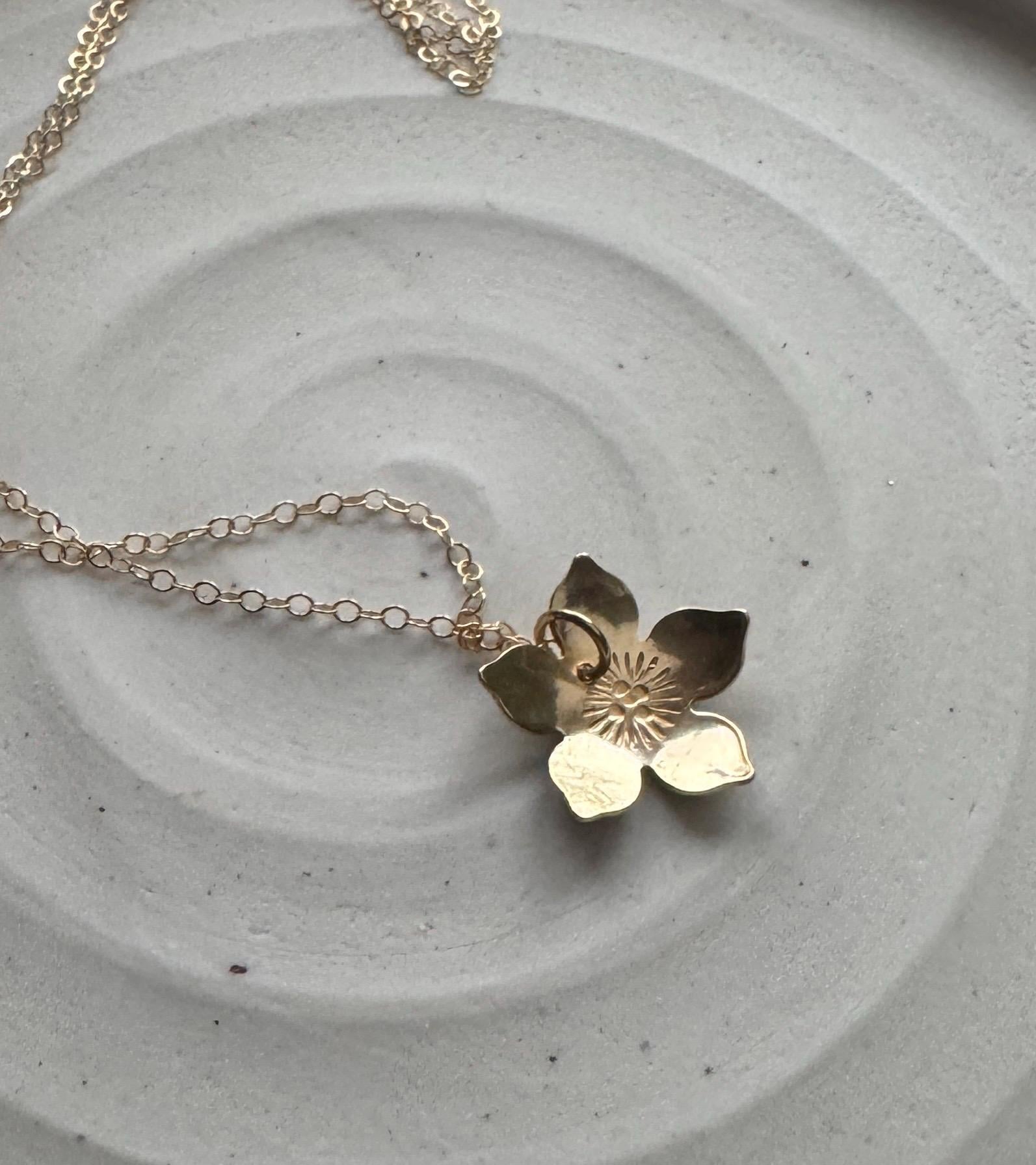 A delicate 14k yellow gold fill chain with a pretty Brass, hand stamped, domed and hammered flower. There are two size of flower options. Each Necklace is handmade and may vary slightly.