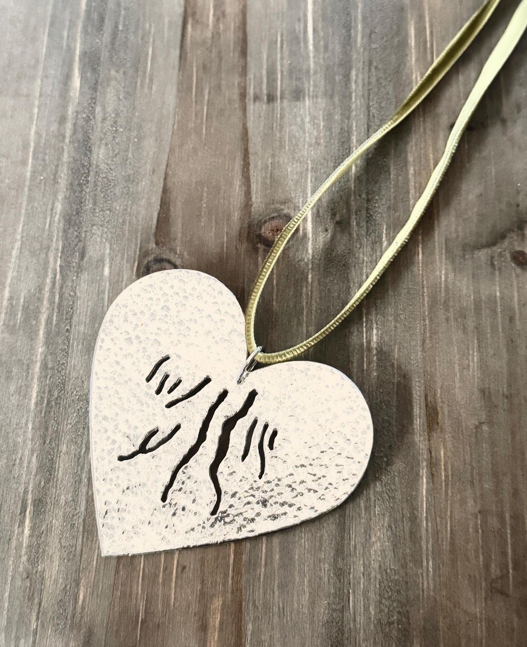 A Pretty solid pewter heart with the silhouette of the fingerlakes cut out inside. It hangs from a pretty green velvet ribbon. Each side is textured and hand tooled too add detail to Star Shape. These are handmade and each will vary slightly.