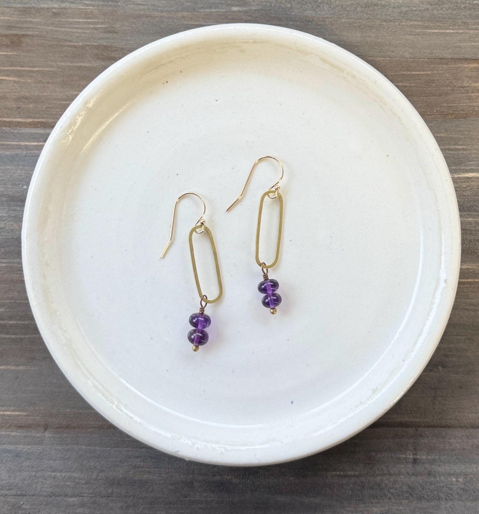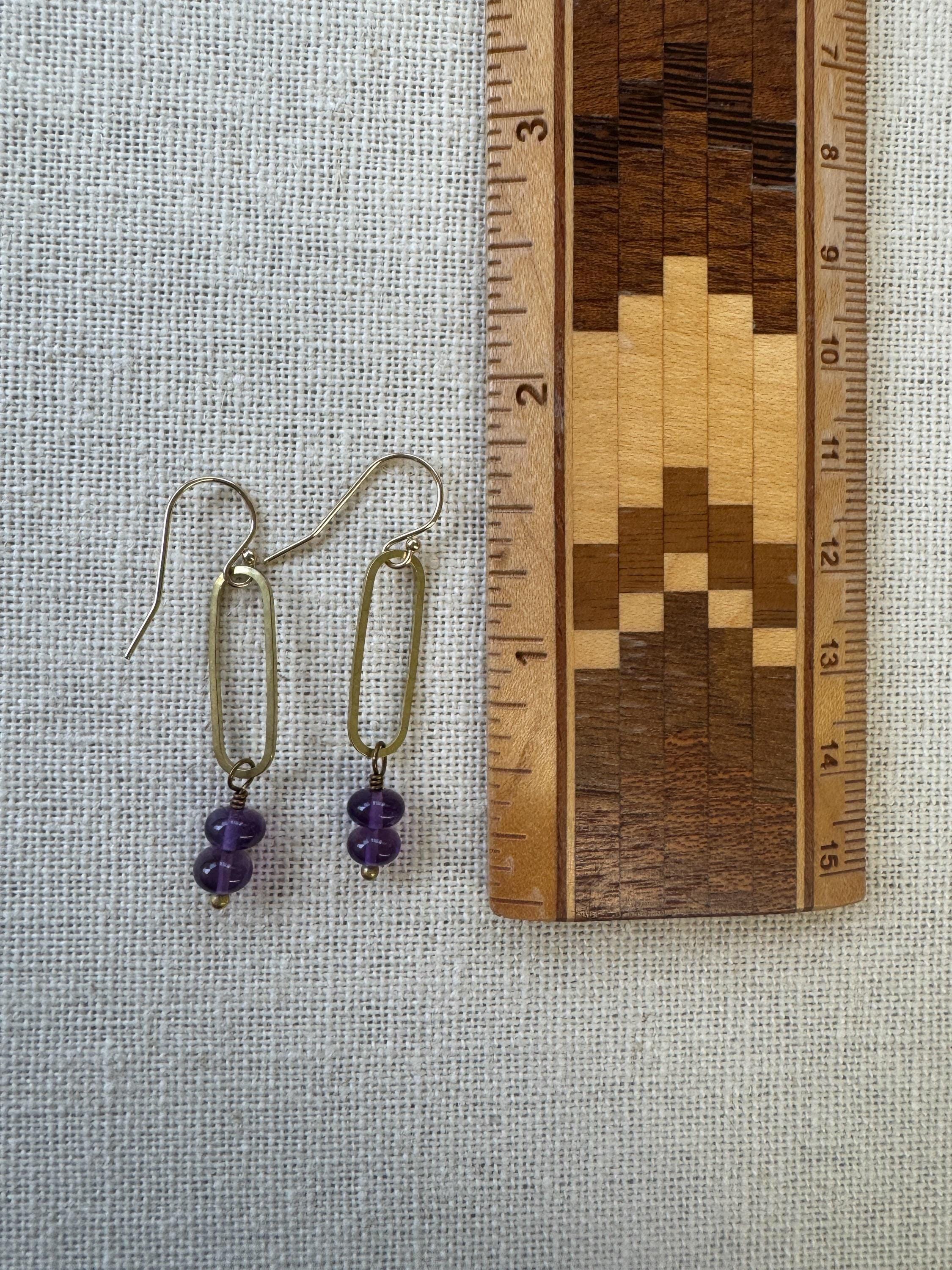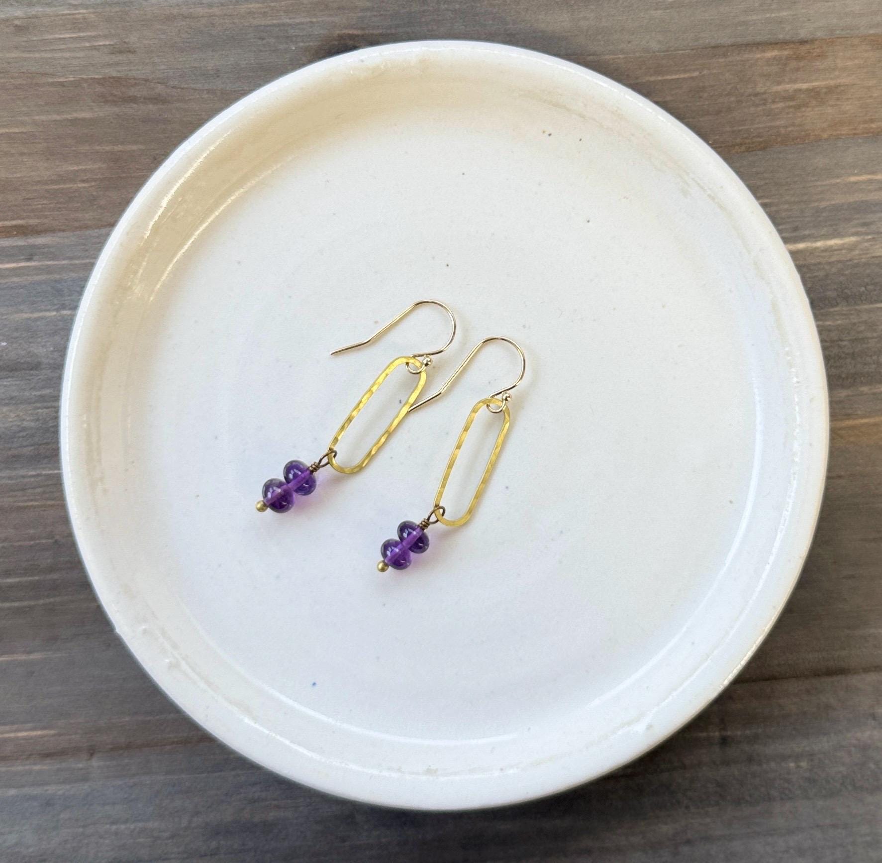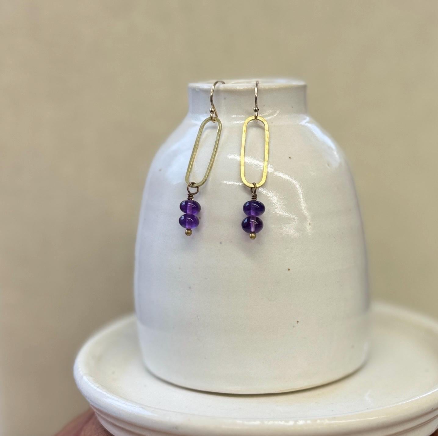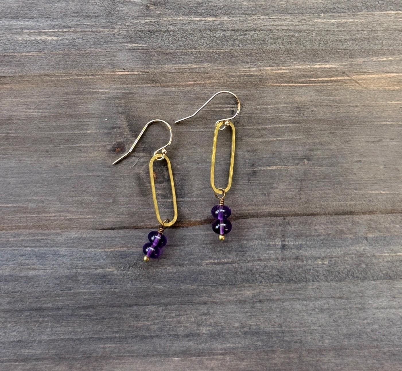 Pretty Lightly hammered brass elongated earrings with pretty purple Amethyst faceted gemstone beads. Amethyst is the birthstone of February, perfect for a February birthday gift. Elegant, Simple, Brass Hammered Earrings. These dangle from 14k gold-fill hooks. Easy to wear and gift.