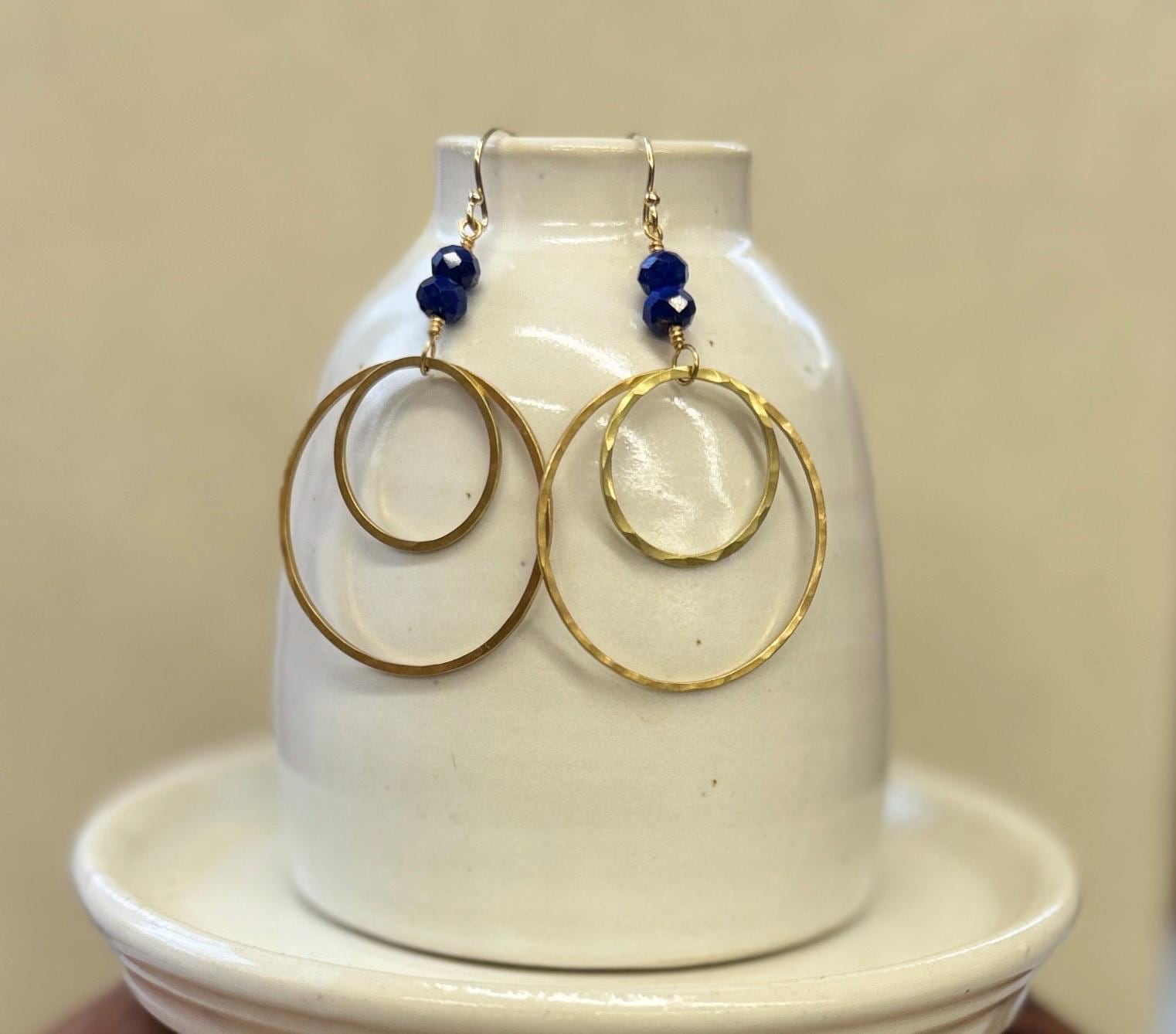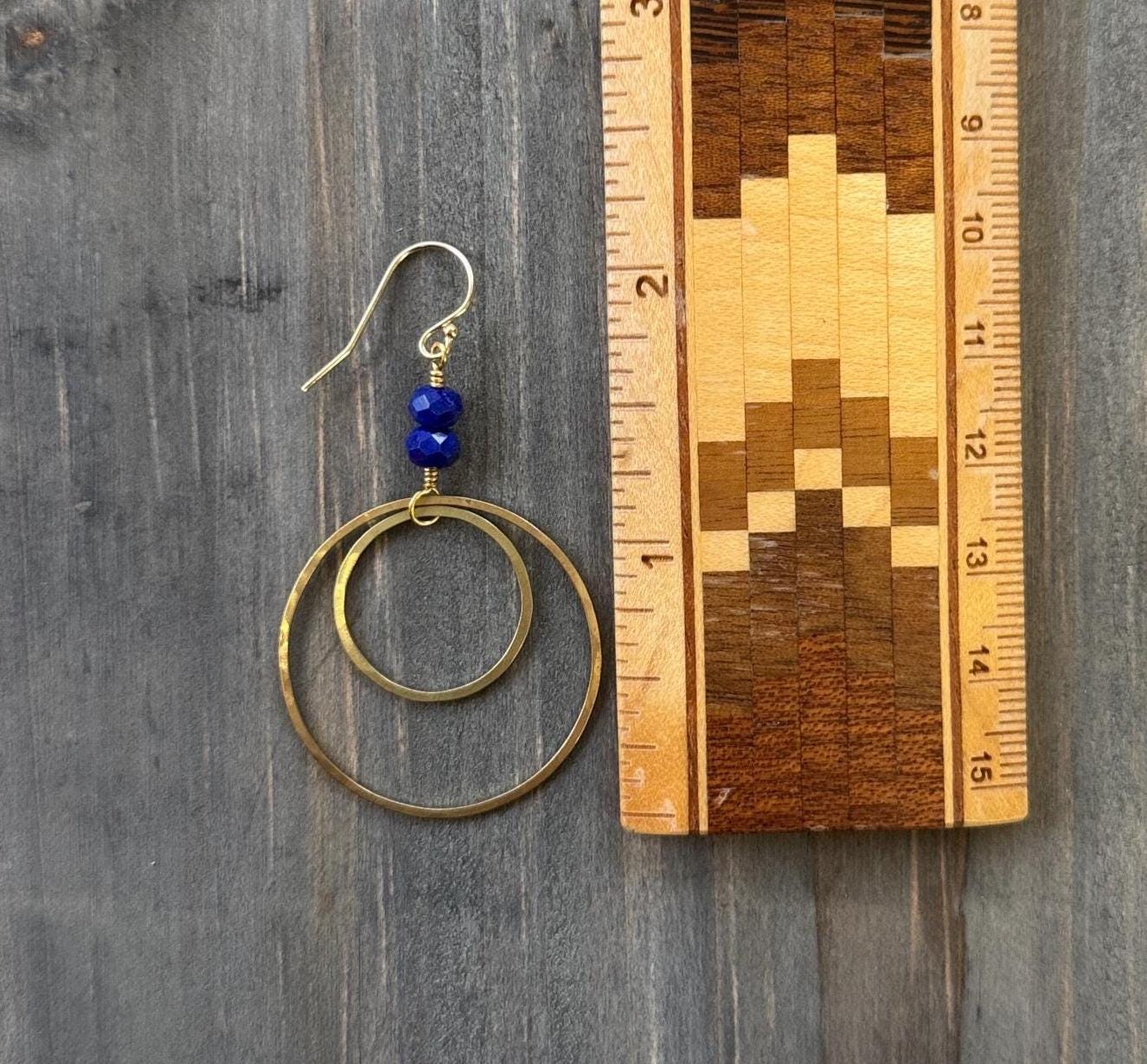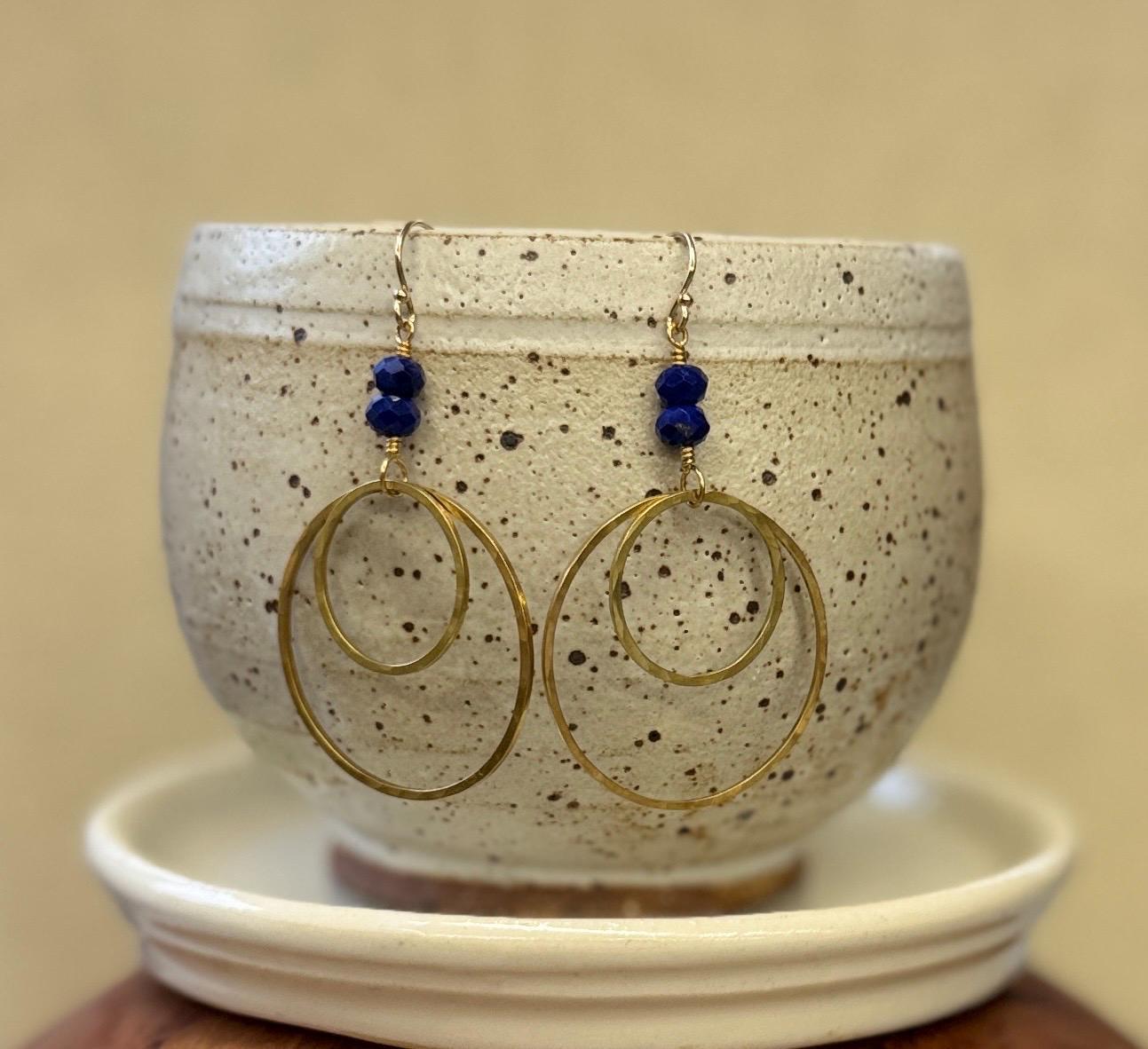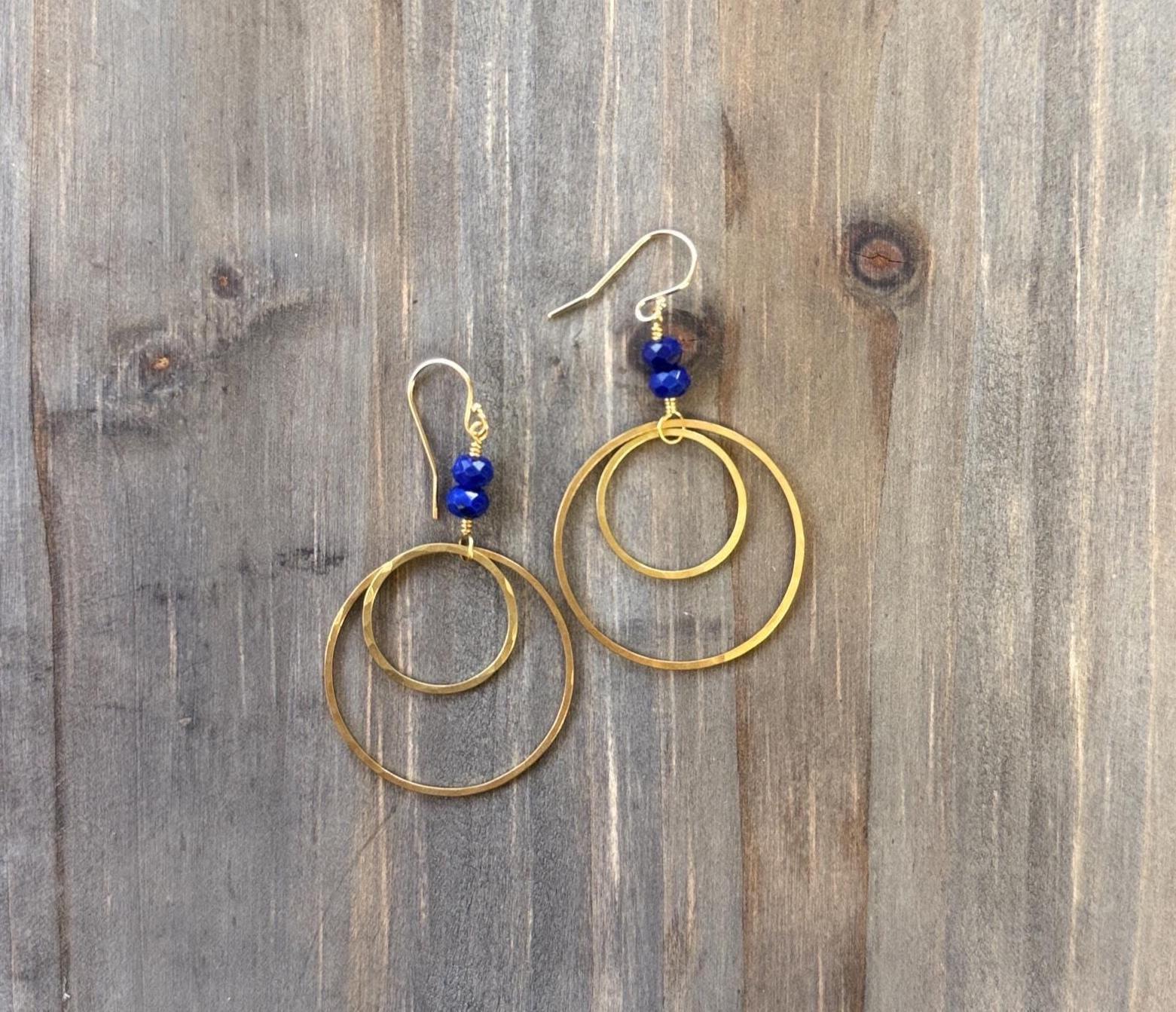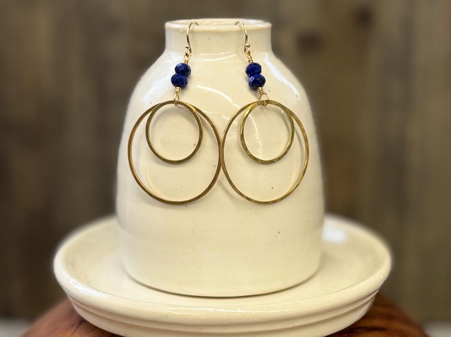 Lapis, Brass & Gold Double Hoop Earrings, December Birthstone, 14k Gold Fill